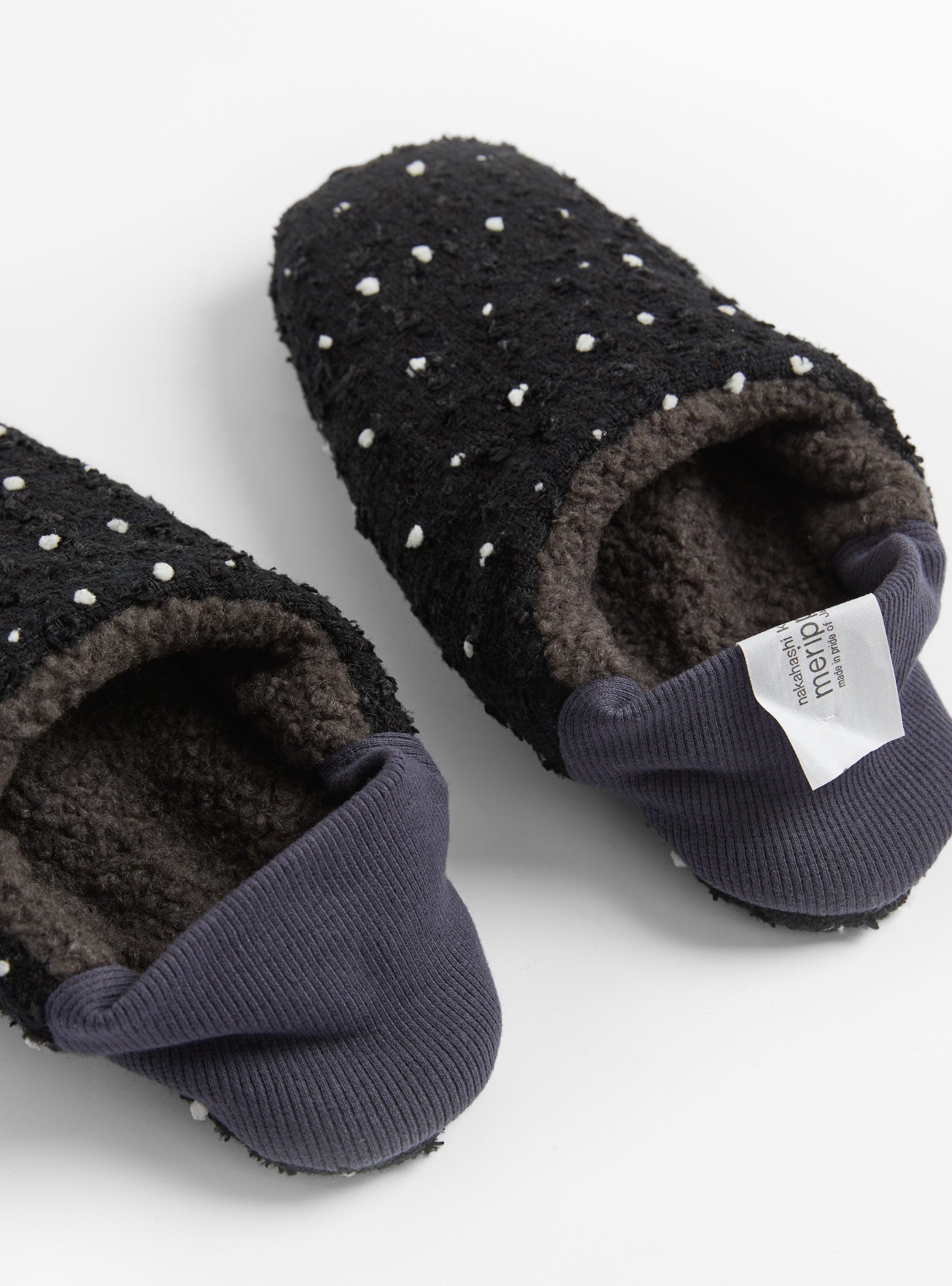 Made in Japan from an ultra-soft cotton blend, these Dot Tweed x Sheep Boa Grey slippers from Merippa have collapsible heels for easy wear around the house. They are reversible and packable.