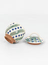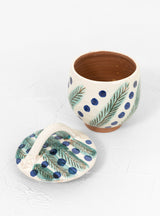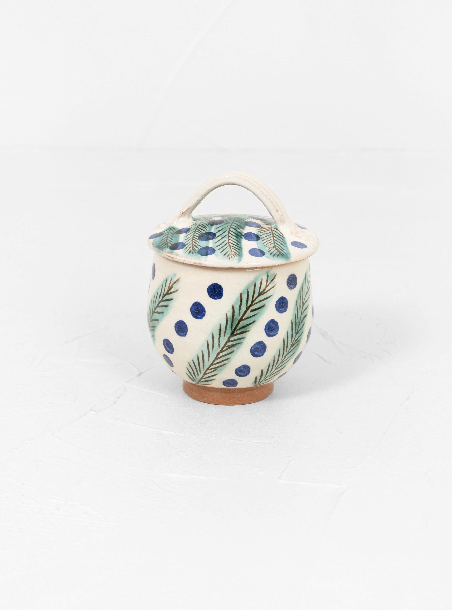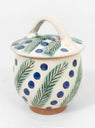 The Dotty Vine Sugar Jar from Anut Cairo is hand-crafted and hand-painted by Fayoumy potters in Egypt. The sugar jar features a removable top.
