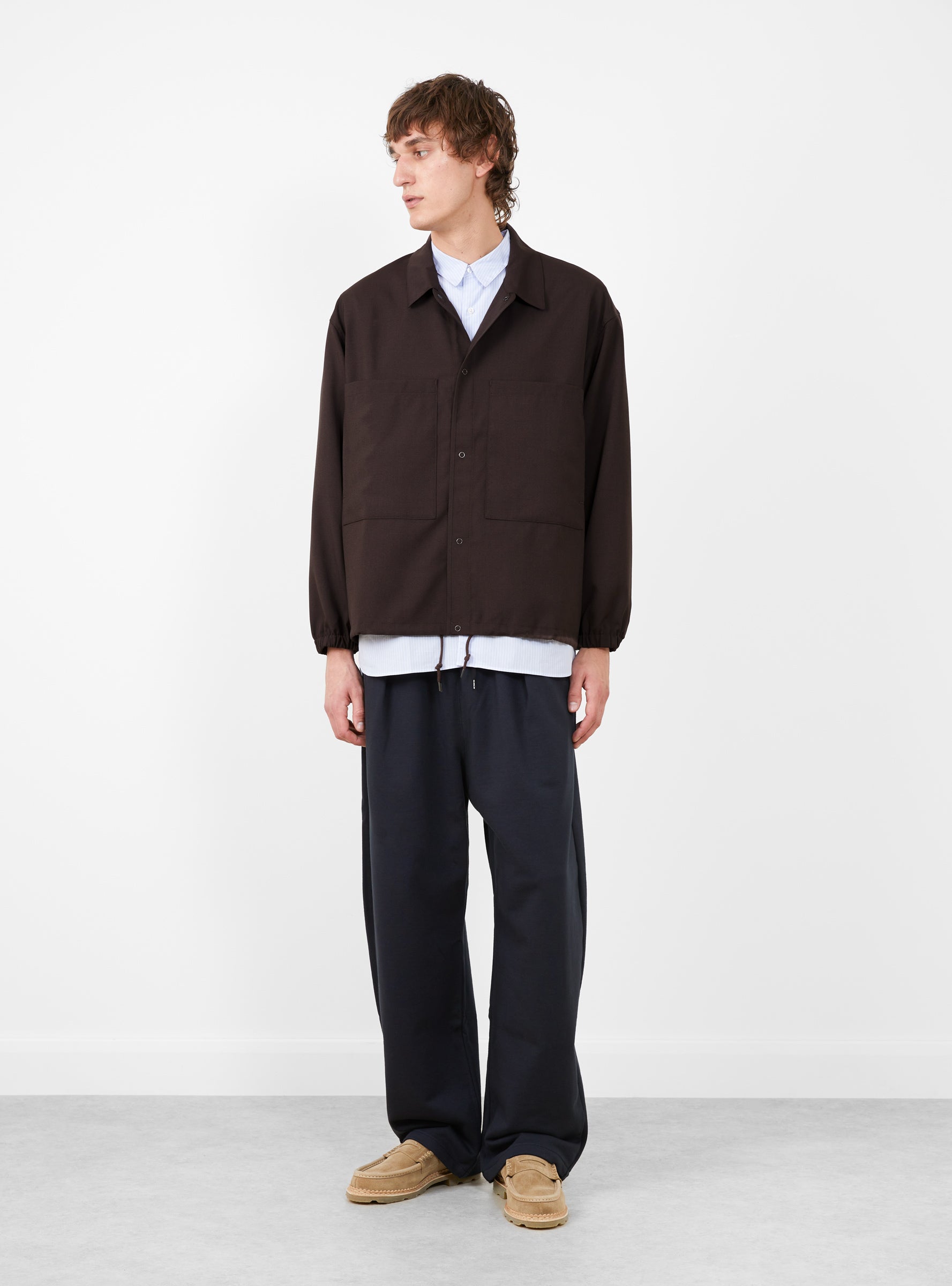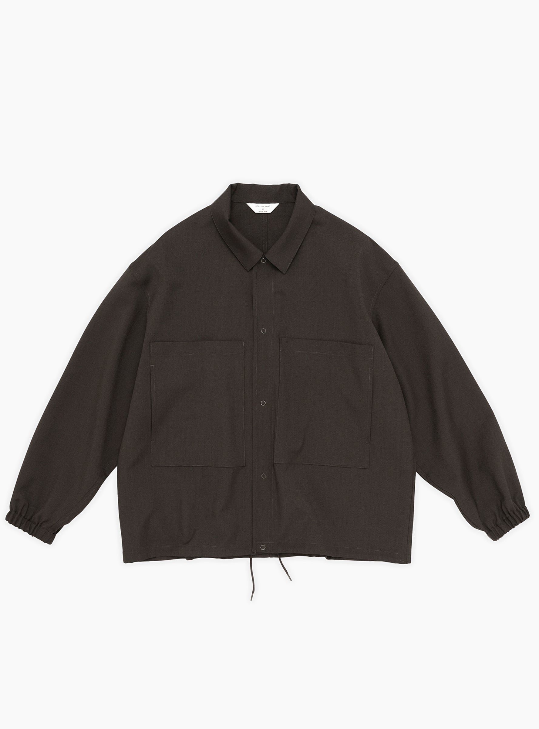 The Double Pocket Shirt Jacket Dark Brown from Still By Hand arrives in a soft, slightly stretchy blend of polyester, wool, and mohair, offering comfort with a clean finish. The jacket features a structured collar, piped front lines, and a snap button closure. Two generously sized two-way patch pockets sit at the front, while elasticated cuffs and a drawstring hem allow for subtle shape adjustment.