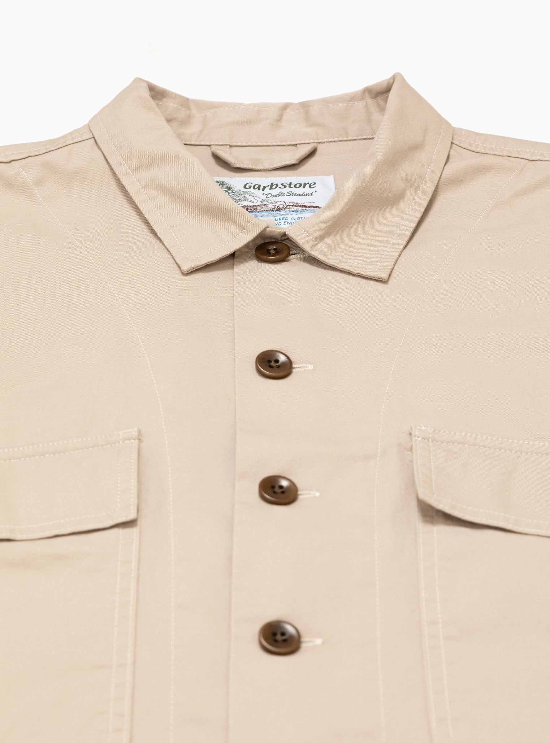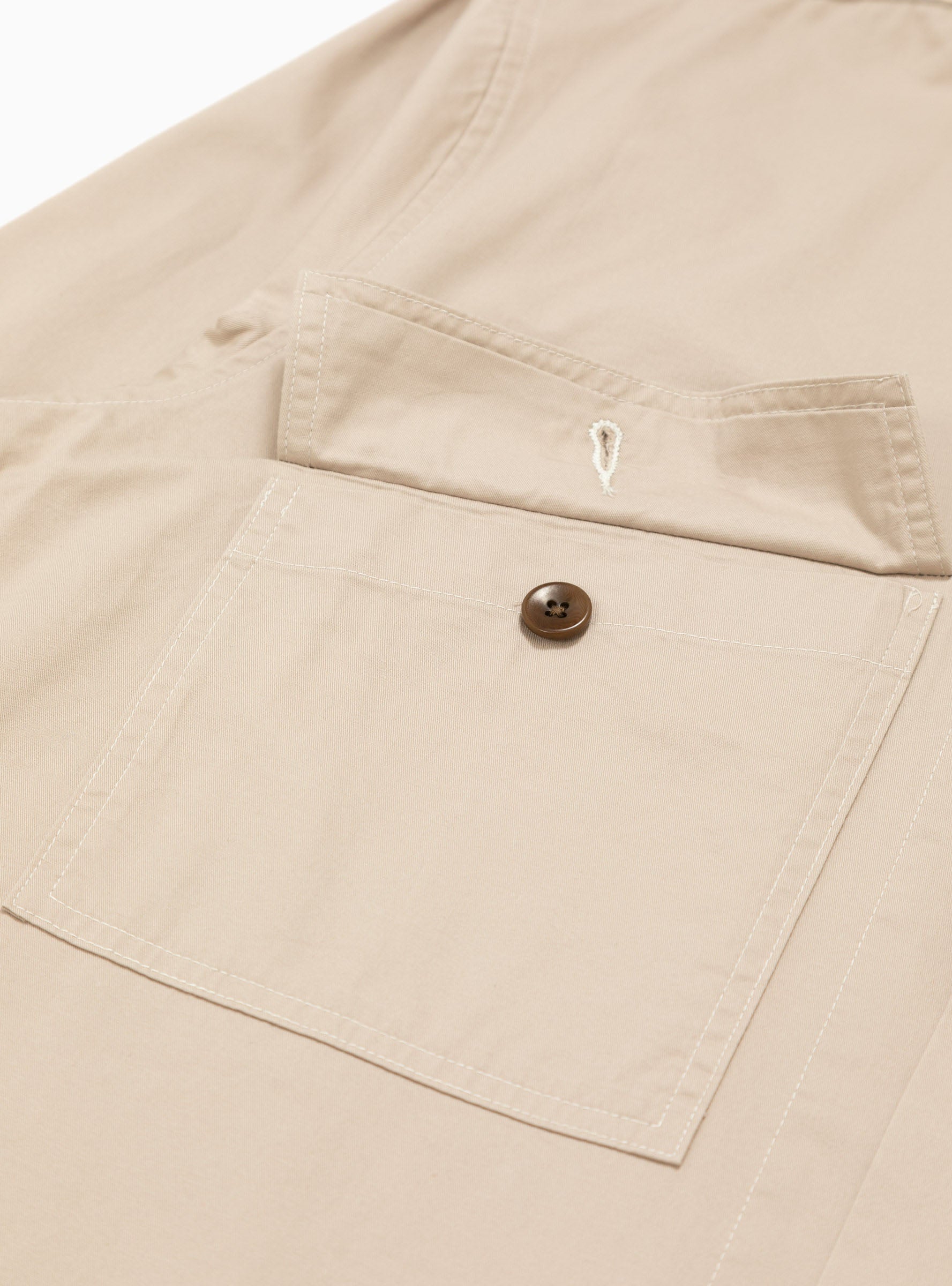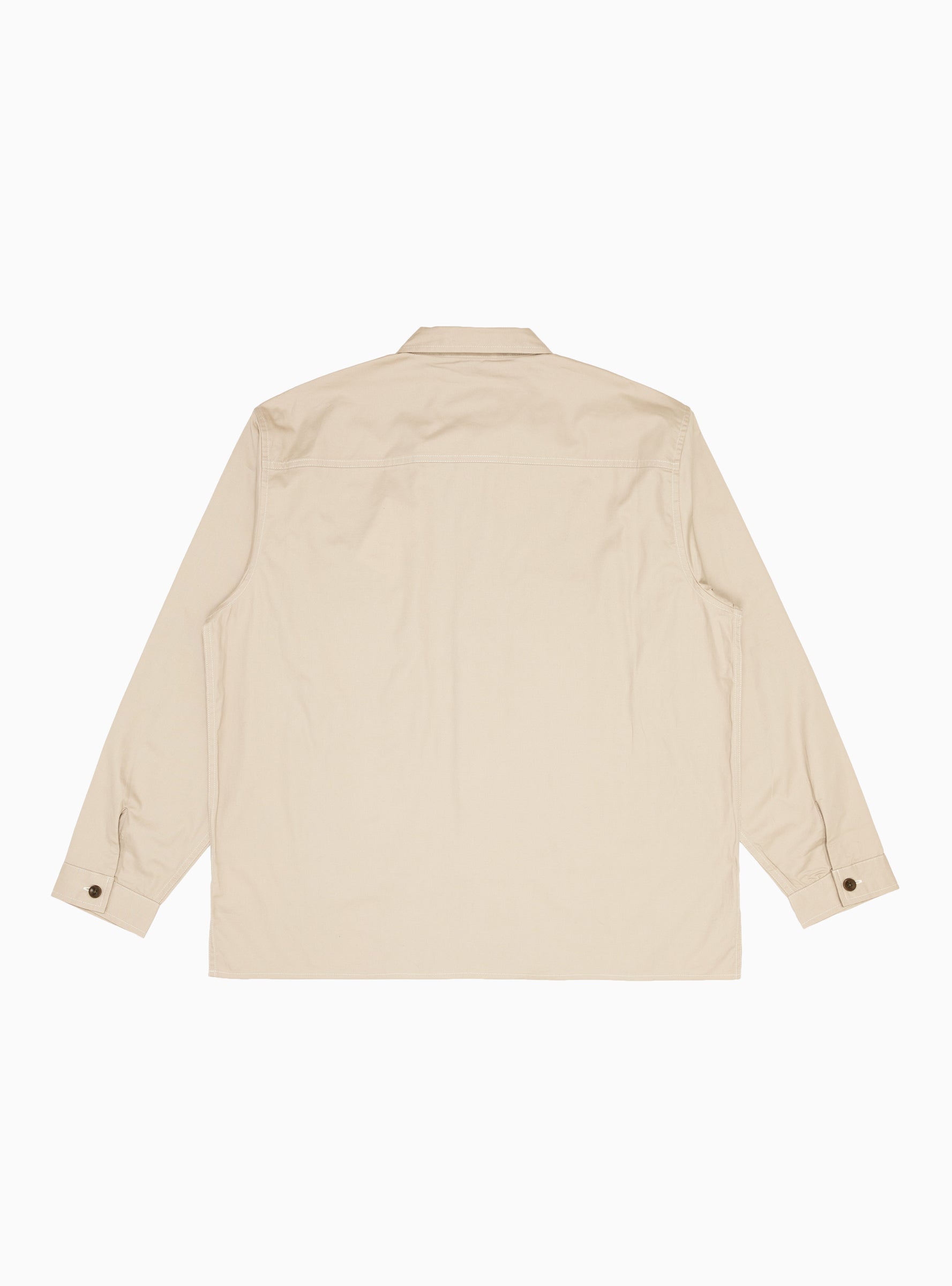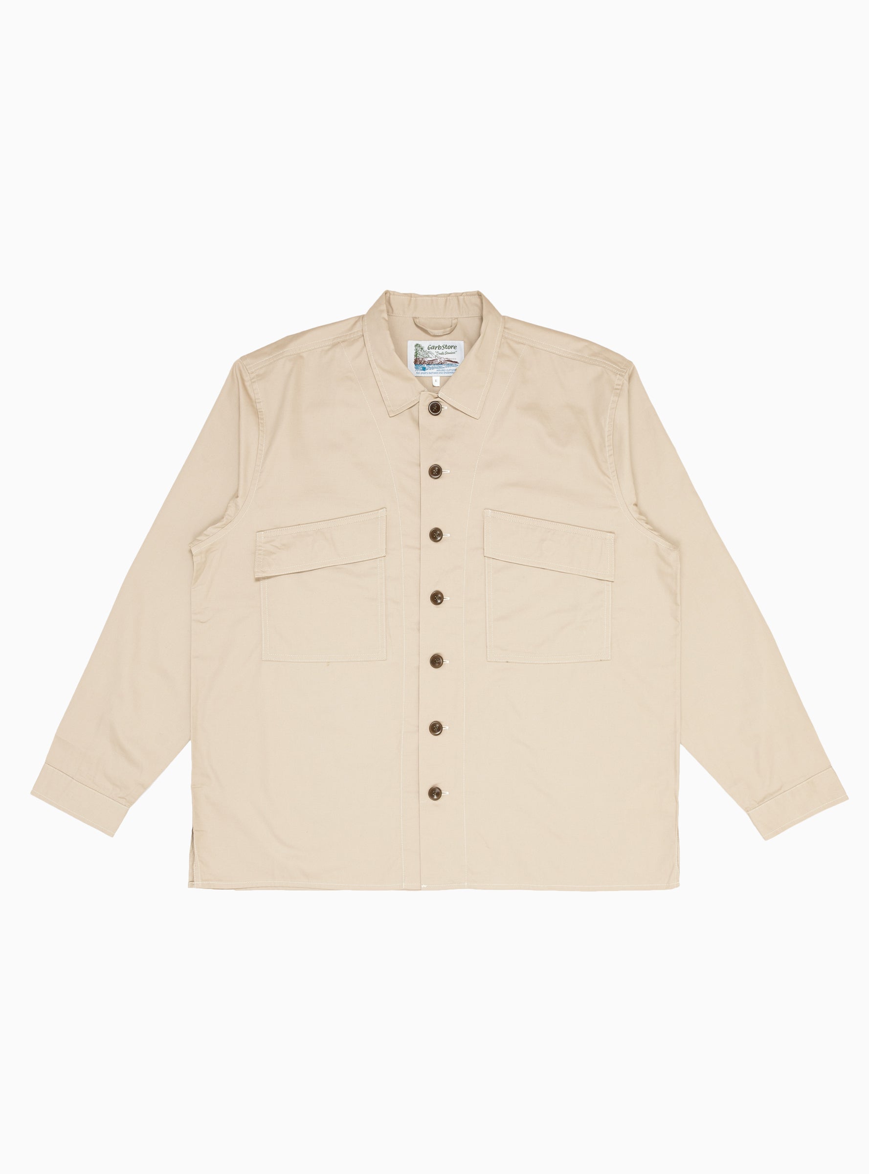This tan DP Manager shirt from Garbstore’s SS23 collection is a versatile transitional piece that can also be layered as a jacket. Made from Japanese cotton twill, it’s cut to a relaxed silhouette with large flap chest pockets and a curved hem. Corozo nut buttons fasten the front and cuffs.