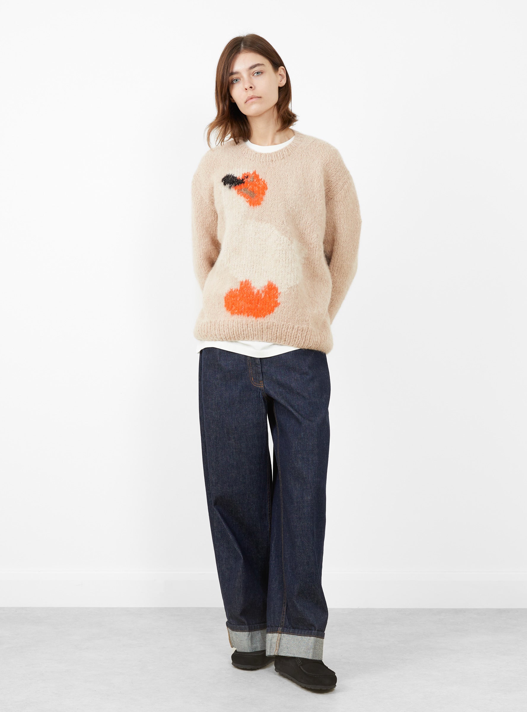 The Duck Penguin Jumper arrives from Wild Animals in Beige. This unisex sweater is inspired by the paintings of Rop van Mierlo and features a rounded neck with ribbed edges for a classic finish. Crafted from a soft alpaca-wool blend, it offers warmth and a relaxed, comfortable fit.