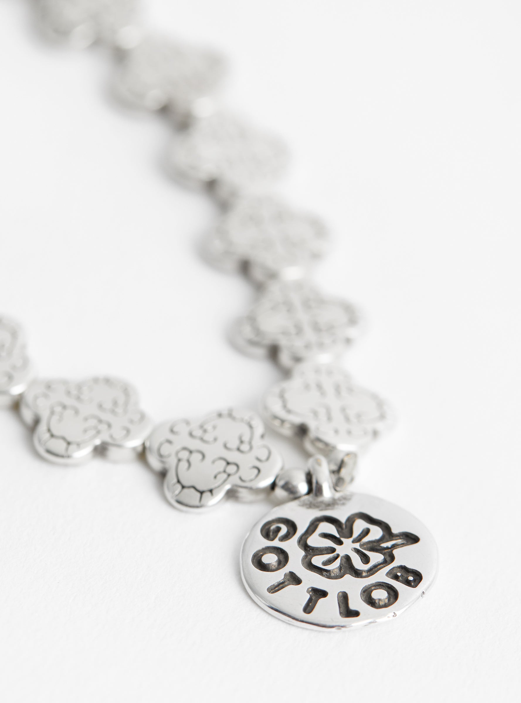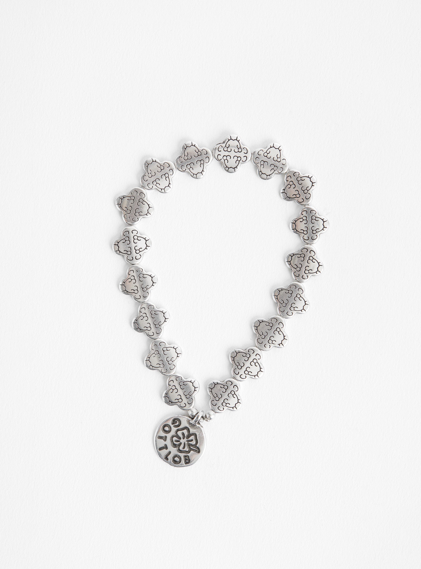 The Edition 1 Bracelet from GOTTLOB features custom engraved, 999 silver plated beads in a clover shape, completed with a branded charm in silver plating; the stretch of the elastic allows for some leeway in sizing and comfort.