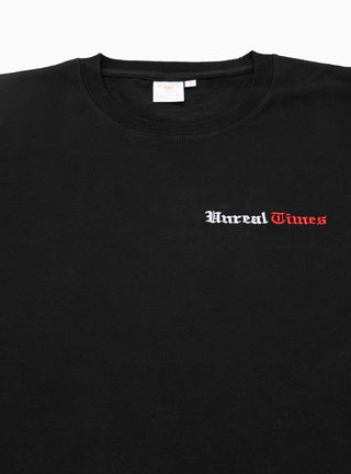 For SS23, Garbstore taps Arnold Park Studios to create a range of premium T-shirts with tabloid-inspired motifs, including this black Unreal style. Made from cotton jersey, it’s cut to a classic-fit silhouette with a ribbed crewneck and features an embroidered graphic at the chest.