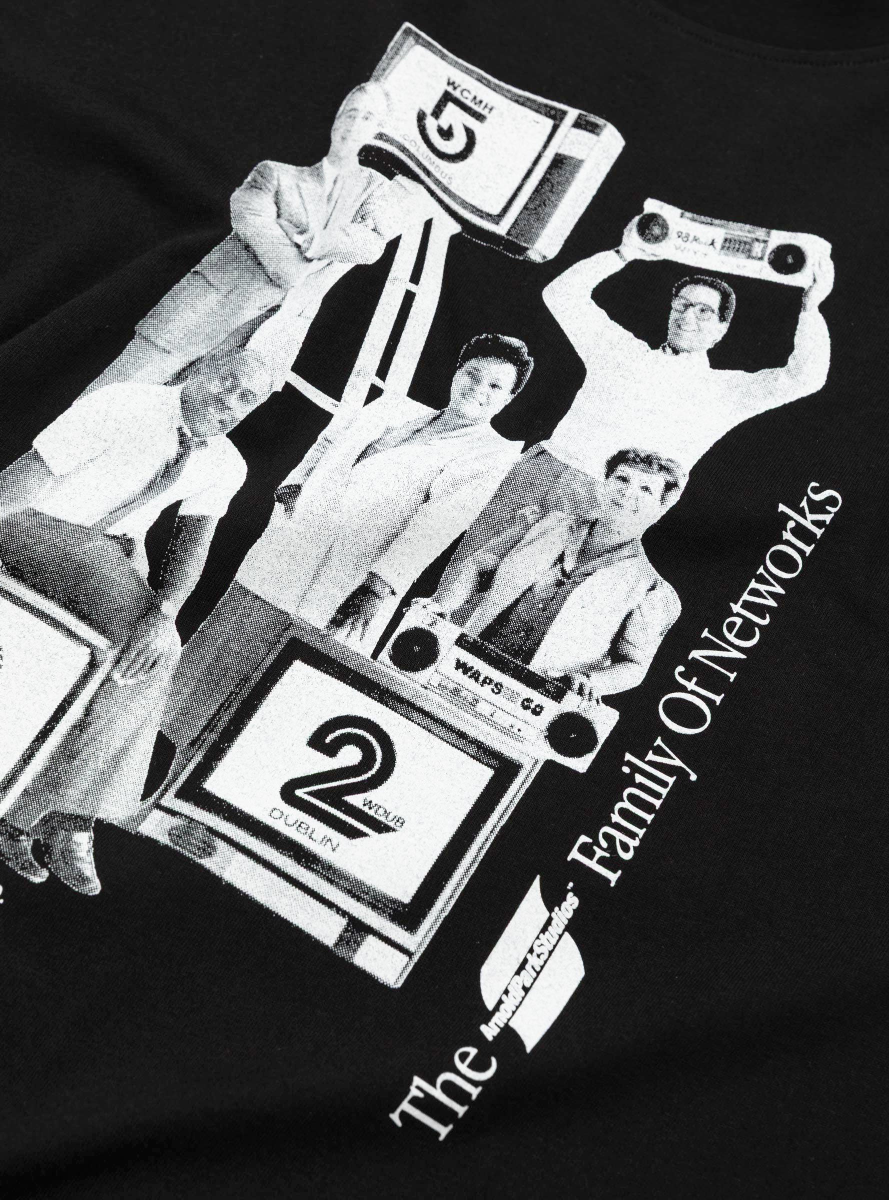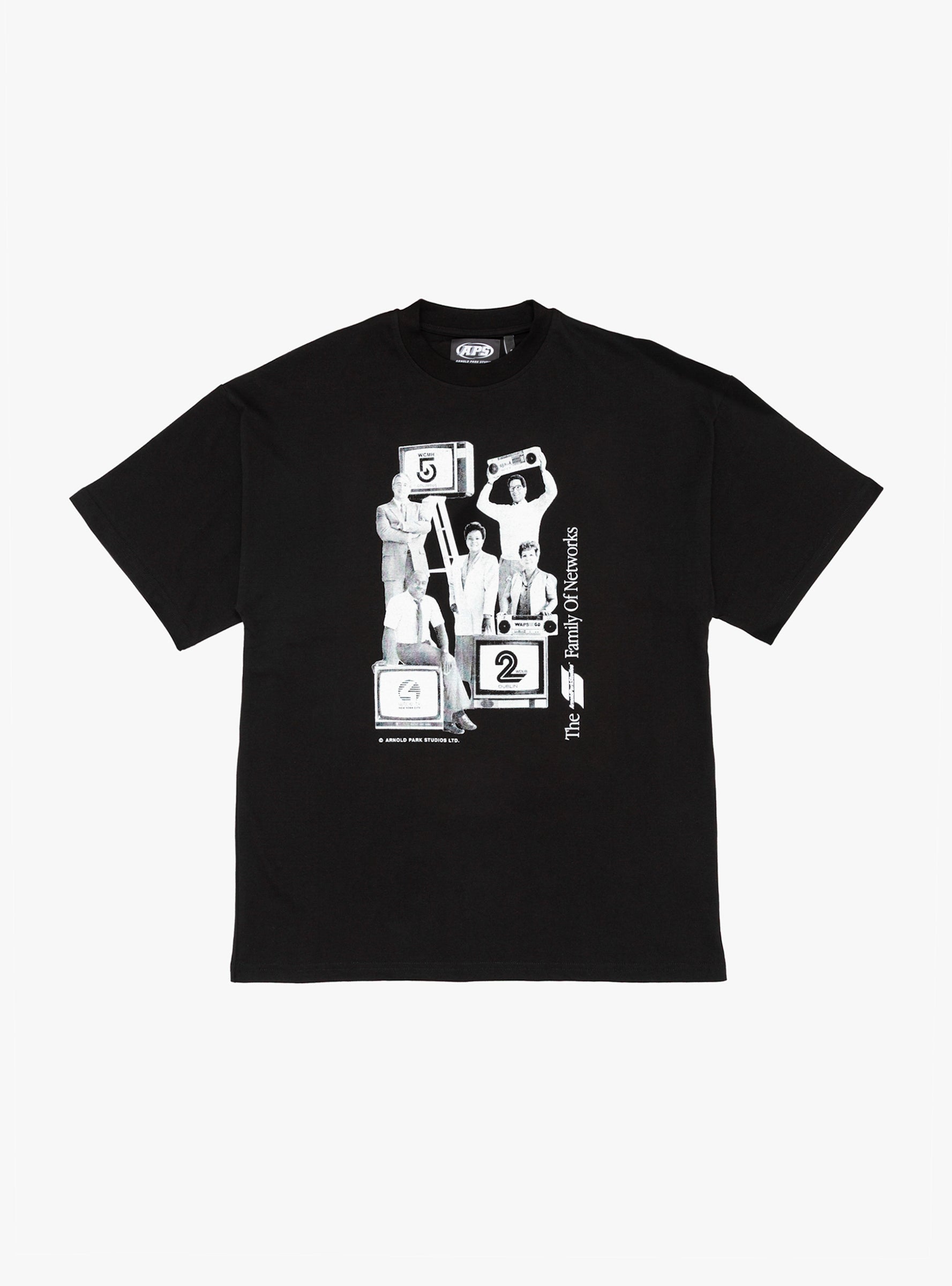 Made in Portugal from heavyweight cotton, the Family of Networks T-Shirt in Black has a relaxed silhouette and is made from 235gsm 100% cotton. The front displays a tv show graphic, while the back features their classic Dublin typography.