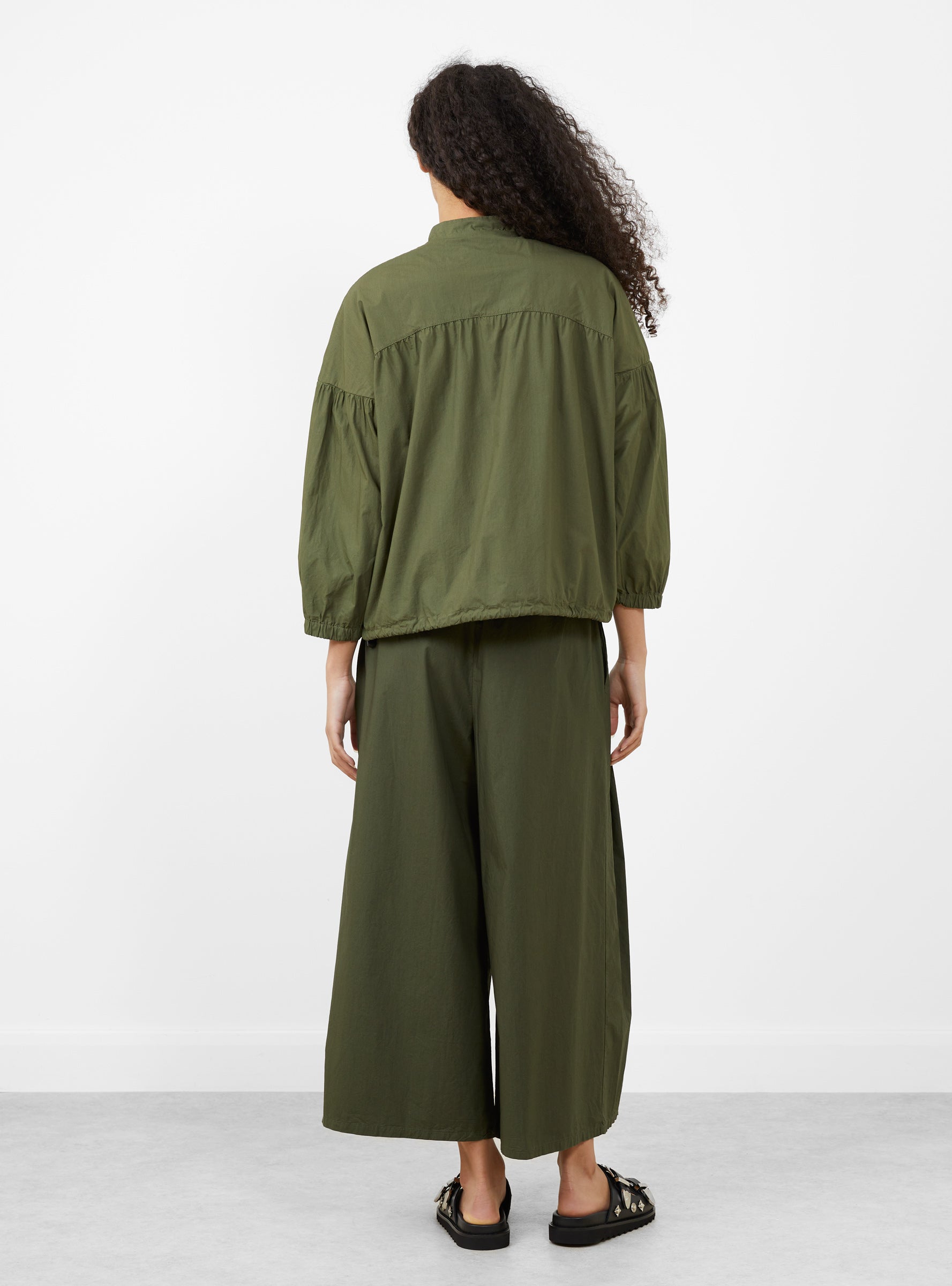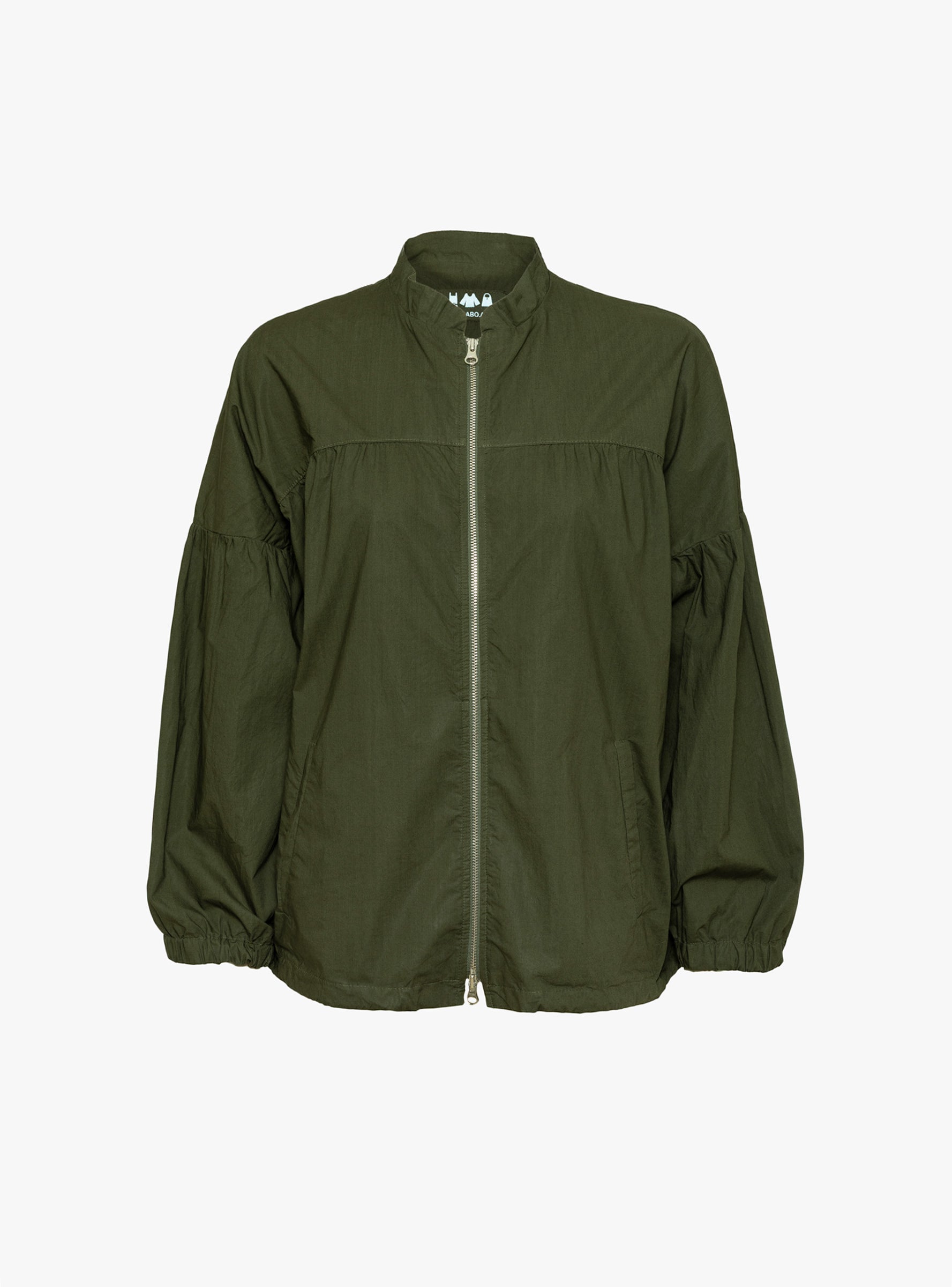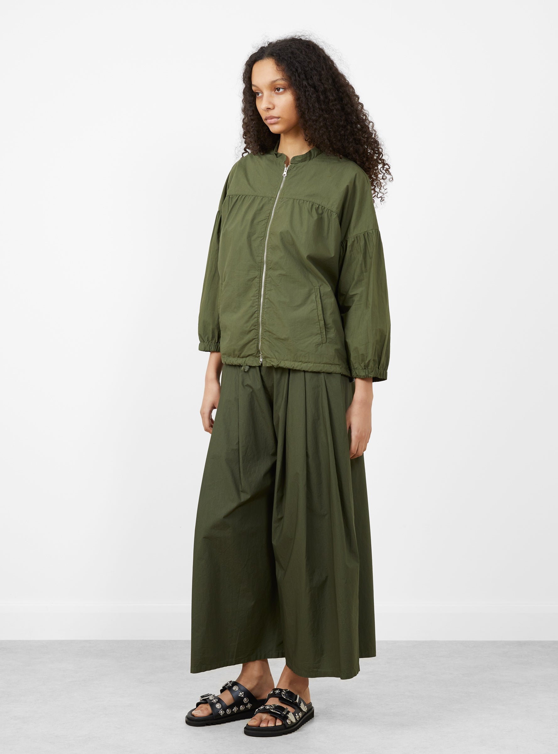 The Farro Clara Jacket comes in Olive and is made in Italy from cotton. Designed with a zip front opening, it features a softly shirred front placket and elasticated cuffs, offering a relaxed shape with subtle structure for everyday wear.