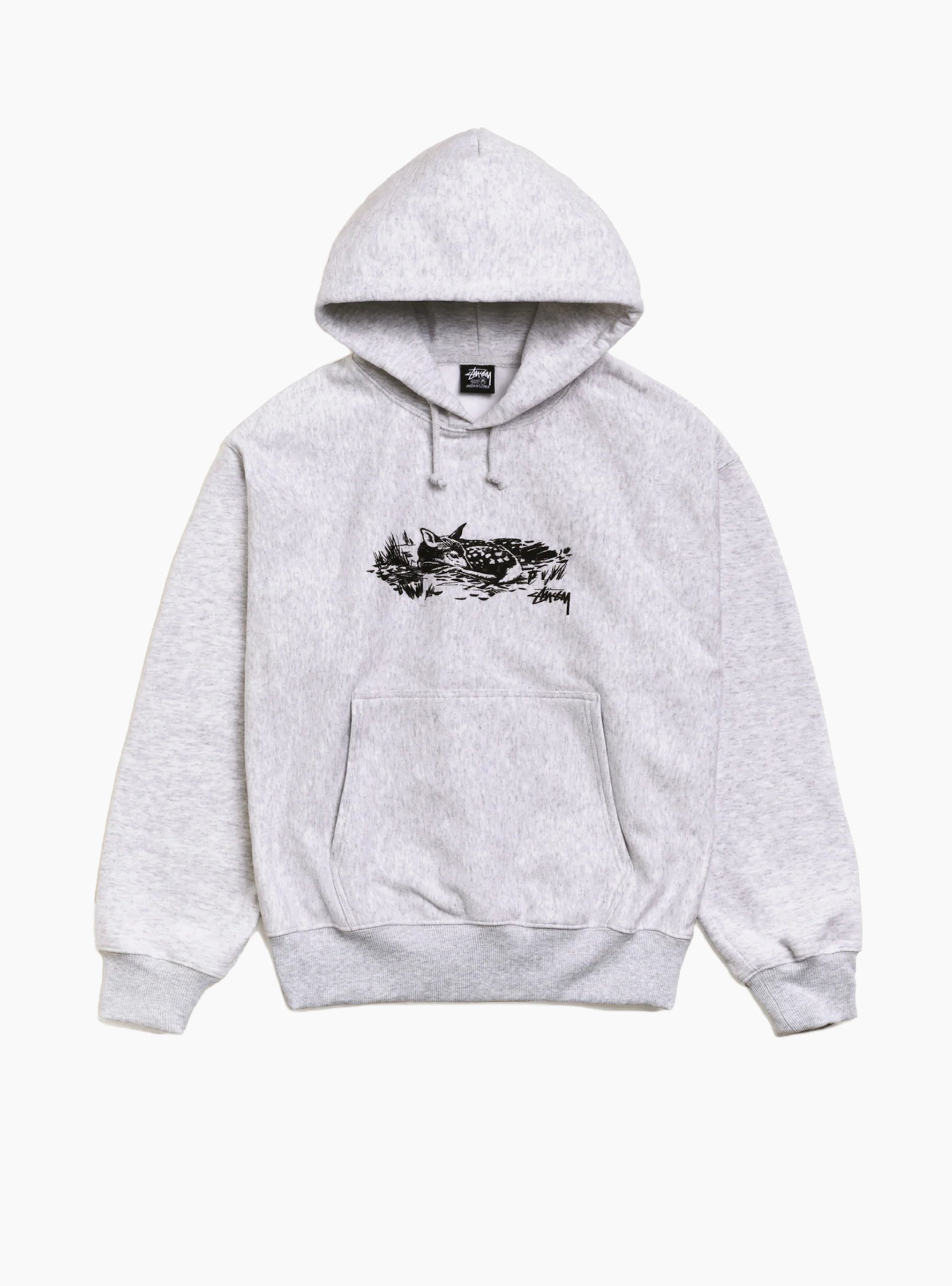 The Fawn Hood from Stüssy arrives in Ash Heather. This relaxed fit hooded sweatshirt is crafted from heavyweight 430gsm cotton blend fleece and features a round drawcord in the hood, screenprinted fawn graphics at the front, ribbed cuffs and hem, and a kangaroo pocket.