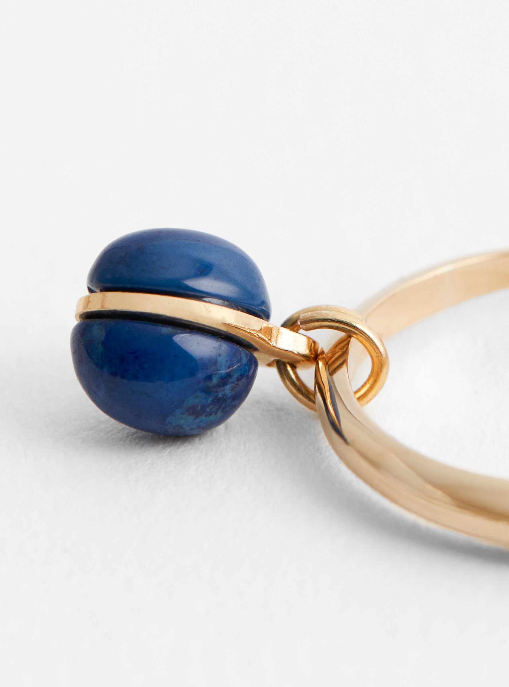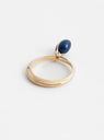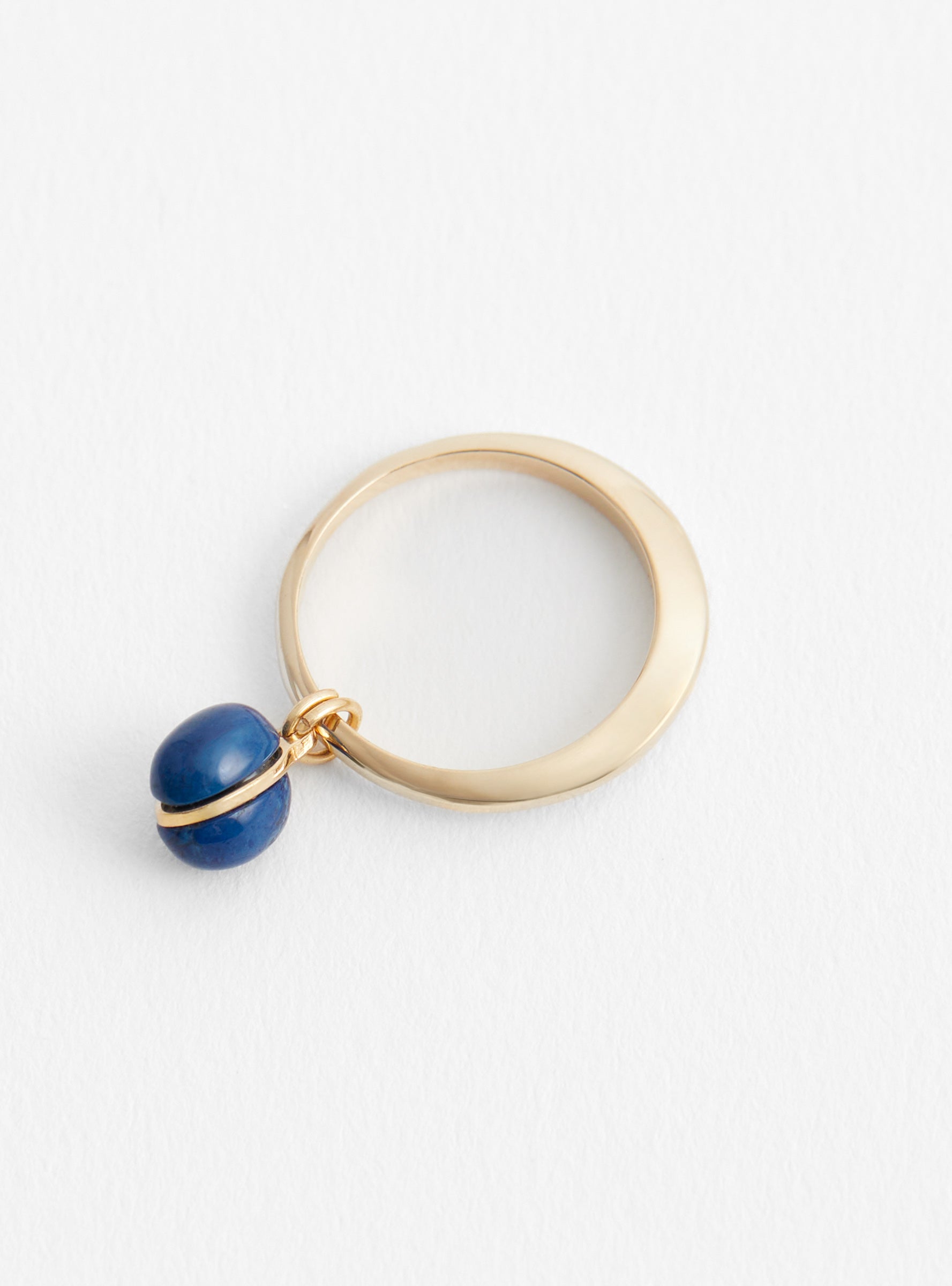 The Fine Round Ring by Helena Rohner arrives in a gold with a lapis-coloured stone. Made in Spain from gold-plated brass, the ring takes a fine and delicate form and is completed with a hanging stone, wrapped in a ring of gold.