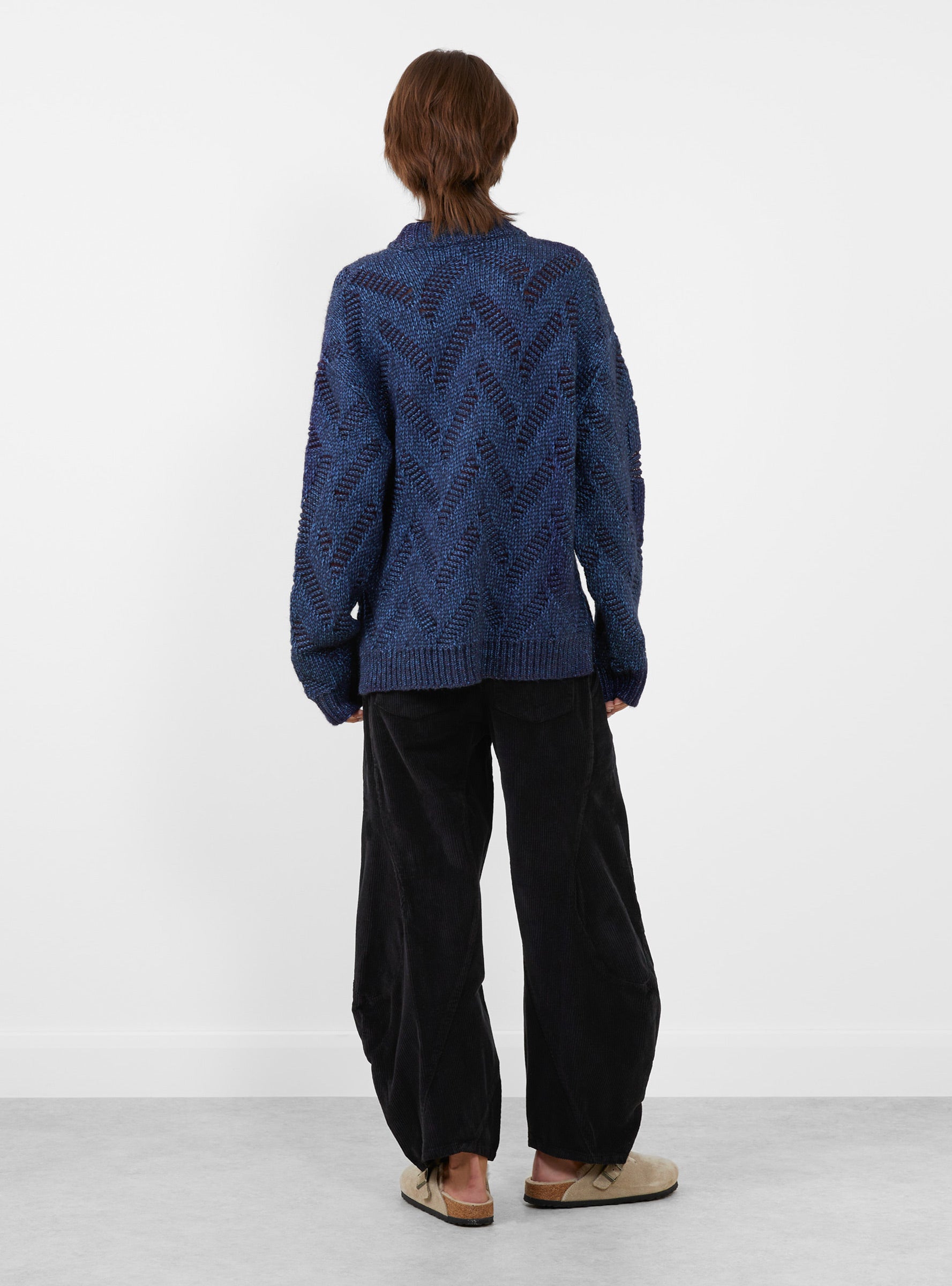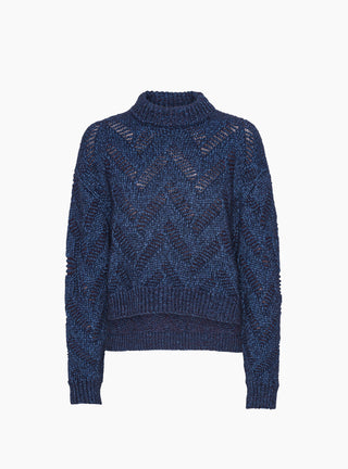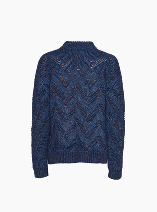 The Flat Knitted Jumper from Henrik Vibskov arrives in Navy. Made in Bulgaria from a midweight blended knit, this pullover features a rich navy zig-zag pattern with a thick ribbed collar, cuffs and hem. The hemline is subtly lower at the back for a relaxed, modern shape.
