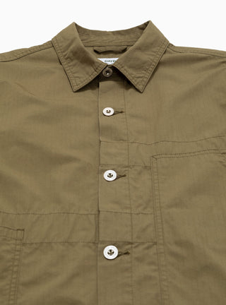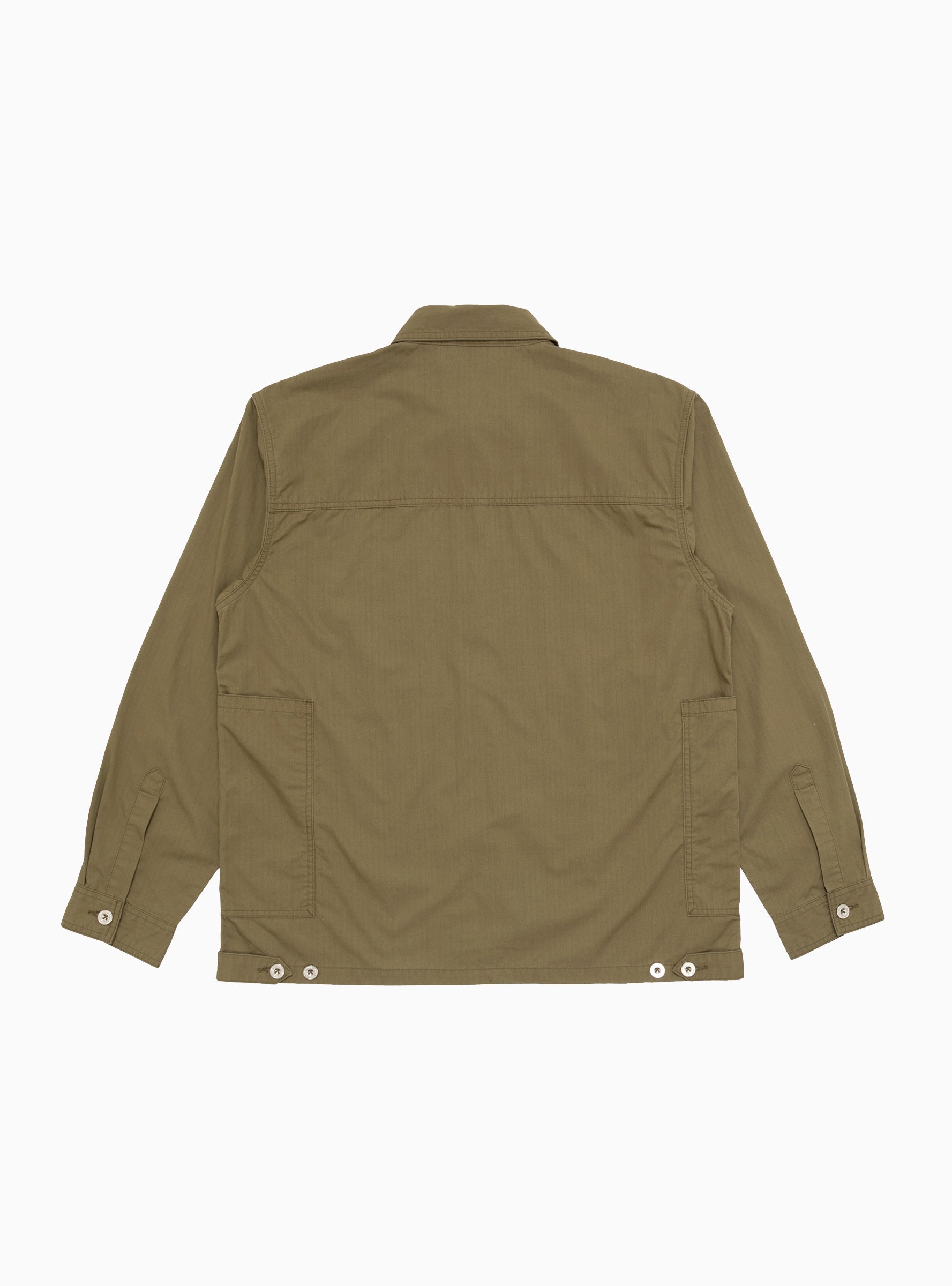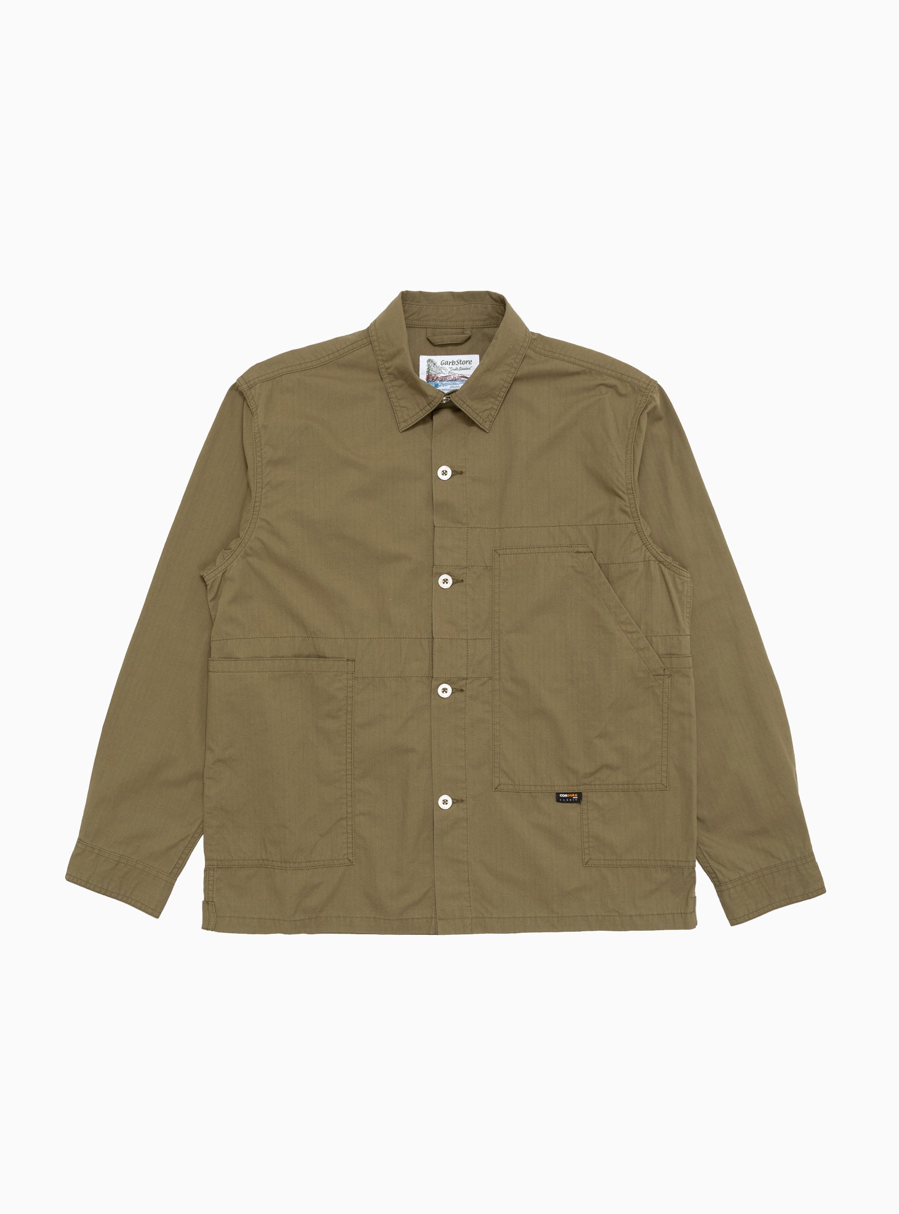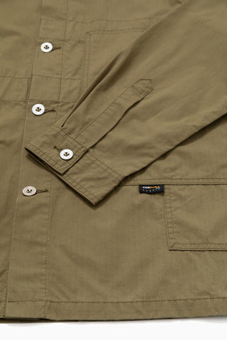Inspired by military styles, the olive Flight shirt from Garbstore’s AW22 collection blurs the line between form and function. Made from heavyweight cotton-blend CORDURA® ripstop, it’s cut to a relaxed silhouette – perfect for layering – with dropped shoulders and asymmetric fatigue pockets. Silver logo-embossed buttons fasten the front, cuffs, and waist adjusters.