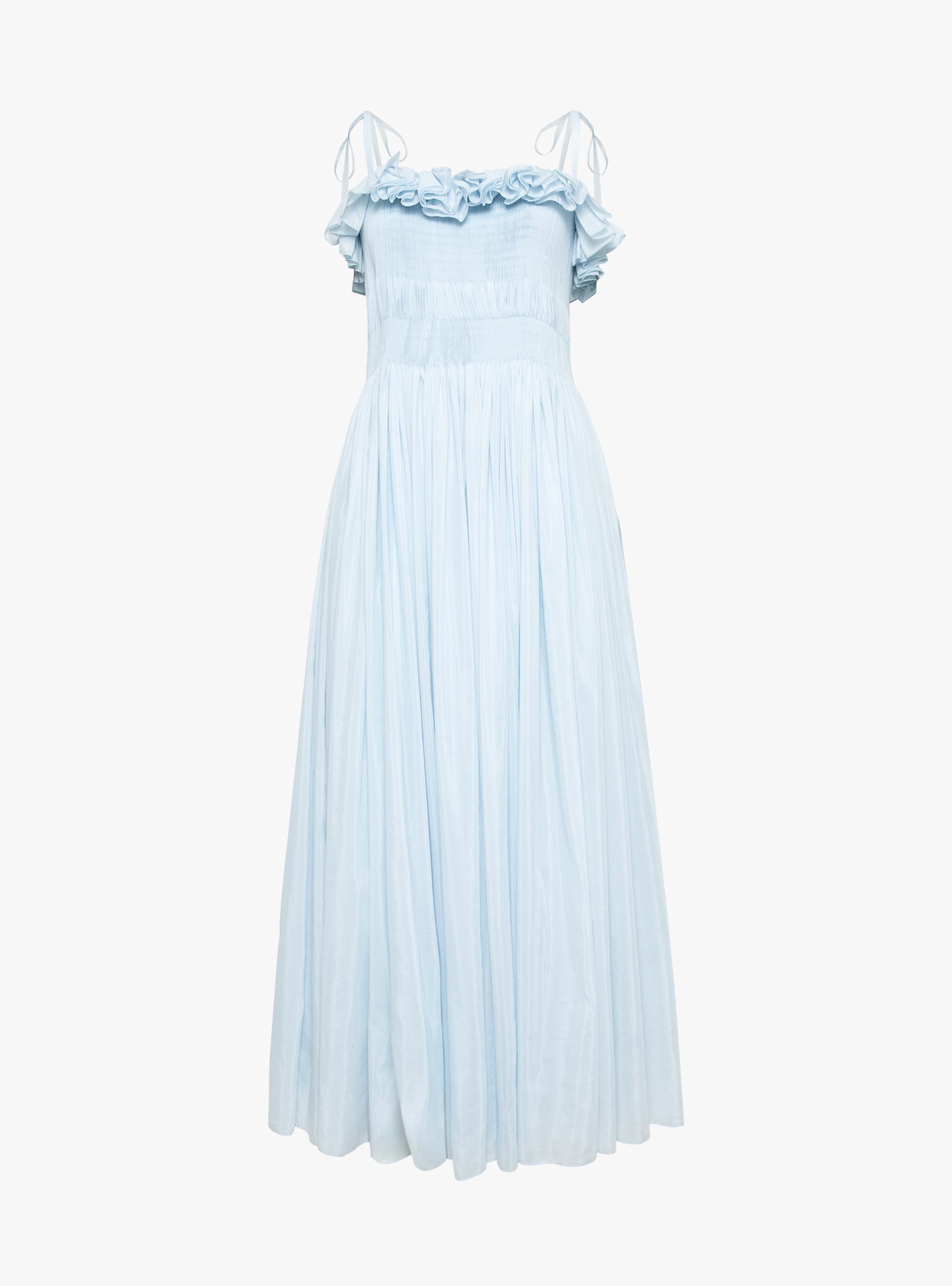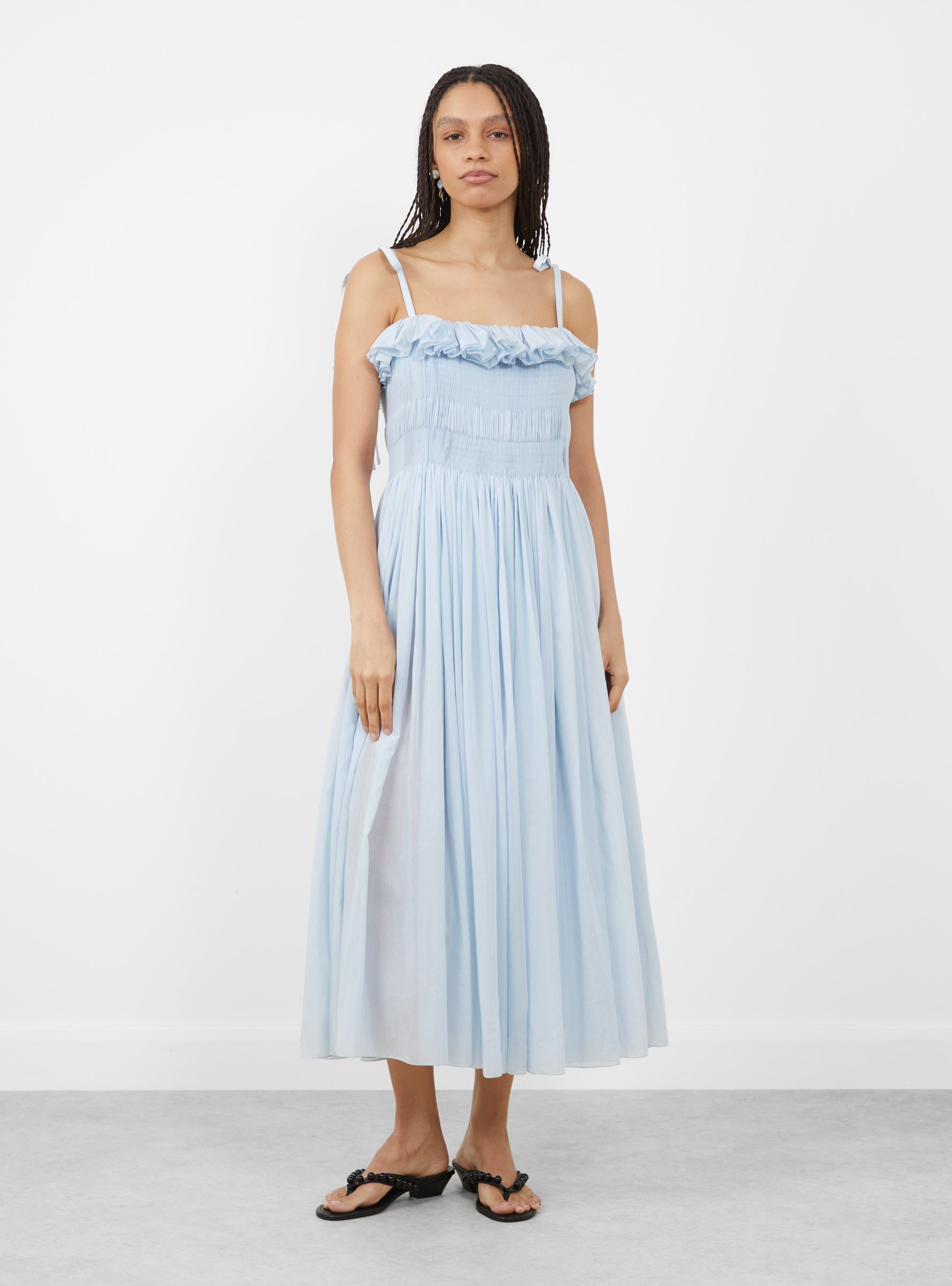 The Flor Dress comes in Sky Blue from RENATA BRENHA and is crafted from an ultra-lightweight silk blend with a natural sheen. The dress features a hand-smocked waist, adjustable ties, and a full skirt with a relaxed silhouette.