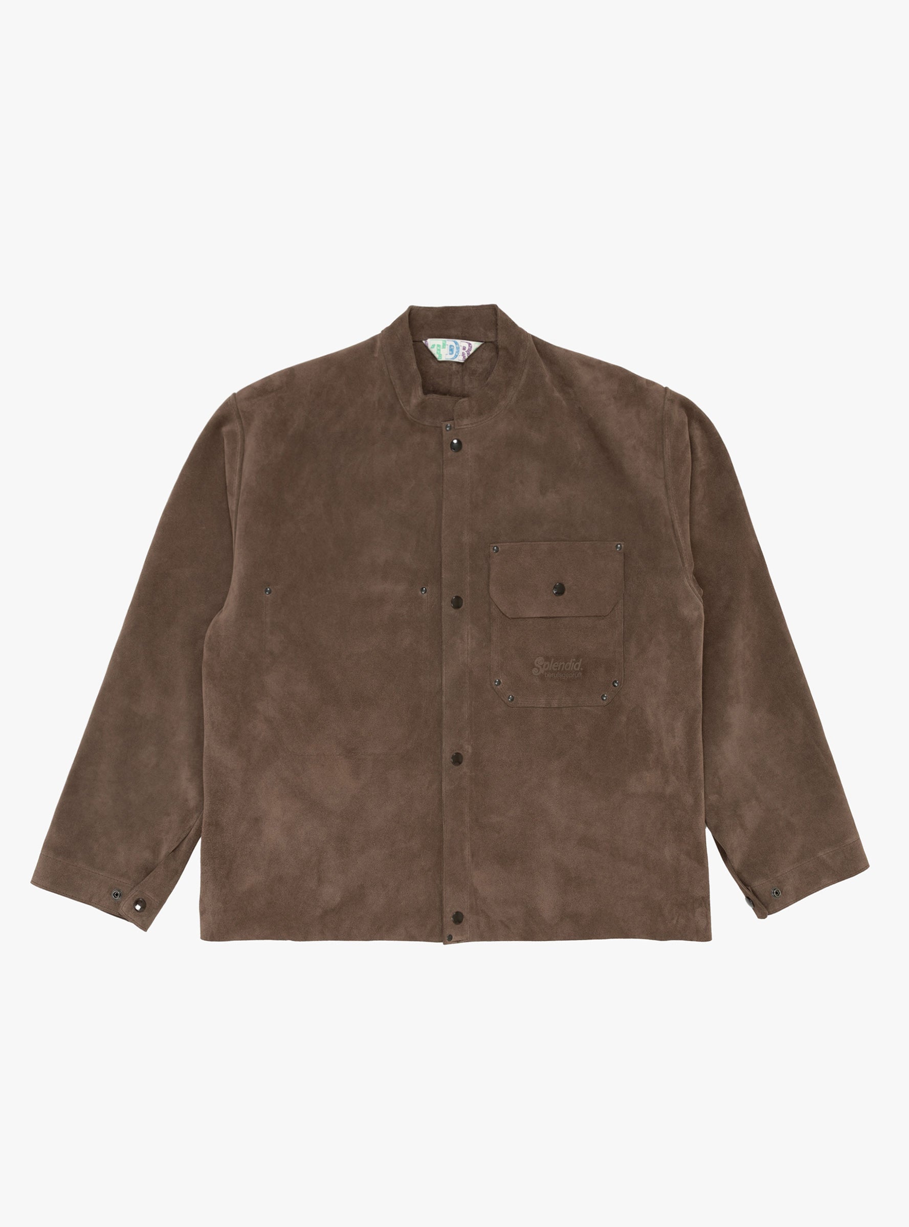 The Forge-Guard Suede Jacket in Tobacco from TDR is handmade in the UK from Italian suede. This jacket features a press-stud front closure, a curved collar, a button-closure chest pocket with heat-stamped branding, and a concealed inside pocket, all detailed with bifurcated metal rivets. Adjustable cuffs and waist allow a tailored fit, while half raglan sleeves ensure ease of movement.