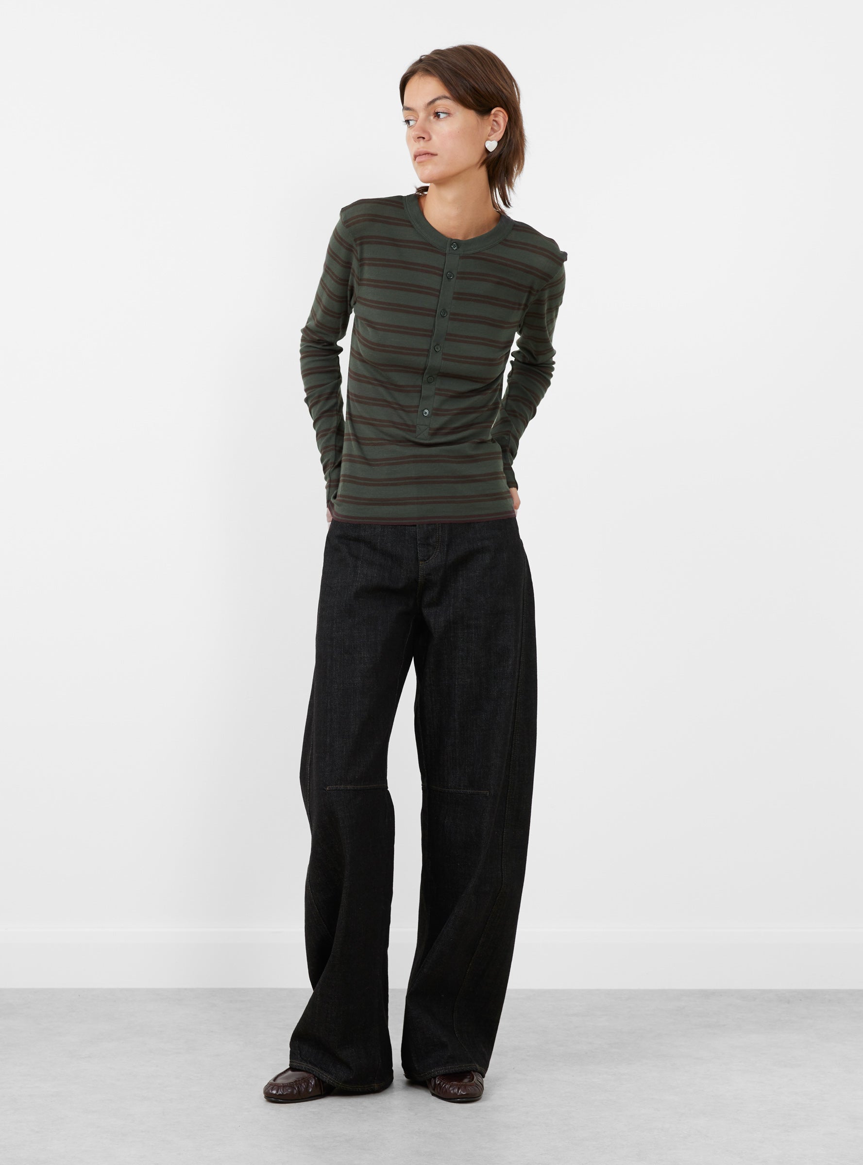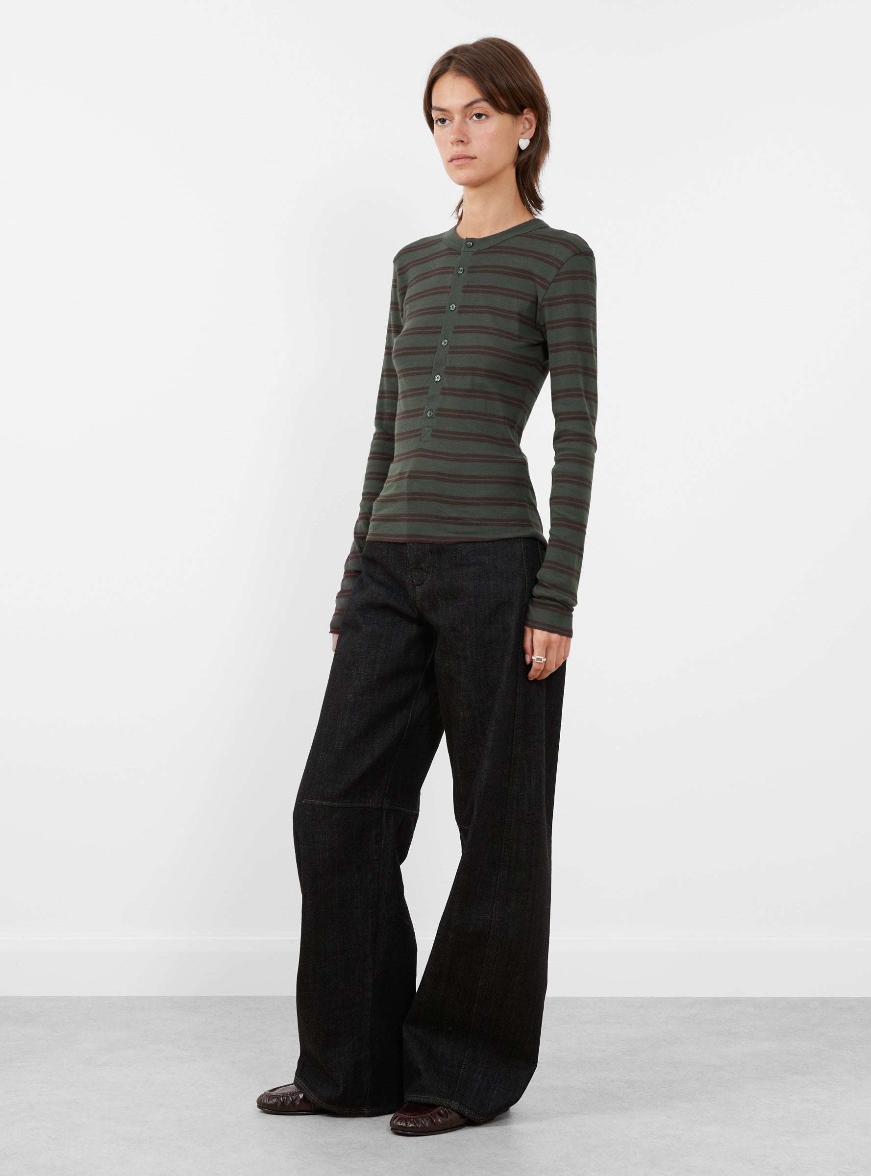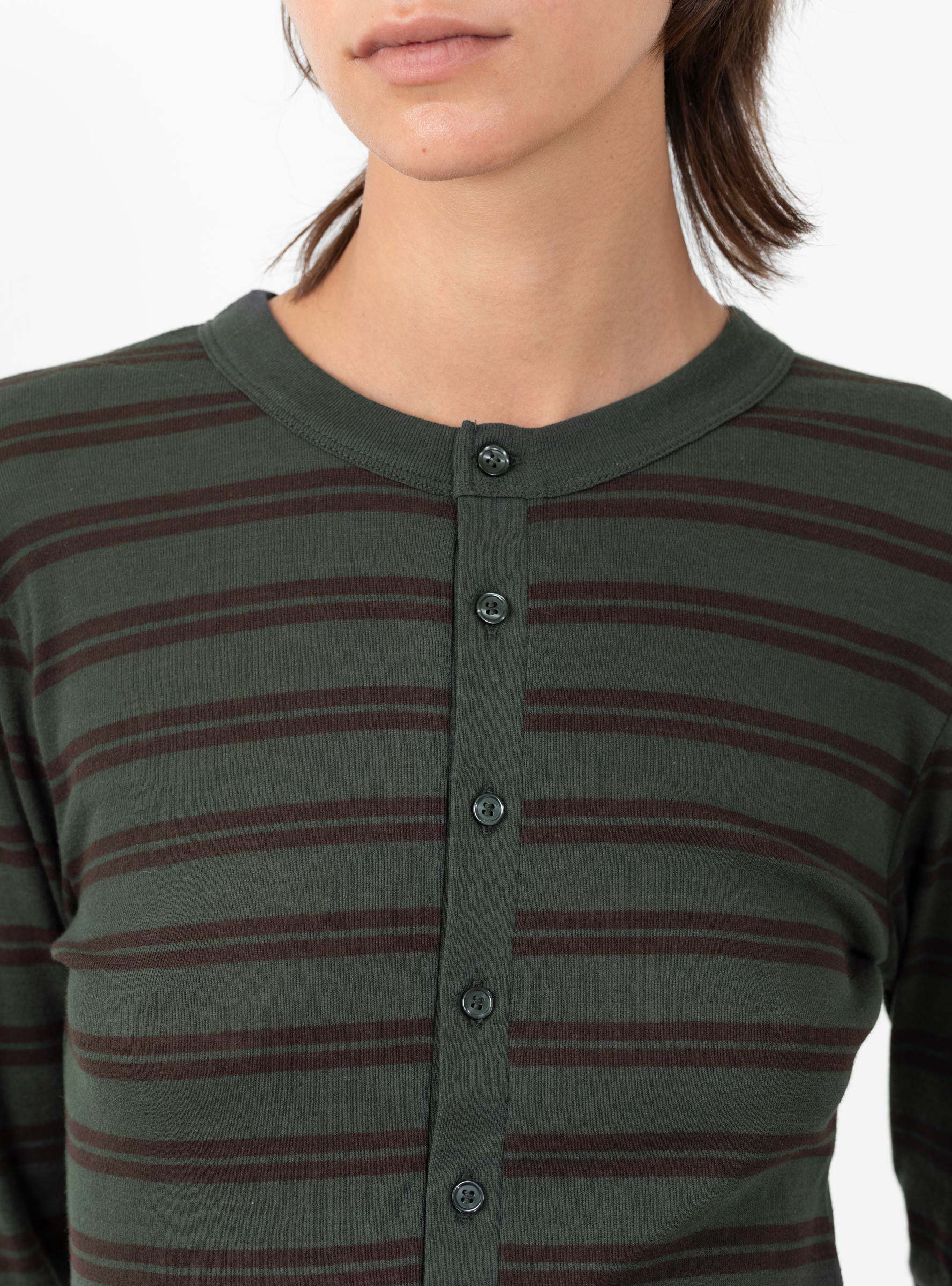 The Gaelle Long Sleeve Top from Soeur arrives in Aubergine and Anthracite. A soft cotton crêpe top with subtle texture, finished in understated stripes for everyday layering with a button down front.