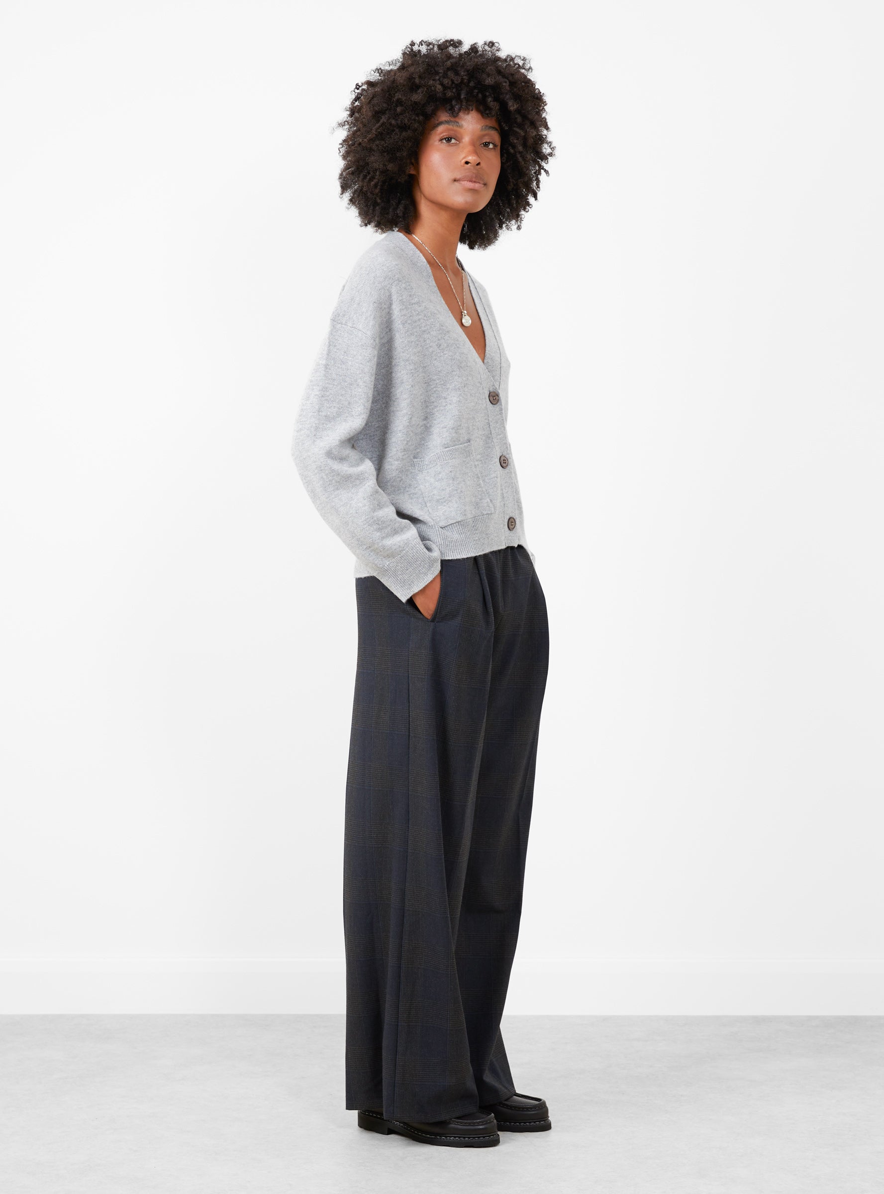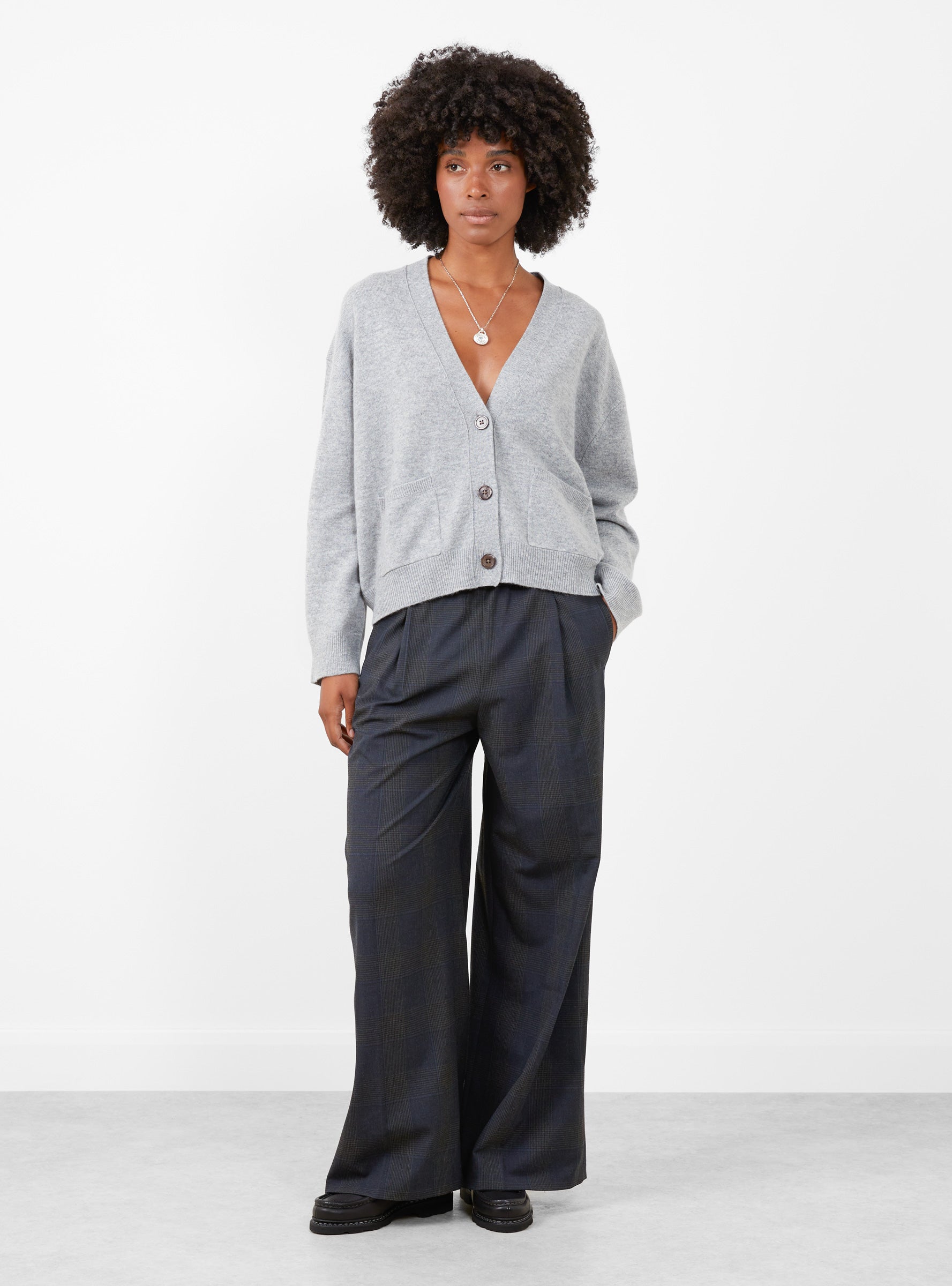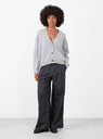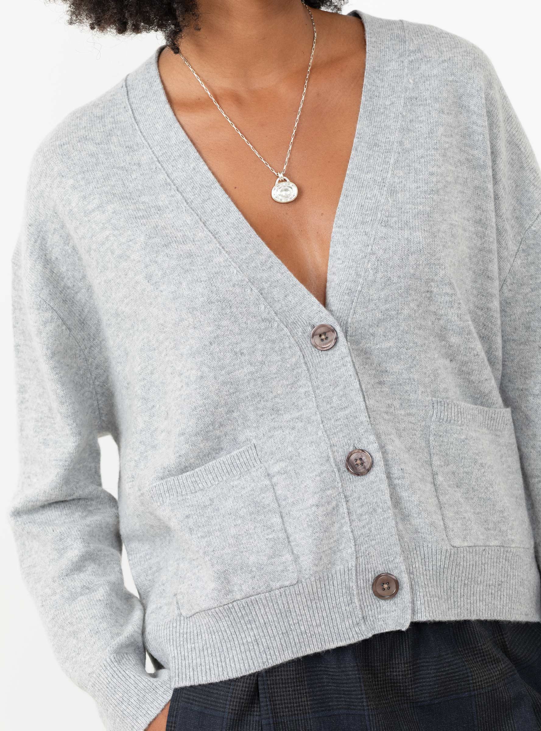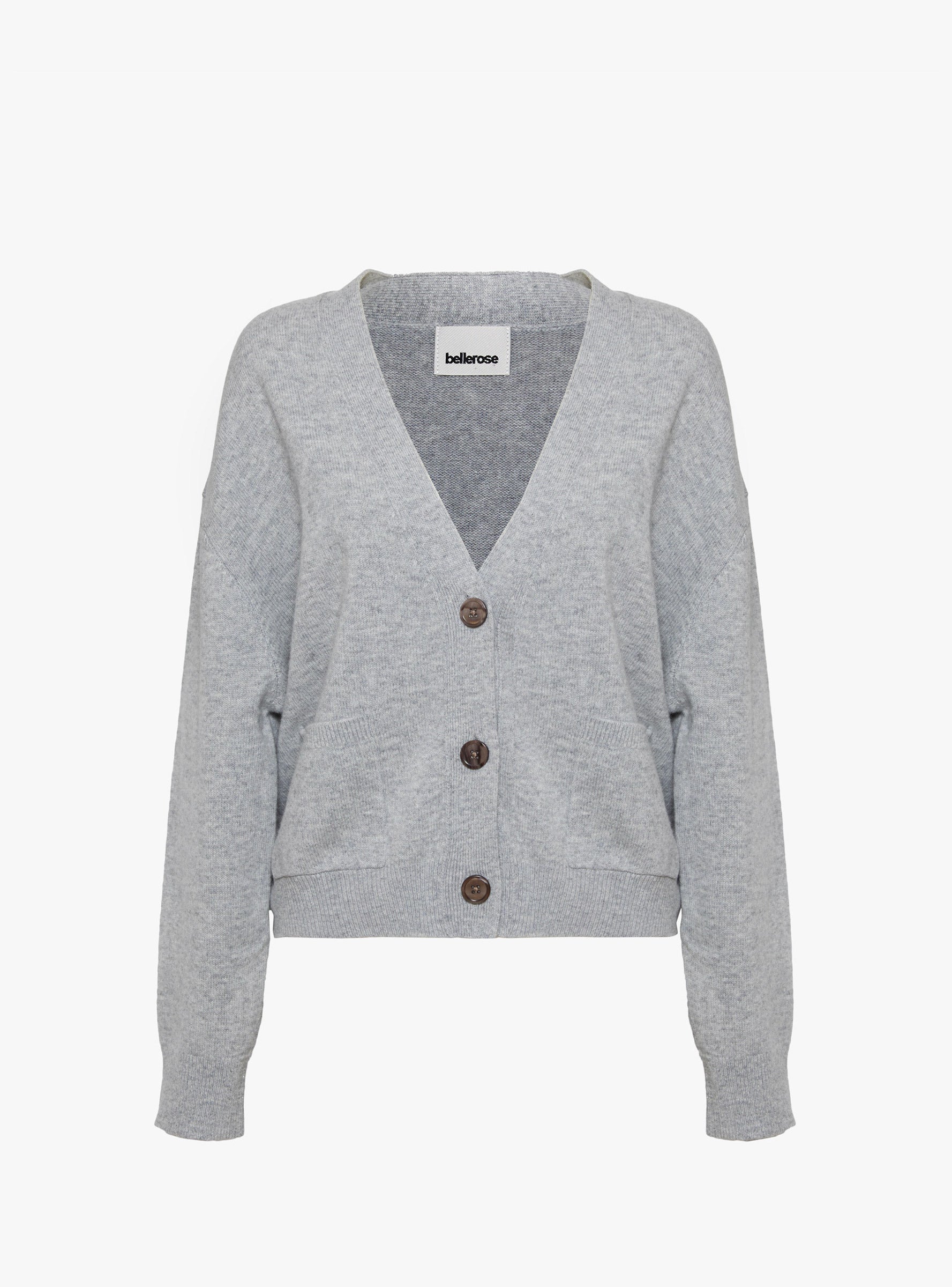 The Gakkin Cardigan from Bellerose arrives in Light Grey. This oversized V-neck cardigan is made from a wool and cotton blend, offering a cozy layering option. It features long sleeves, button fastening, small front pockets, and ribbed edges for added texture.