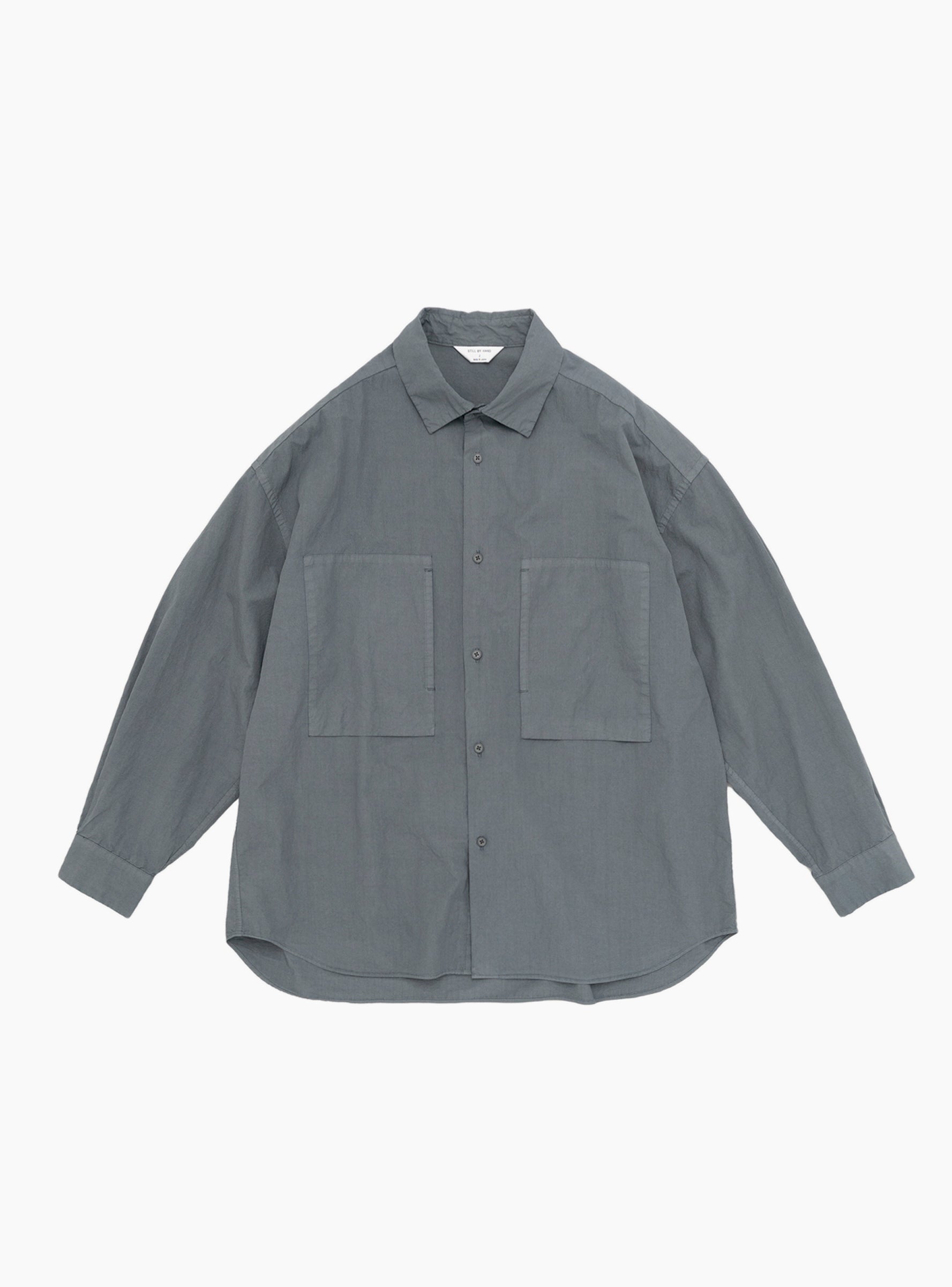 The Garment-Dye Over Shirt in Blue Grey from Still By Hand is crafted from 100% cotton peach skin using the brand’s original PFP fabric produced in Hamamatsu, Shizuoka. The shirt has a relaxed, boxy silhouette and features two large chest pockets with vertical inner openings.