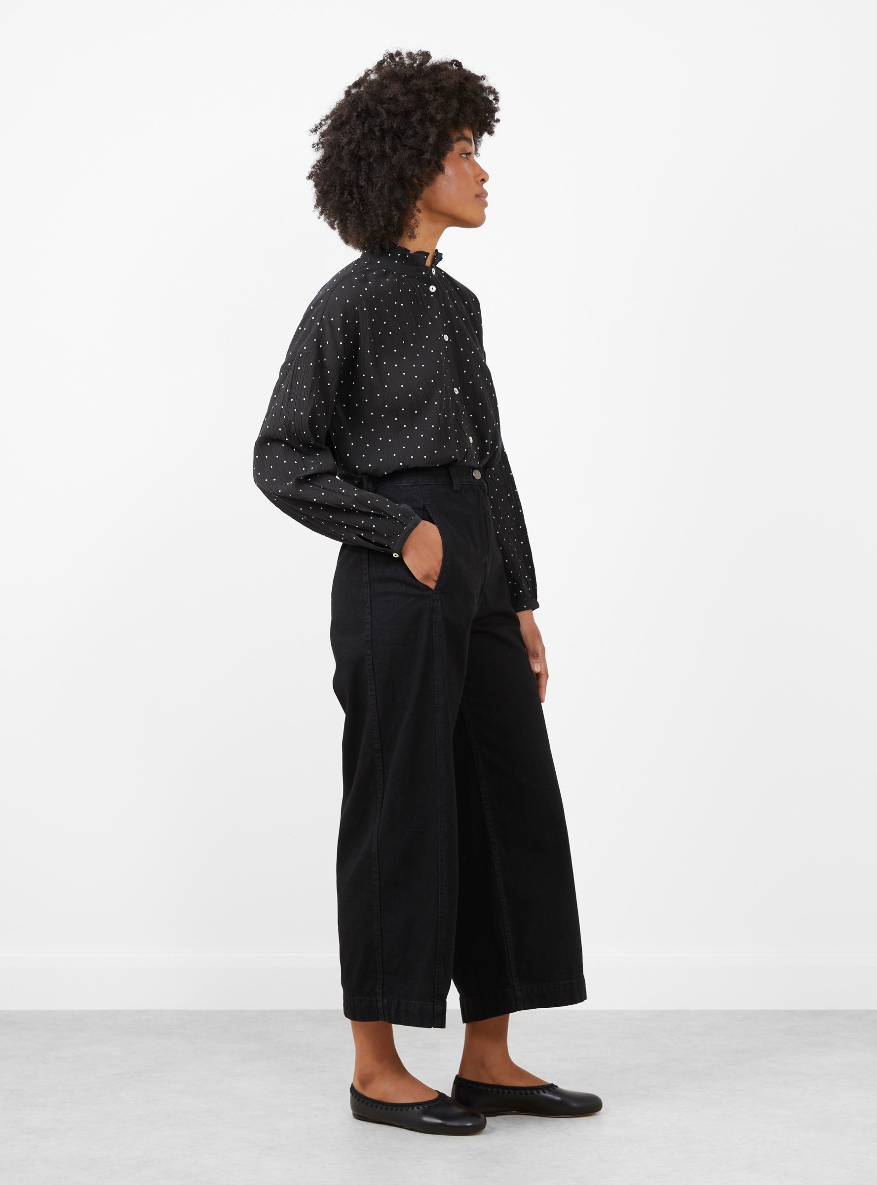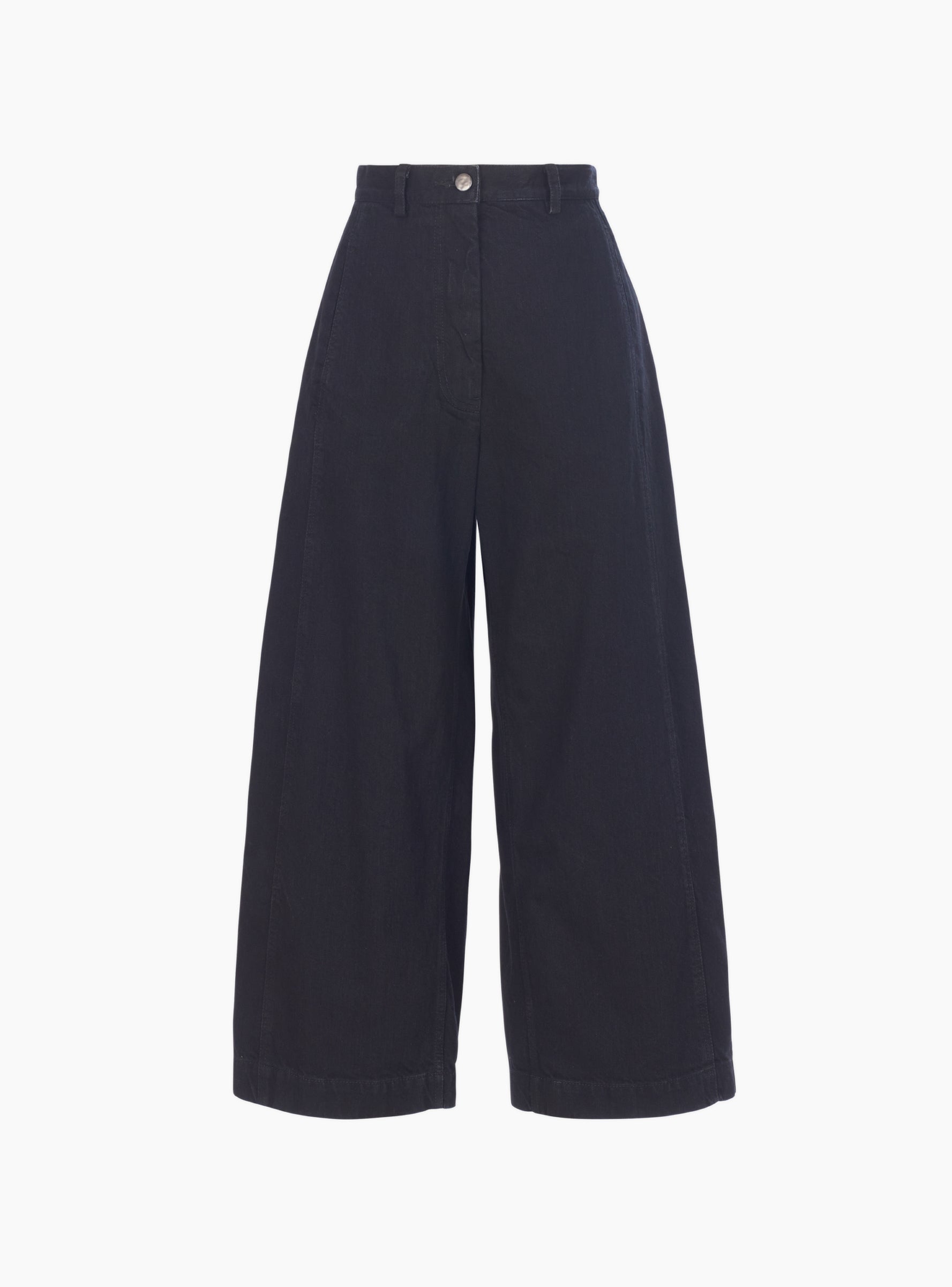 The Garra Jean in Black from Rachel Comey is a high-waisted, flat-front jean with a relaxed fit and wide, rounded legs. Cut from lightweight cotton canvas, it features a zipper and button fly and side slip pockets for practical wear.
