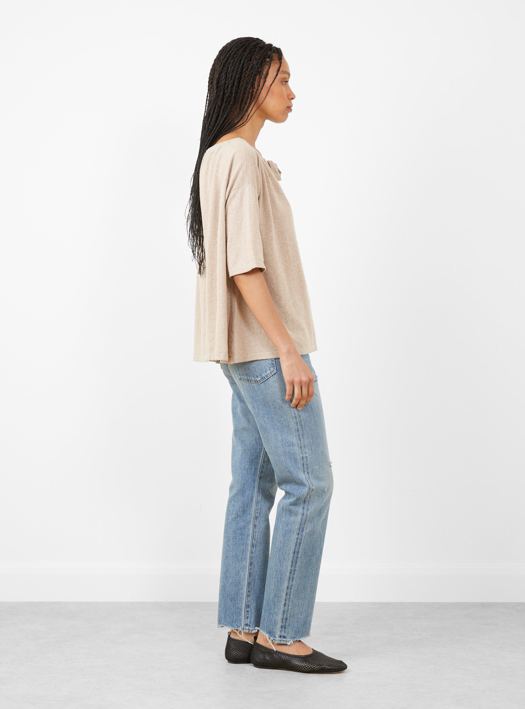Lauren Manoogian’s Gather Top arrives in a Sisal colourway, crafted in Peru from a fine-gauge blend of dry cotton and linen. Designed for effortless wear, the short sleeve top features an adjustable neckline with a drawstring, and a clean tubular finish.