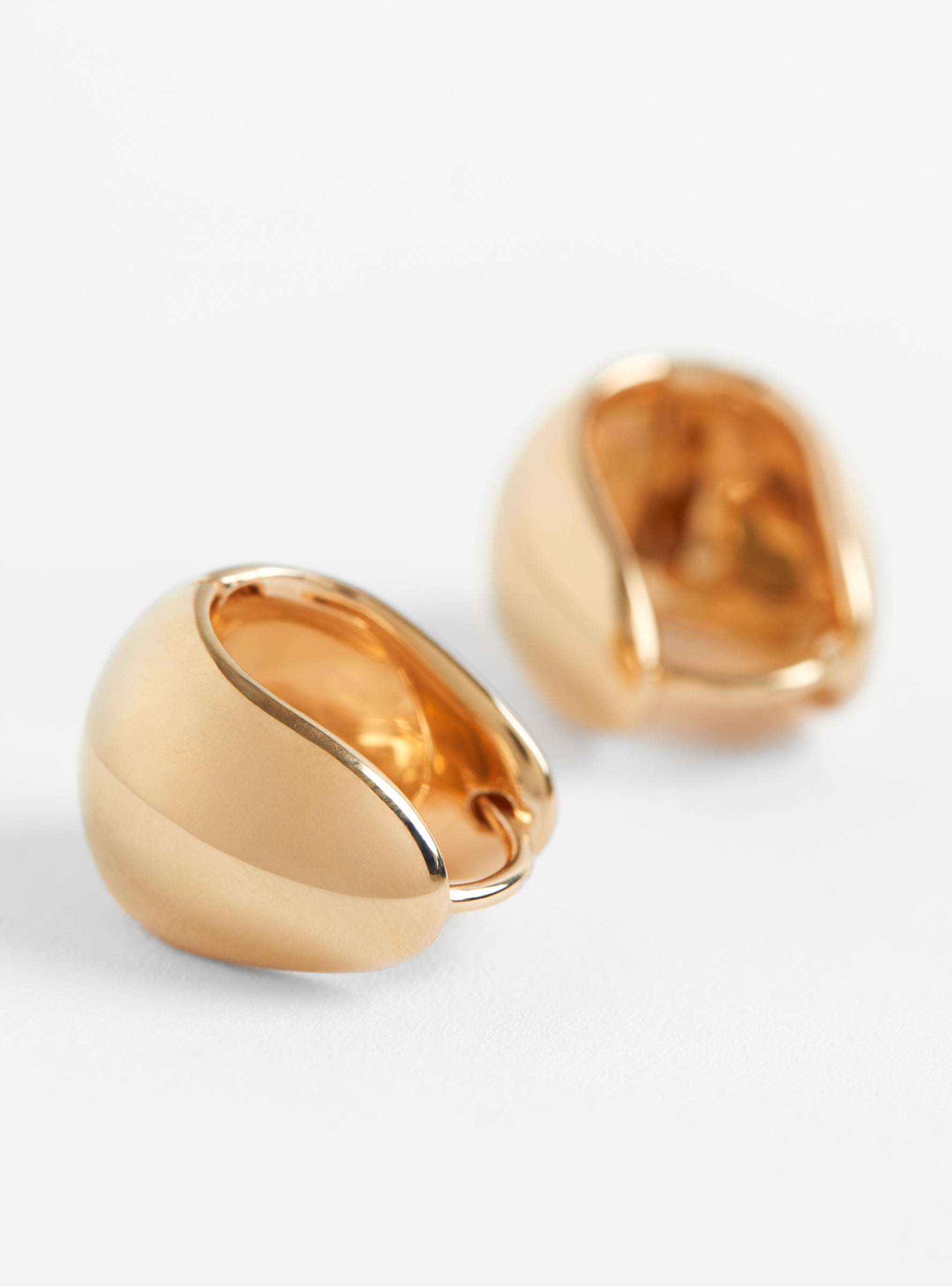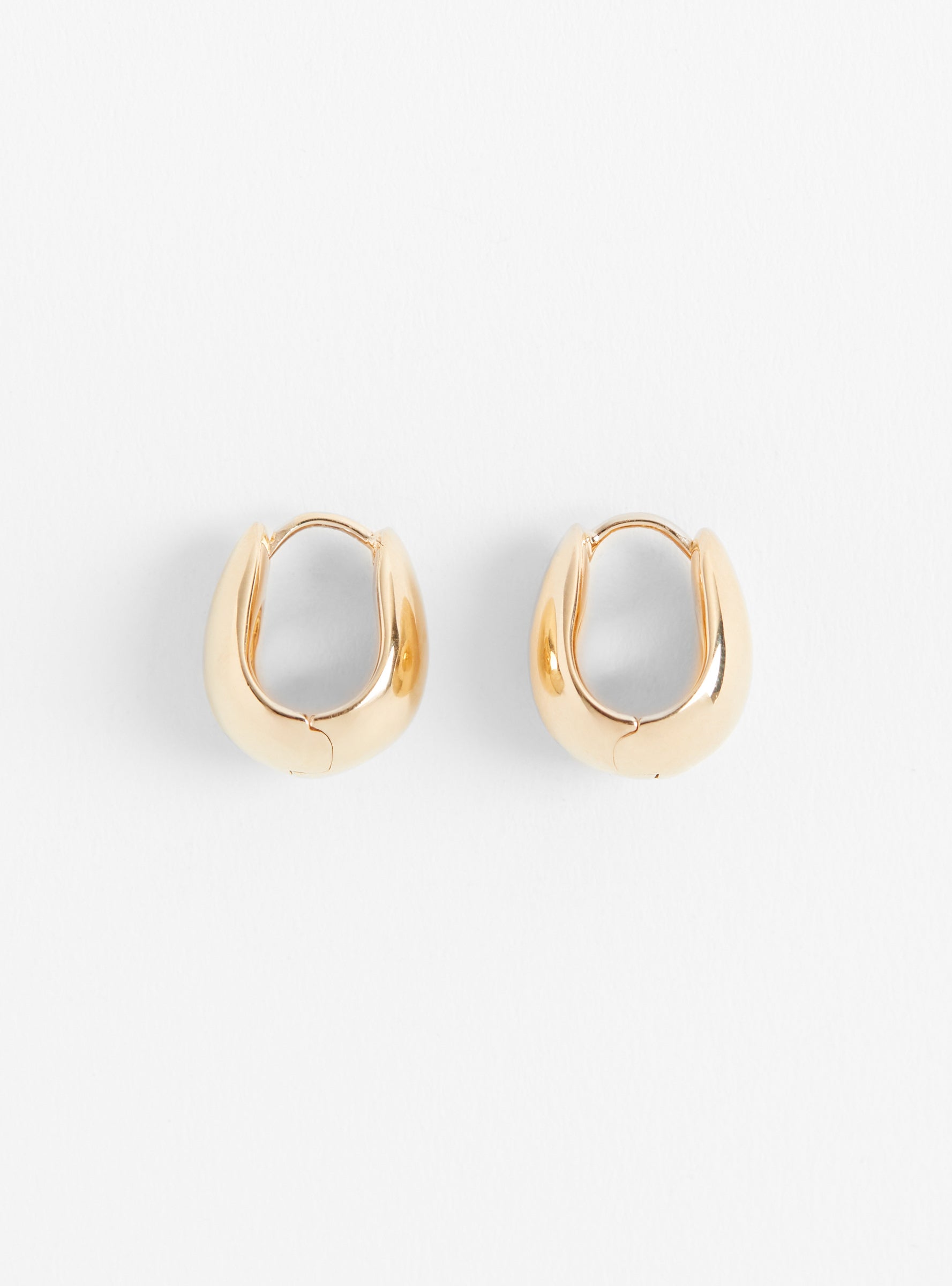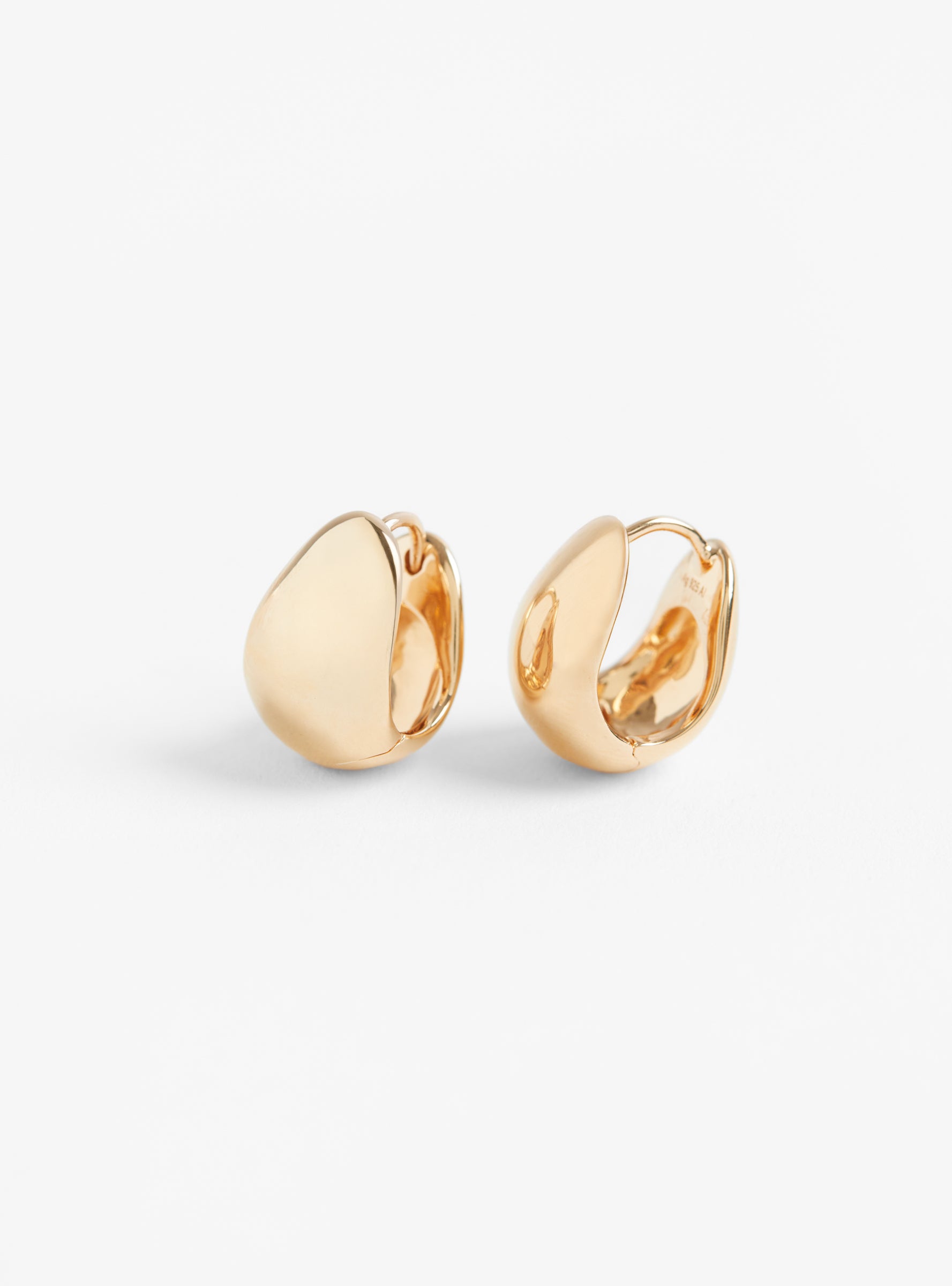 The Gentle Slope Earrings from Annika Inez arrive in Gold. Made from 14k gold plated 925 sterling silver, these hinge hoop earrings feature a gently sloping curve, offering a subtle yet sculptural everyday statement.