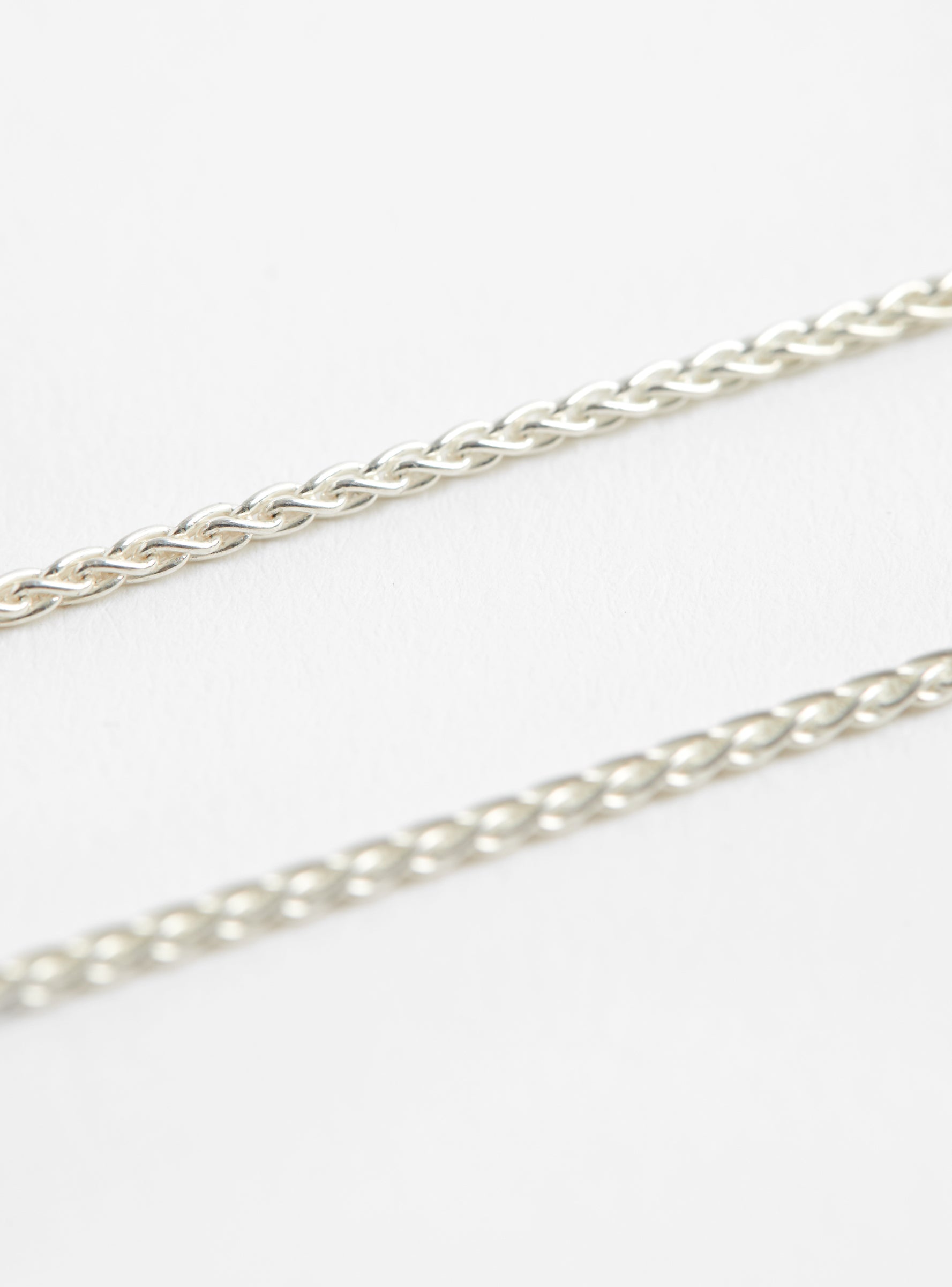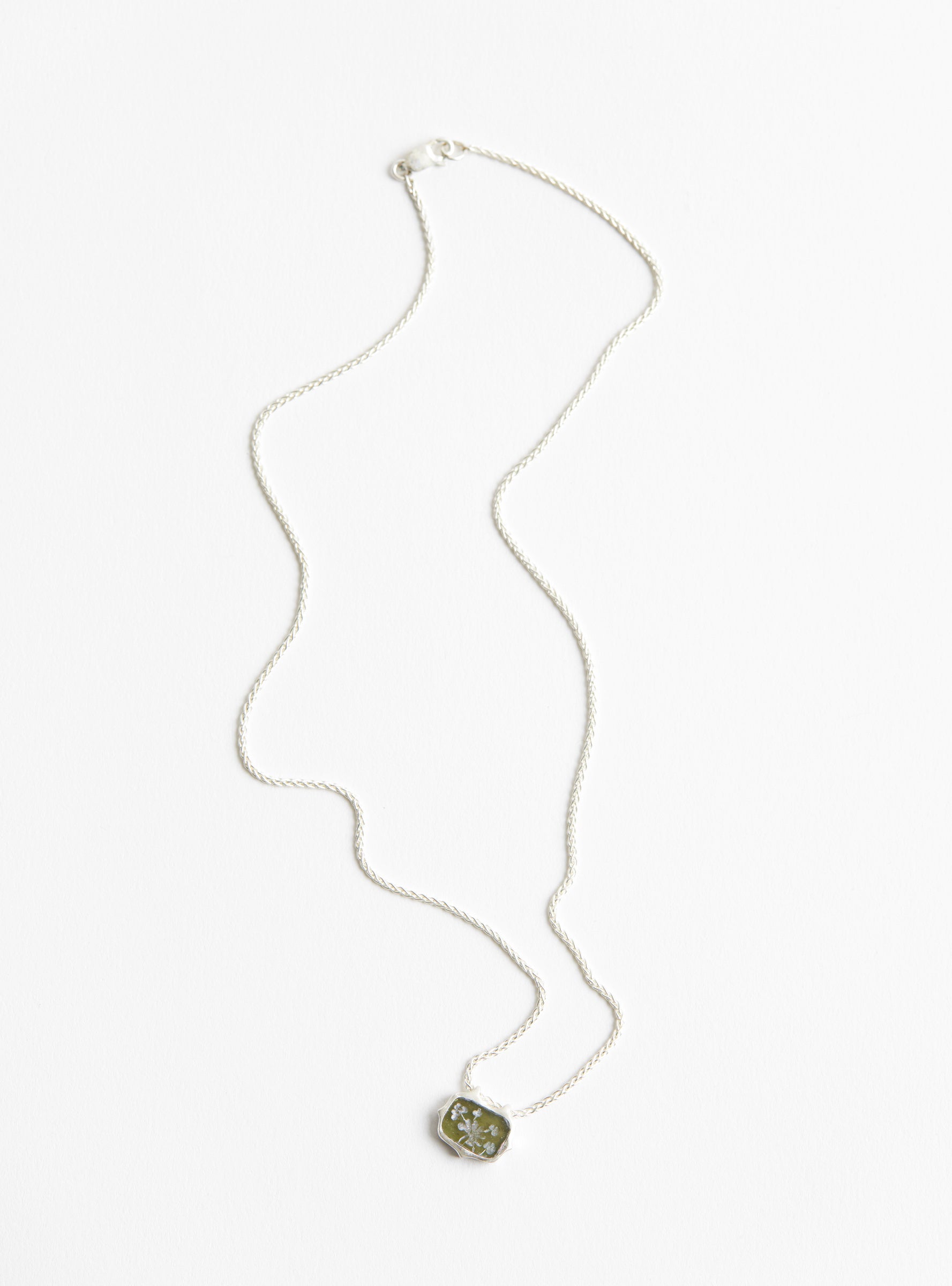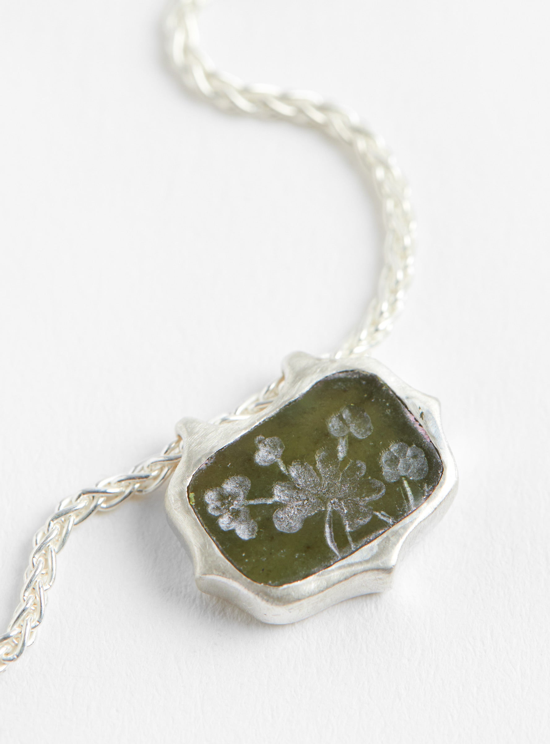 The Geranium Pendant from Lizzie Ames comes in silver and features a hand carved green soapstone motif. Framed in a petite sterling silver setting, the pendant is finished with a delicate wheat chain. Each soapstone element is individually carved, giving subtle variation in the leaf pattern and surface.