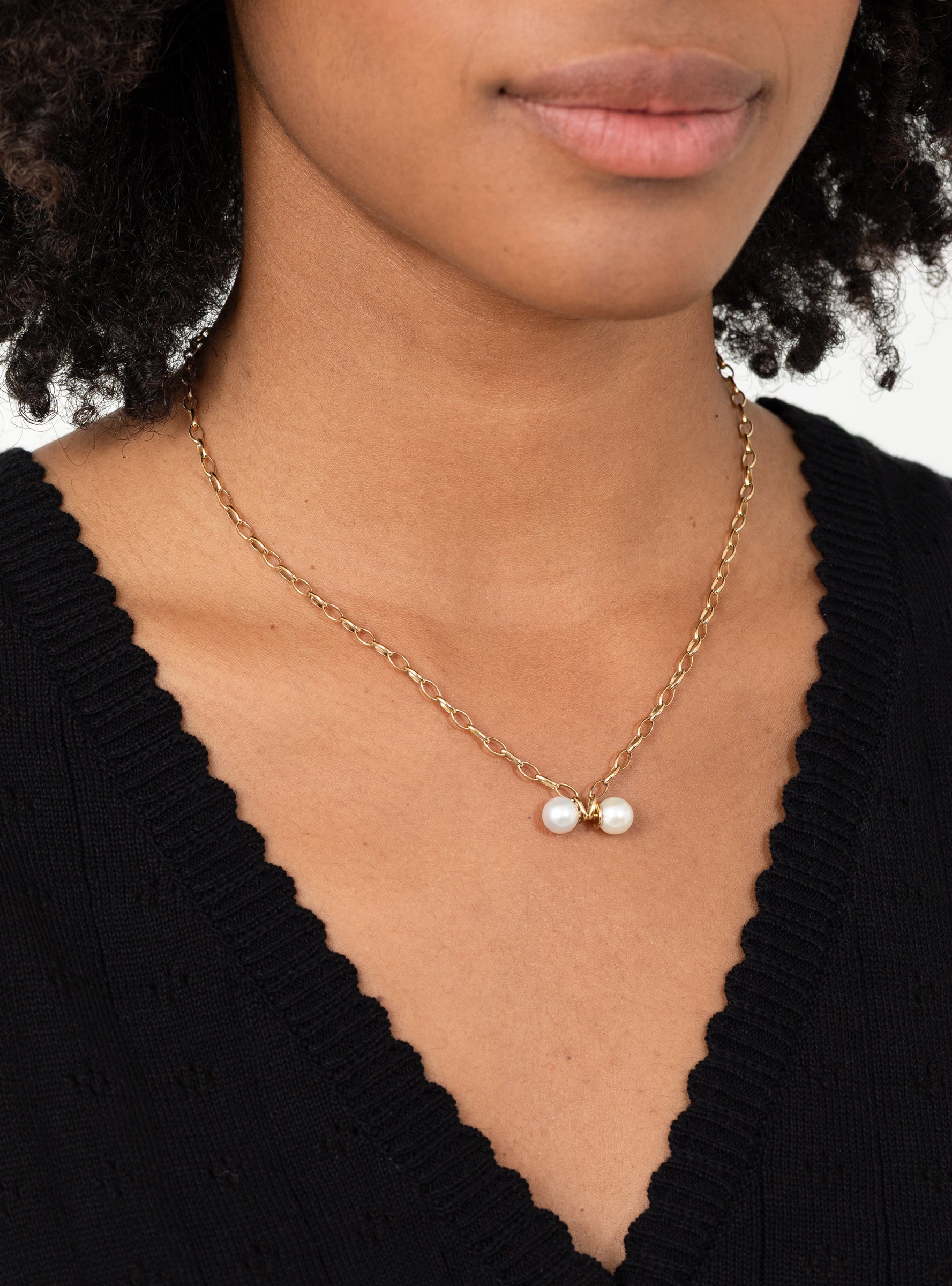 This Gold Chain necklace is handmade in Spain from gold-plated silver and is finished with two fresh water pearls. The fastening design allows you to thread one pearl through the chain to secure it to the other, revealing a ribbon like finish.