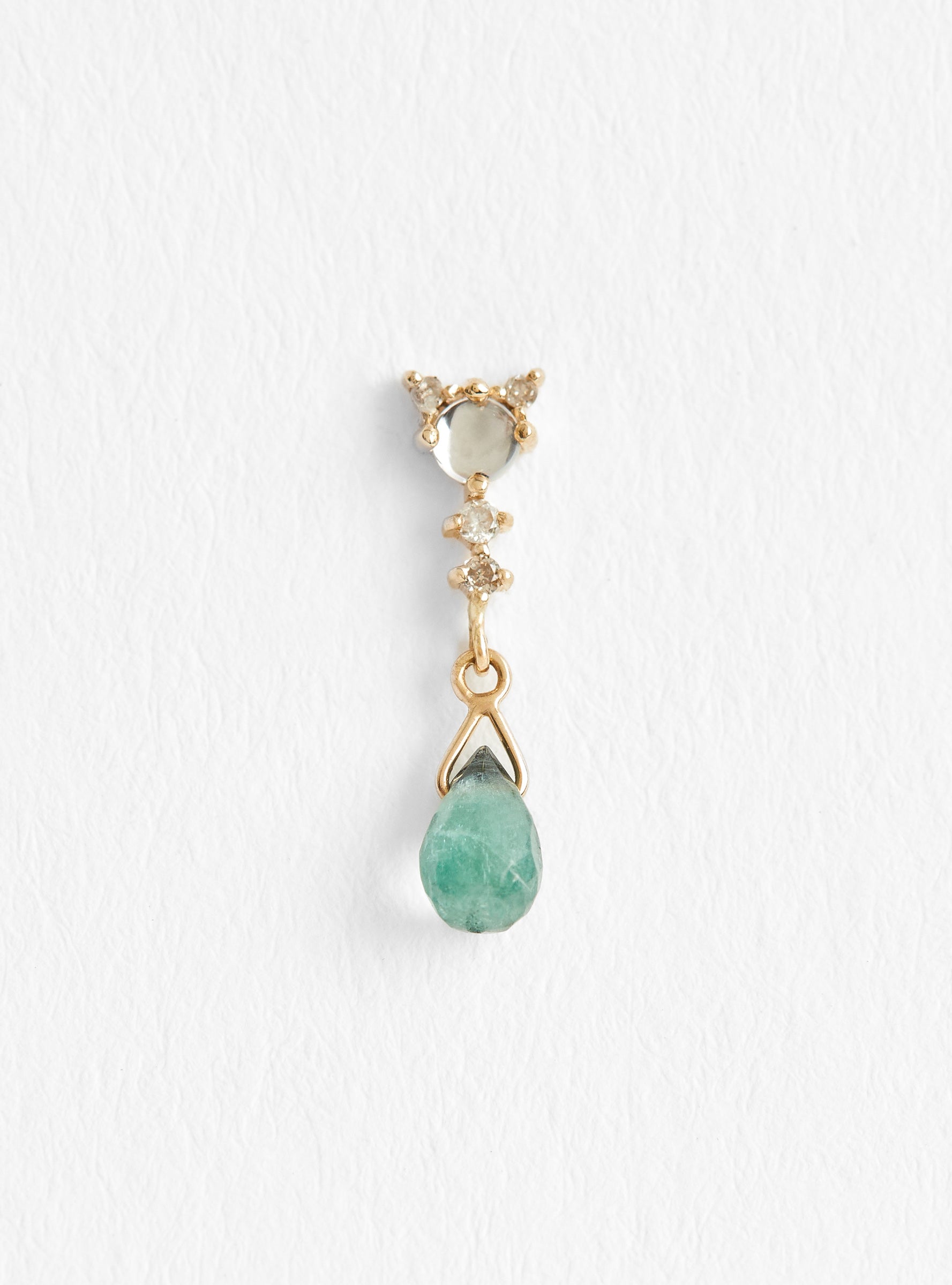 Inspired by travels across India, France, and Belgium, Celine Daoust's jewellery blends ancestral craftsmanship with cultural influences. This 14K light yellow gold single earring features green Tourmaline, Moonstone, and Diamond. Tourmaline, a favourite of Celine's, is known for its spiritual and healing powers, including magnetic and protective properties. Blue Tourmaline evokes tranquility and enables mental exploration of higher consciousness.