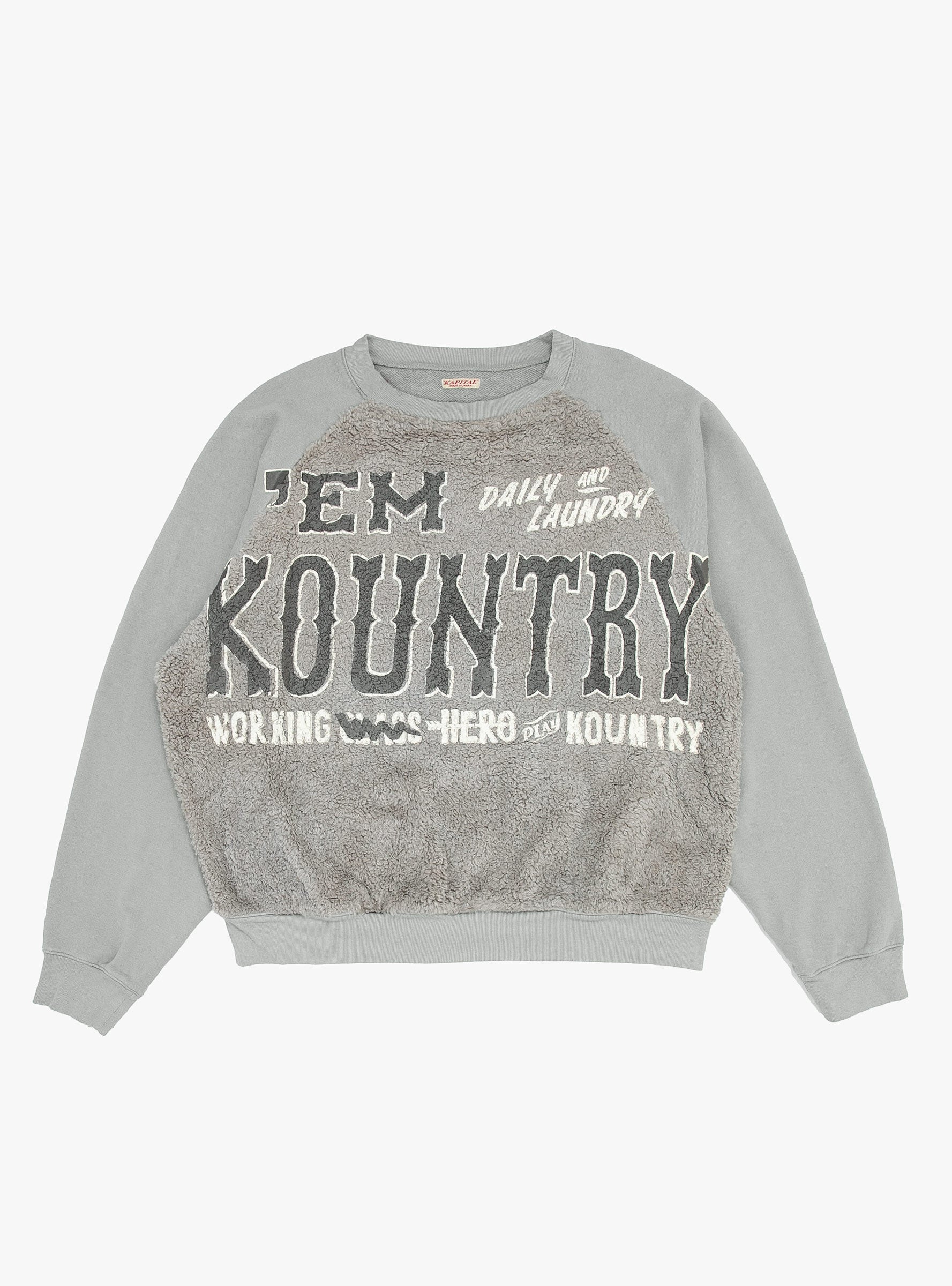 The Grizzly Fur Sweatshirt from Kapital arrives in a grey. Made in Japan from a double-fabric, the sweatshirt falls to a regular fit. The front is cut from a soft fleece and features painted Kountry branding. The rest of the sweatshirt is cut from a soft cotton and is finished with ribbed trims.