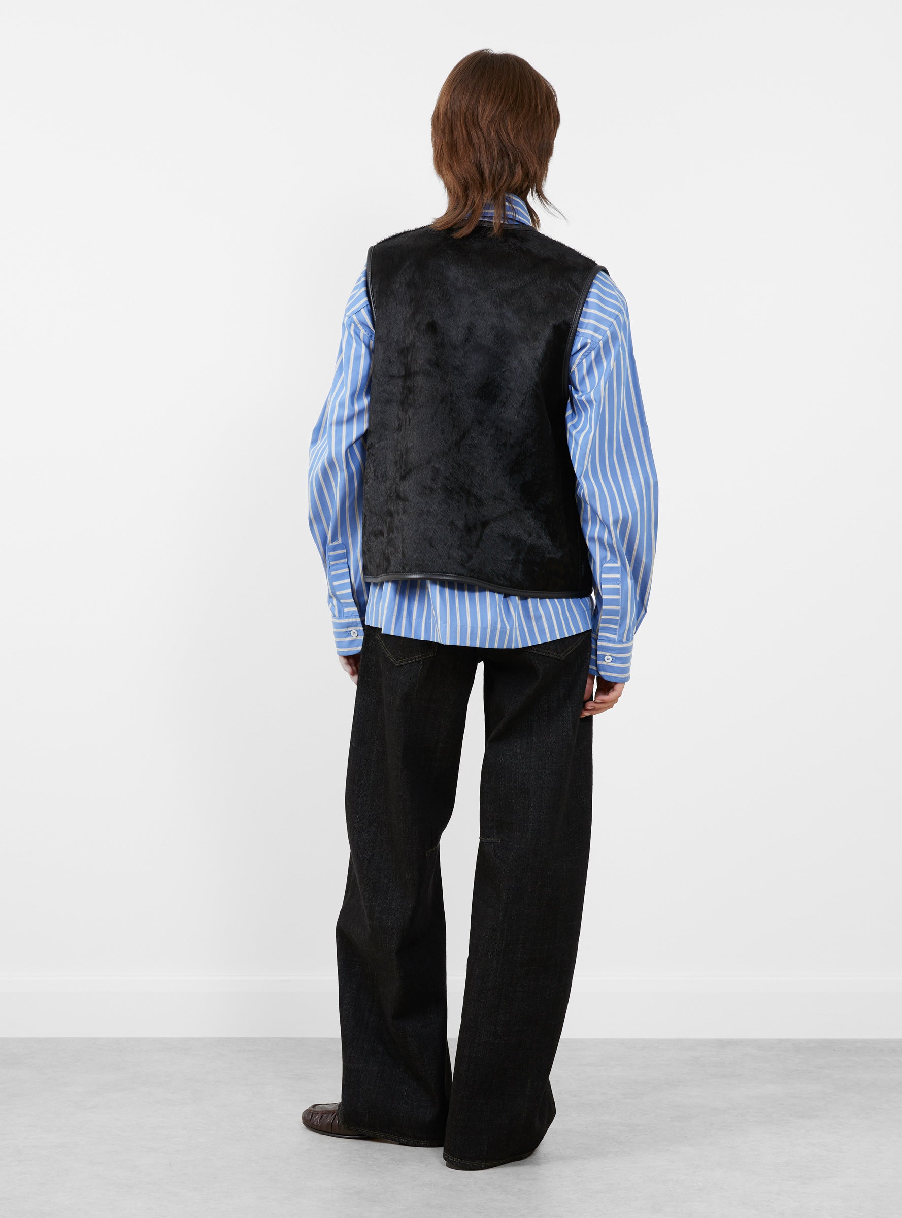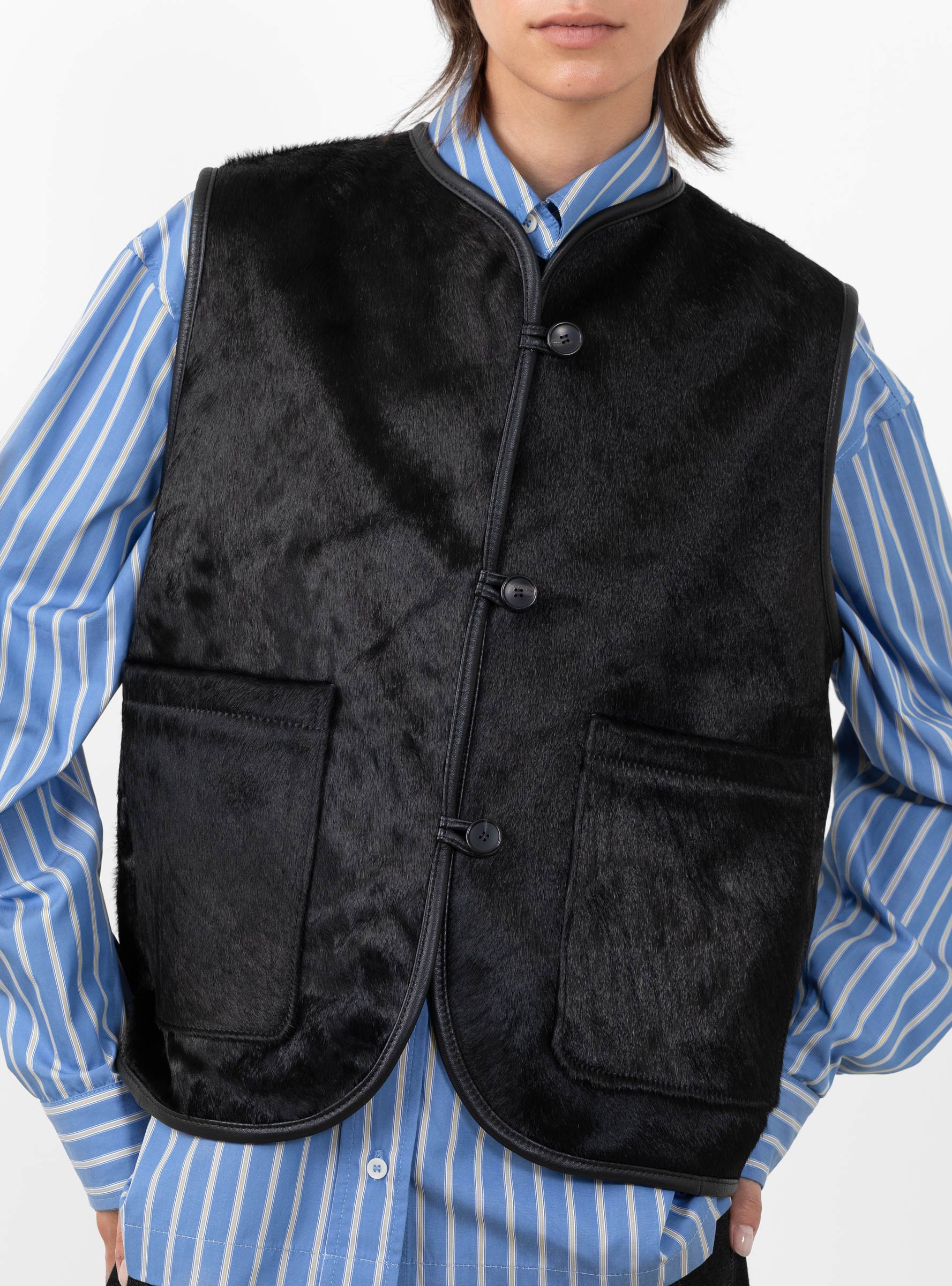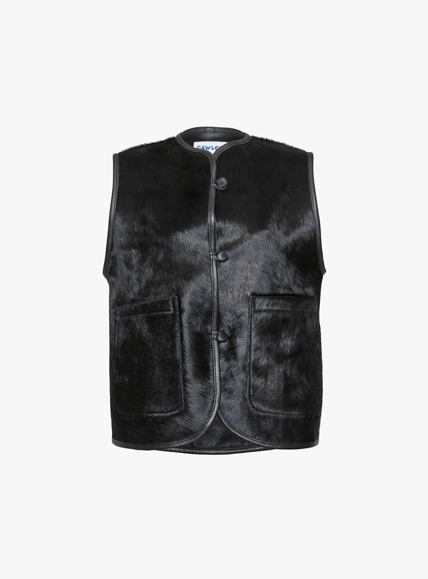 The Hair On Leather Hide Vest from Cawley arrives in Black. This sleeveless vest is crafted in London from 100% sheepskin with a hair on finish. Featuring black sheepskin on the body, it includes a patch pocket, smooth nappa leather binding, and a horn button front closure.