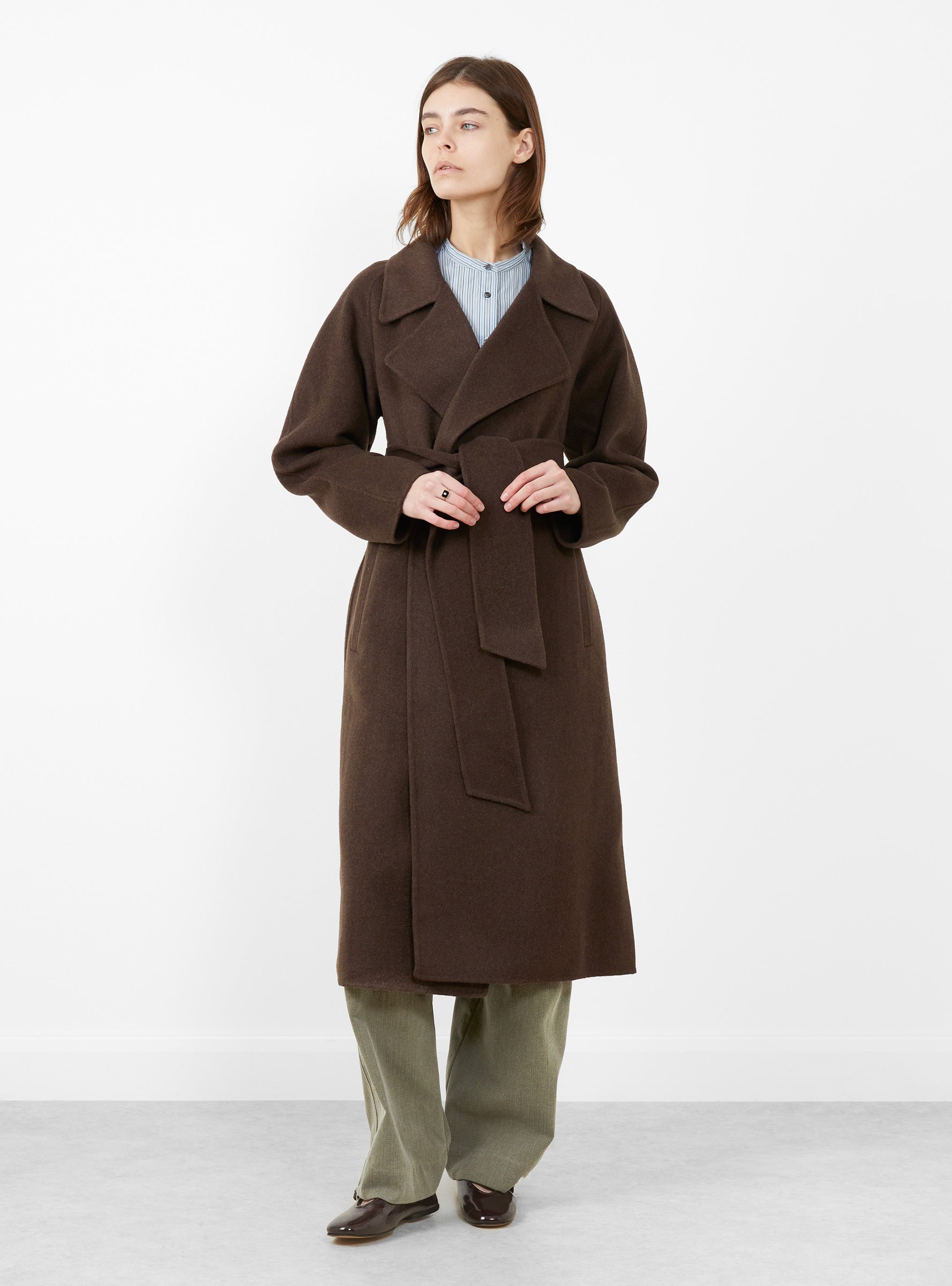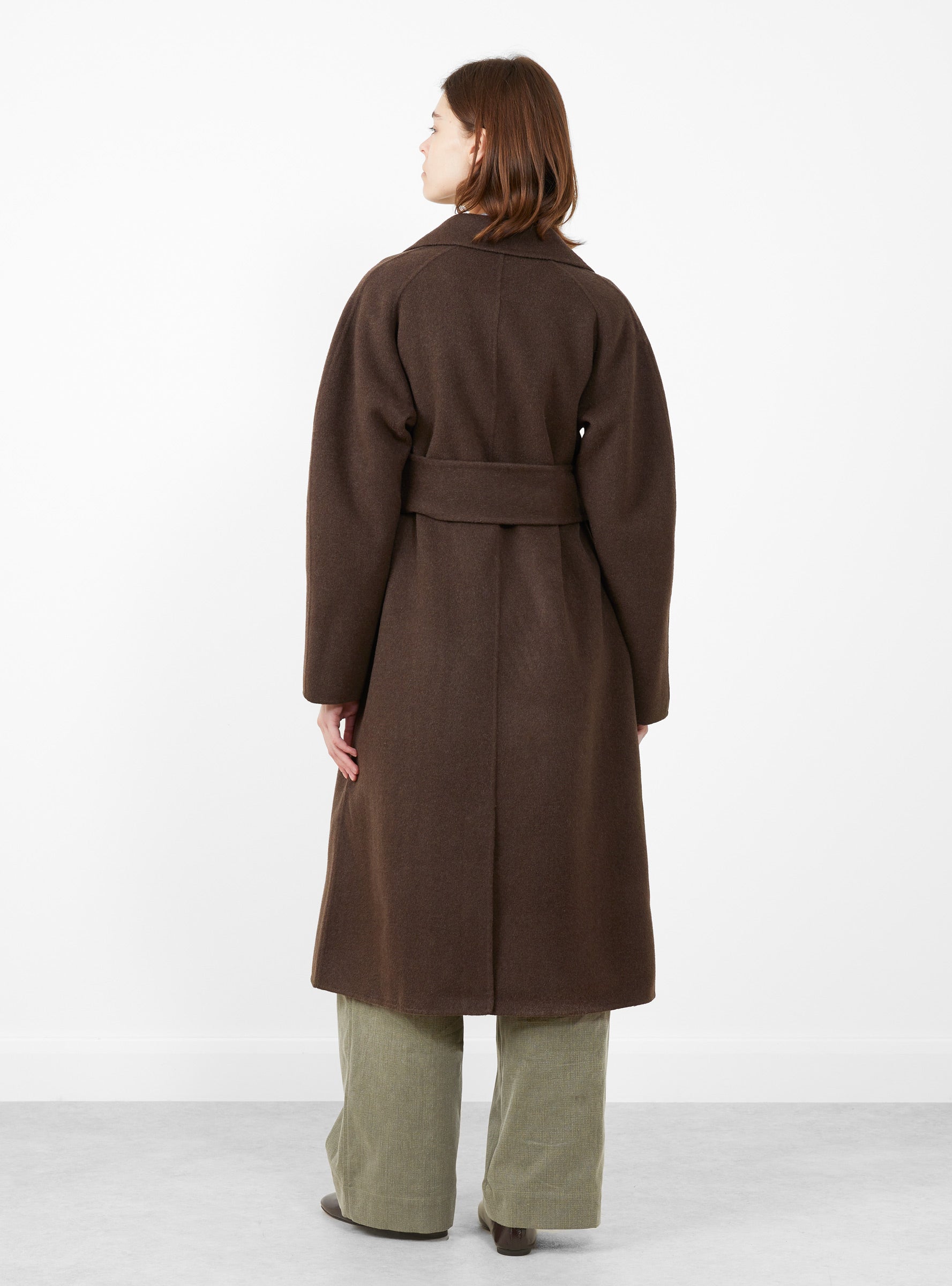 The Harvard Coat from Soeur arrives in Khaki Brown. Made from thick double-faced wool with a polyester lining, it is designed with a high collar and removable belt for adaptable styling. Raglan sleeves, a back hem vent, and welt pockets at the sides complete the silhouette.