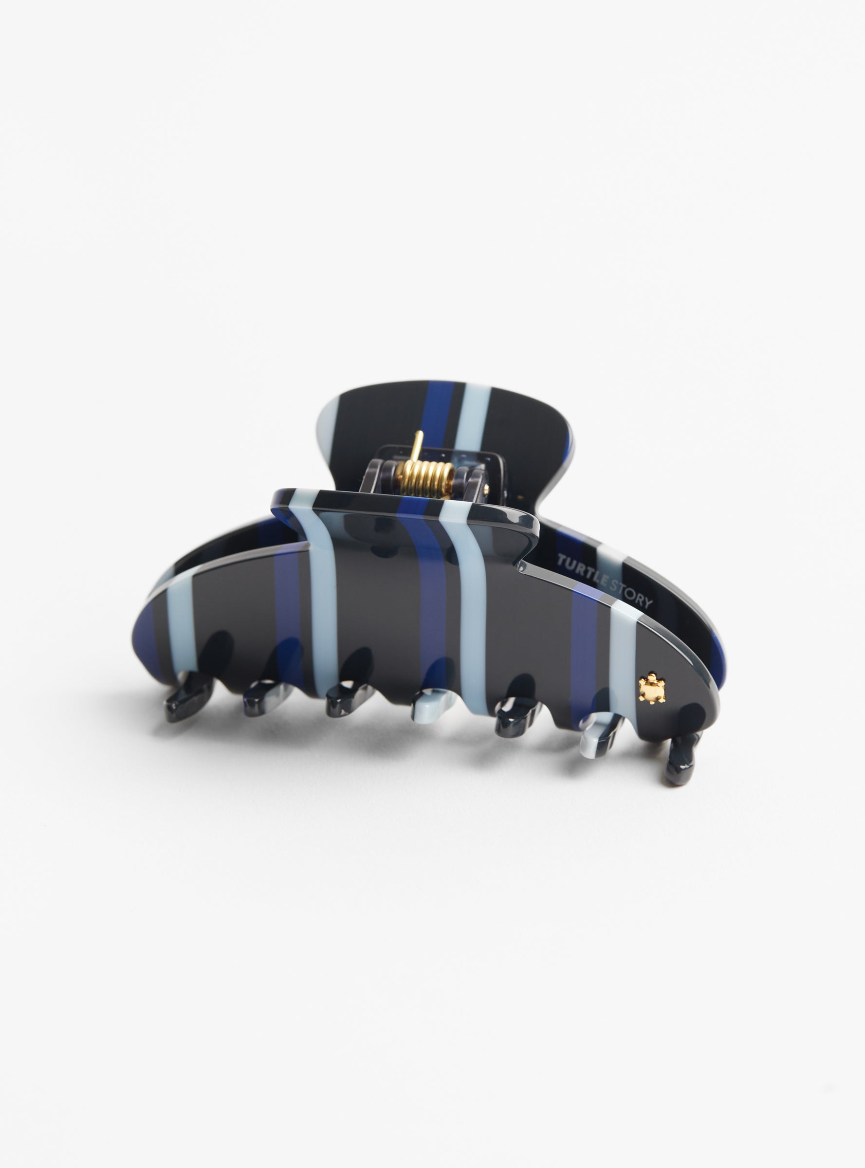The Iconic Medium Claw Clip Beach Stripes from Turtle Story comes in black with a blue stripe pattern and is handmade from Italian cellulose acetate. The claw clip features a hand inserted Turtle Story logo and a polished finish for durability and style.