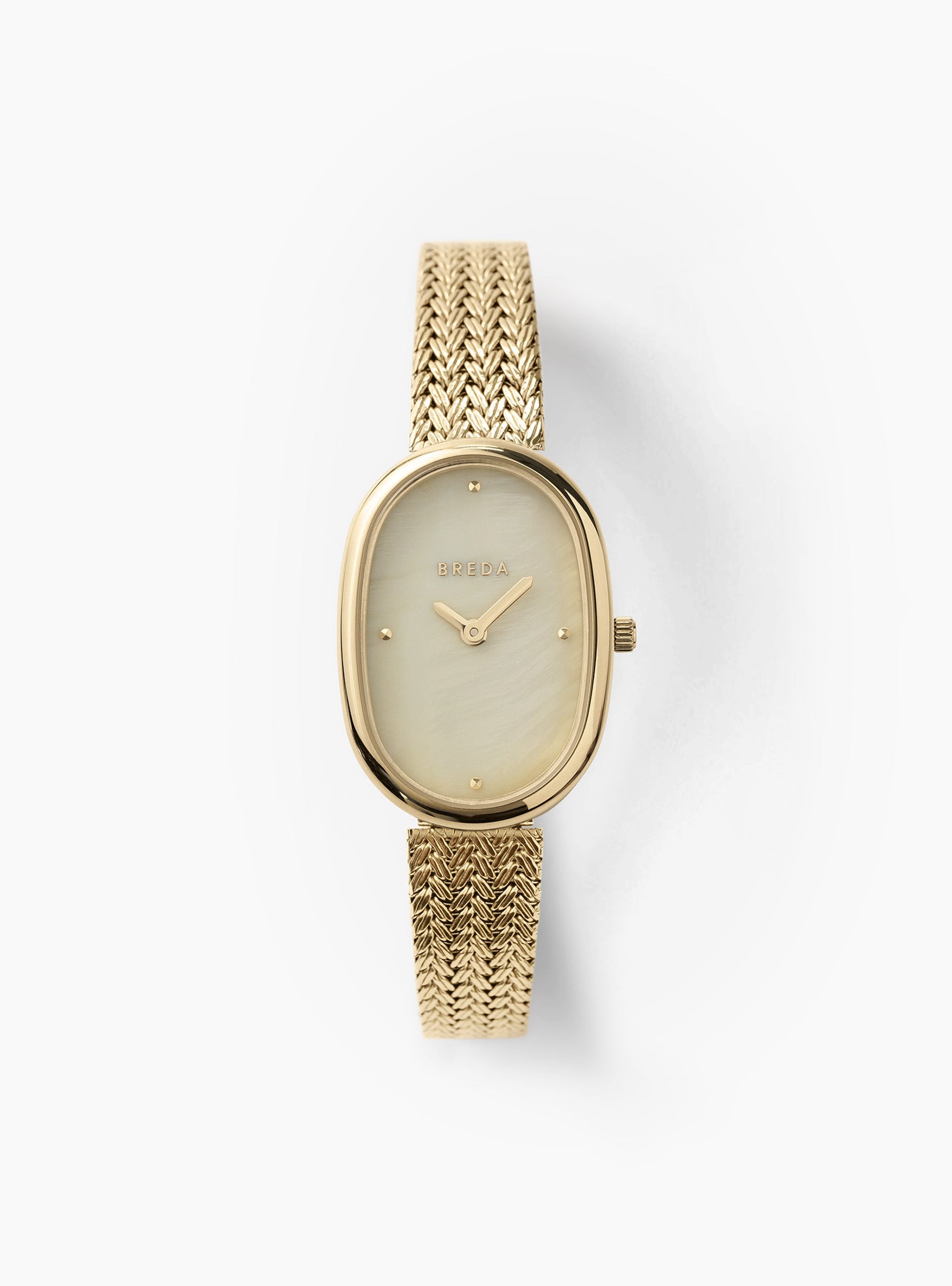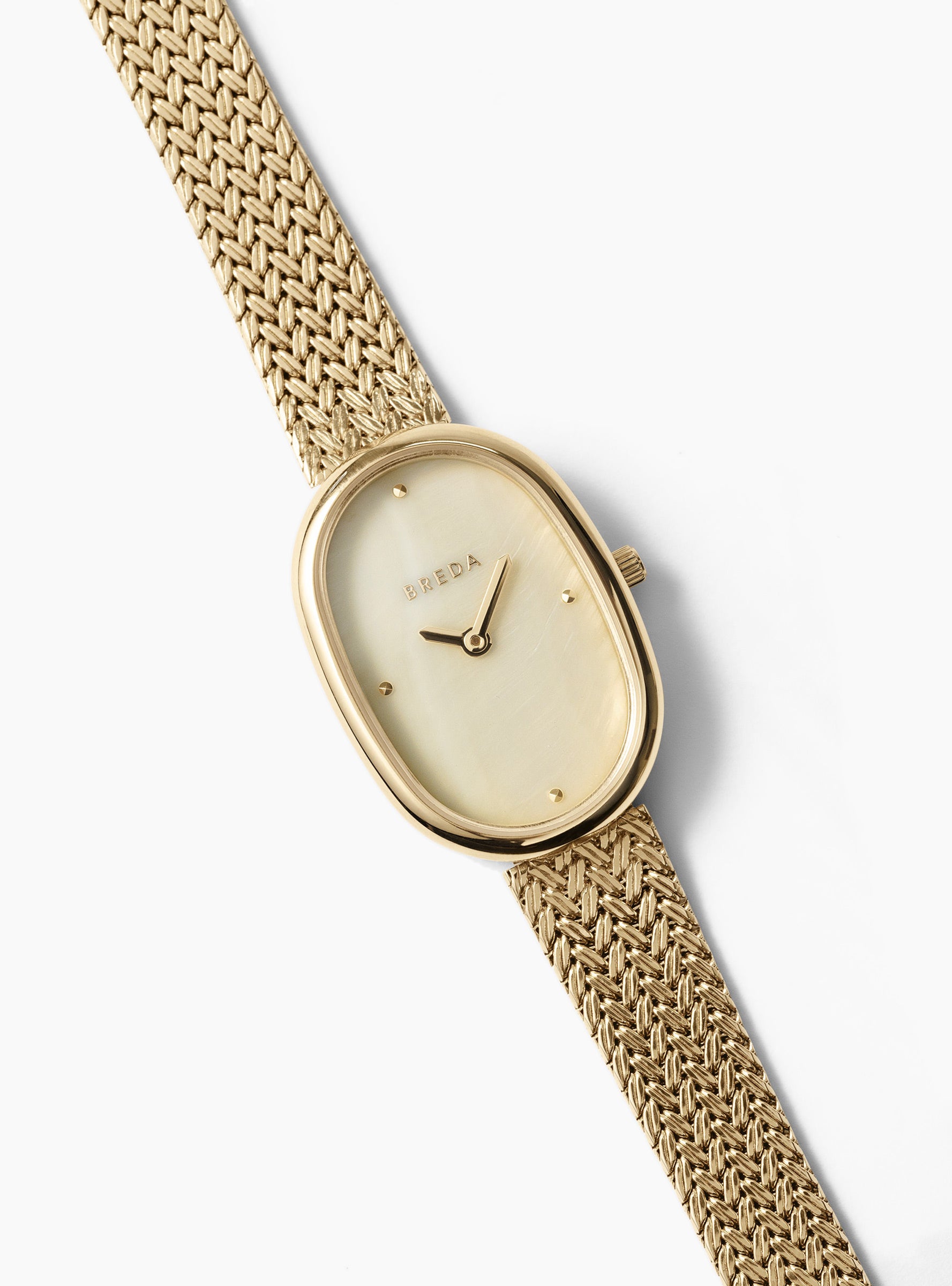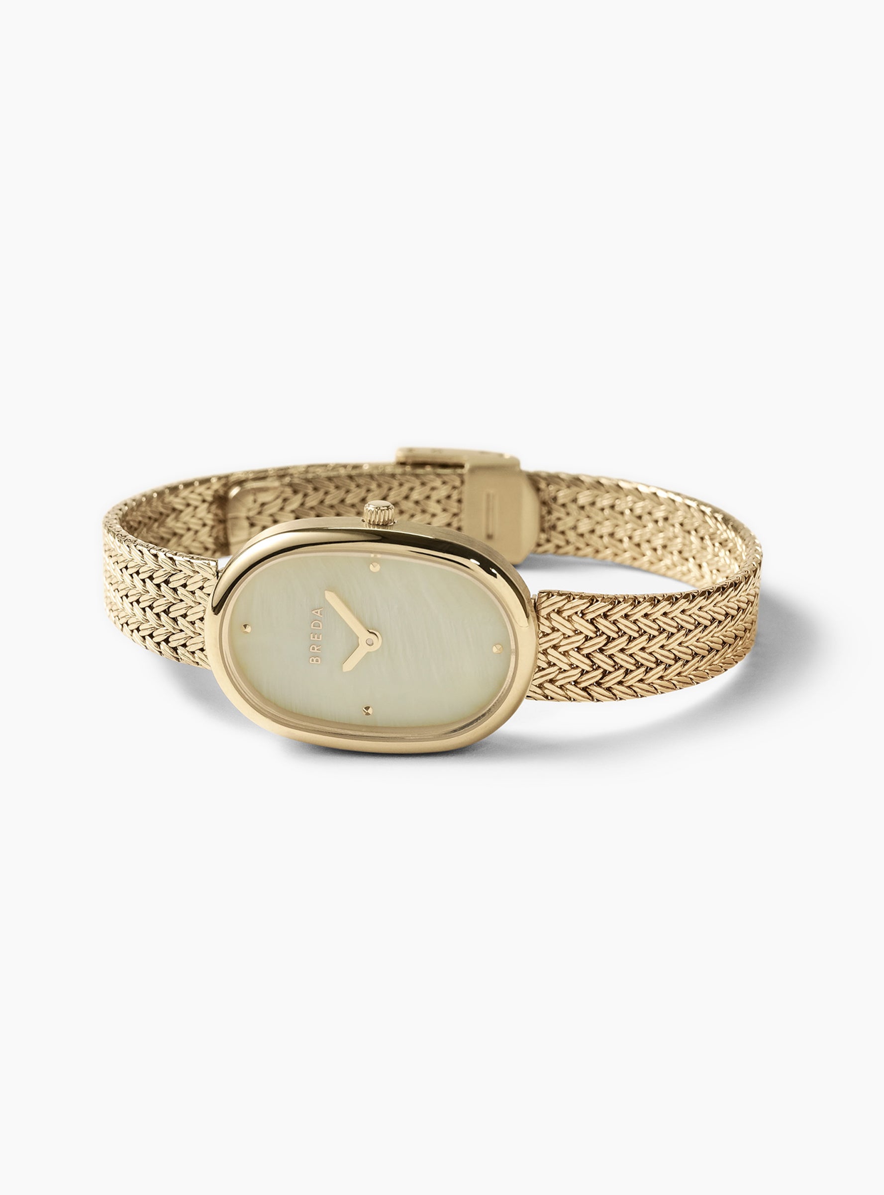 Made with an 18kt gold-plated case and a tapered woven mesh bracelet, which fastens with a quick release clasp, this gold Jane tethered watch from BREDA features an elegant champagne mother-of-pearl dial and Japanese-made Miyota Quartz movement.