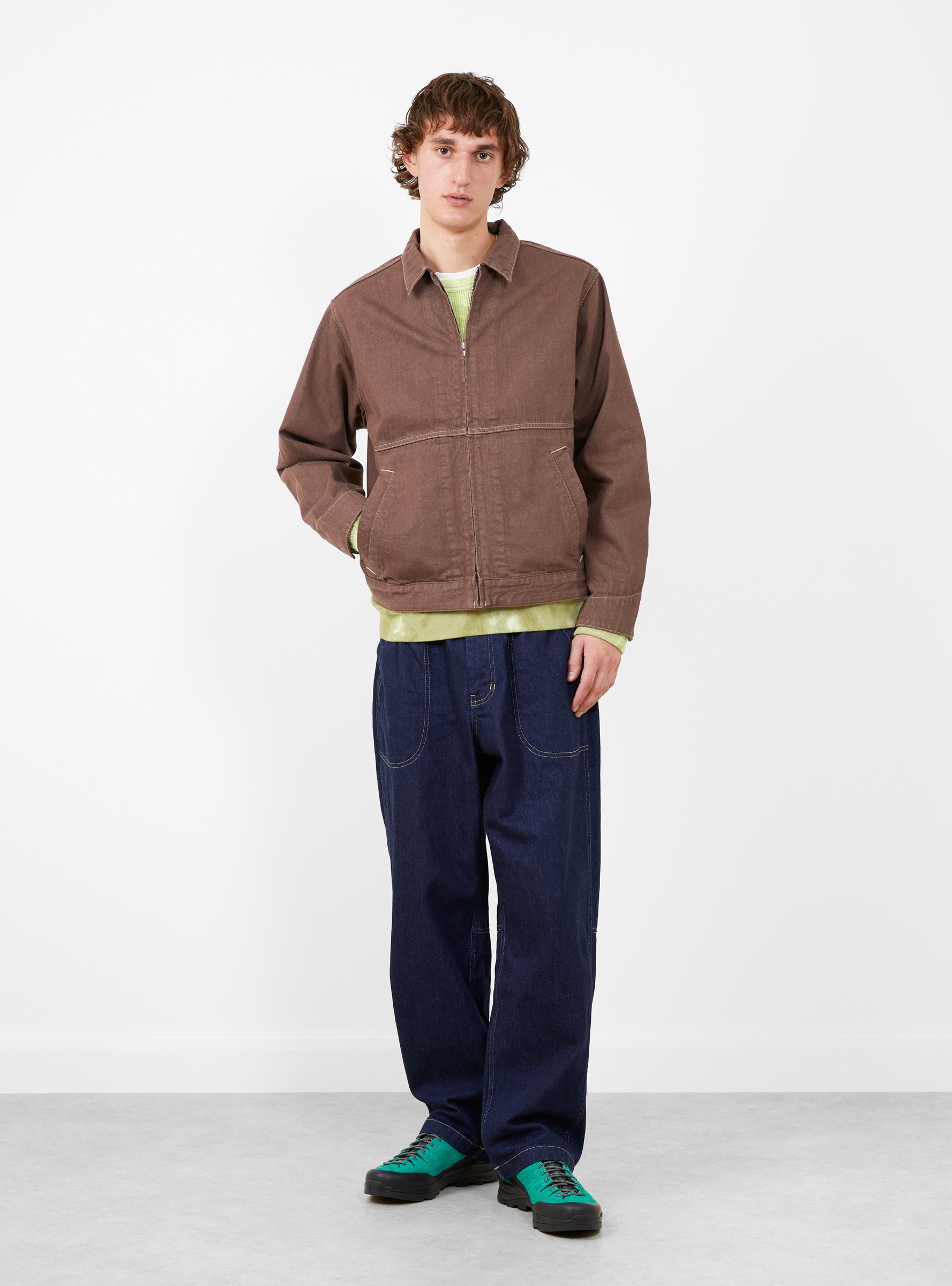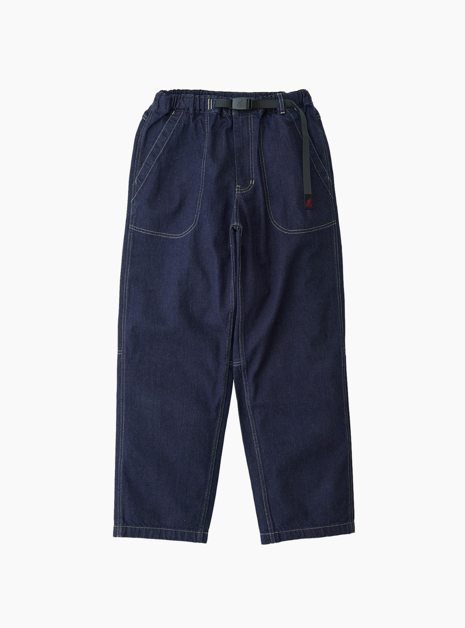 The Japanese Slub Denim Pant in Indigo from Gramicci is made from 100% Japanese 12oz slub denim. Woven with irregular knots, the fabric has a distinctive surface texture. Designed with an elasticated waistband and integrated nylon belt, the trousers feature a roomy silhouette with fatigued pockets and a gusseted crotch for ease of movement.