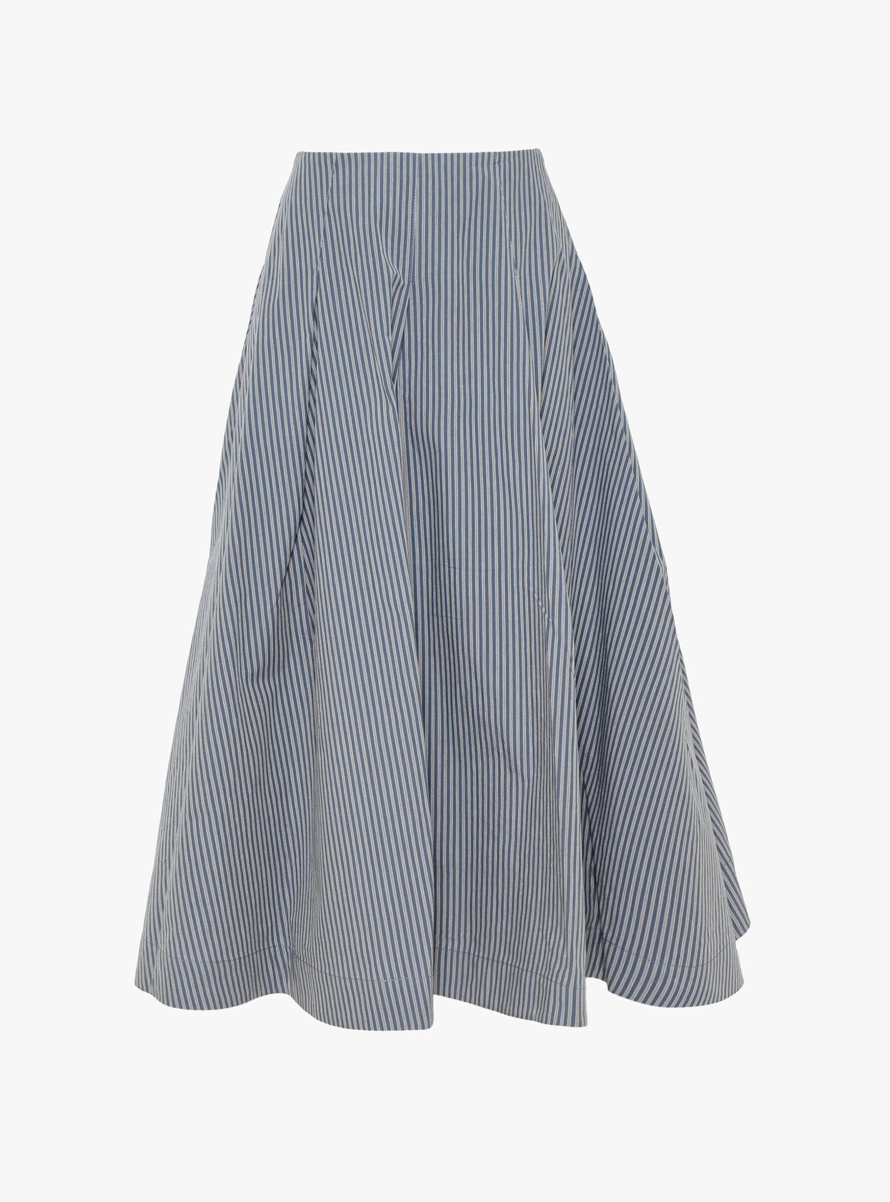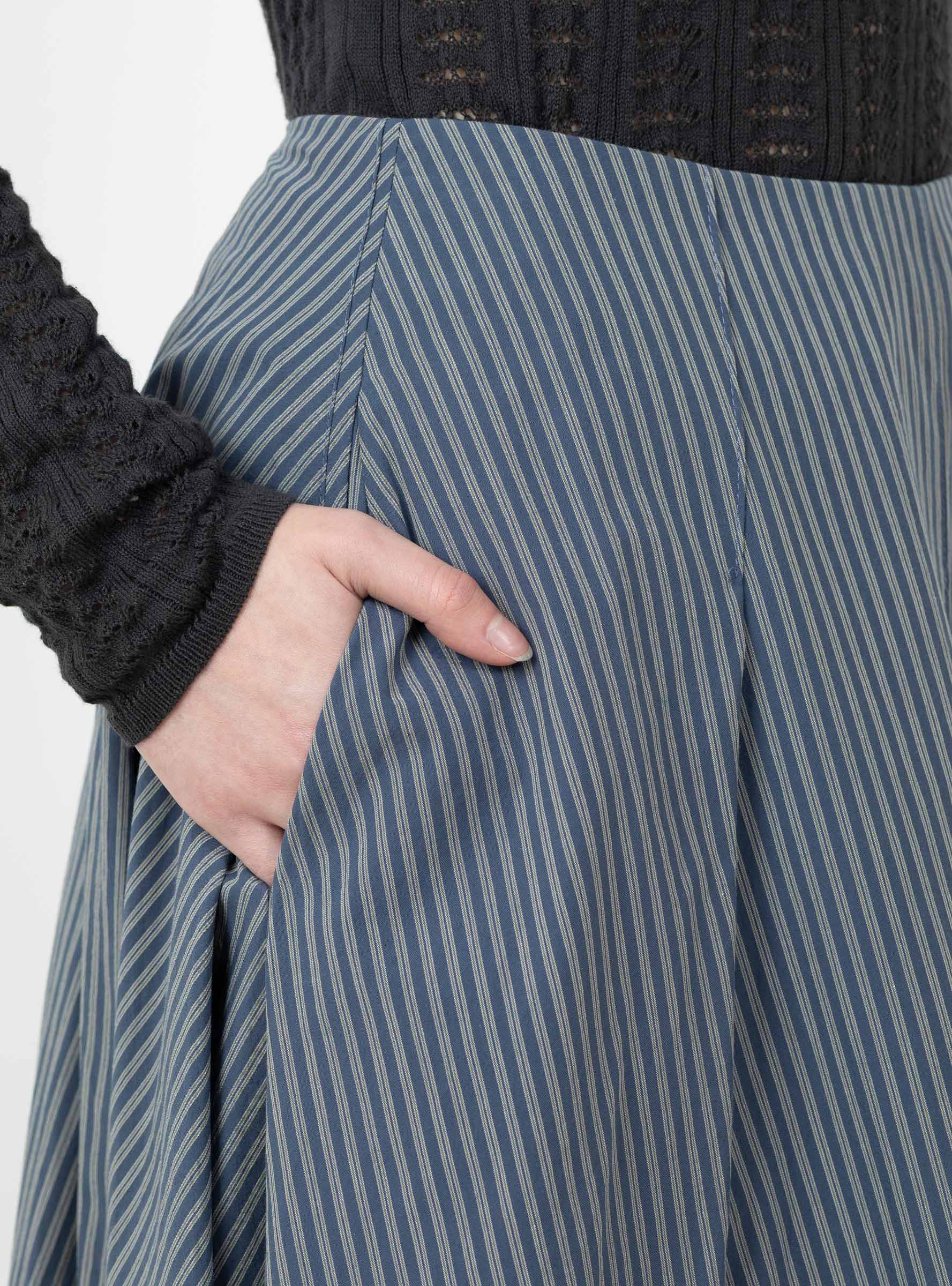 The Japanese Typewriter Cotton Longline Stevie Skirt from Cawley comes in Navy and Camel Stripe. Made in the UK from soft cotton, the skirt has a full-length, floaty A line silhouette that moves easily through the hem. A high waist and subtle panel detailing enhance the shape, while the lightweight typewriter cotton gives structure without restricting movement.