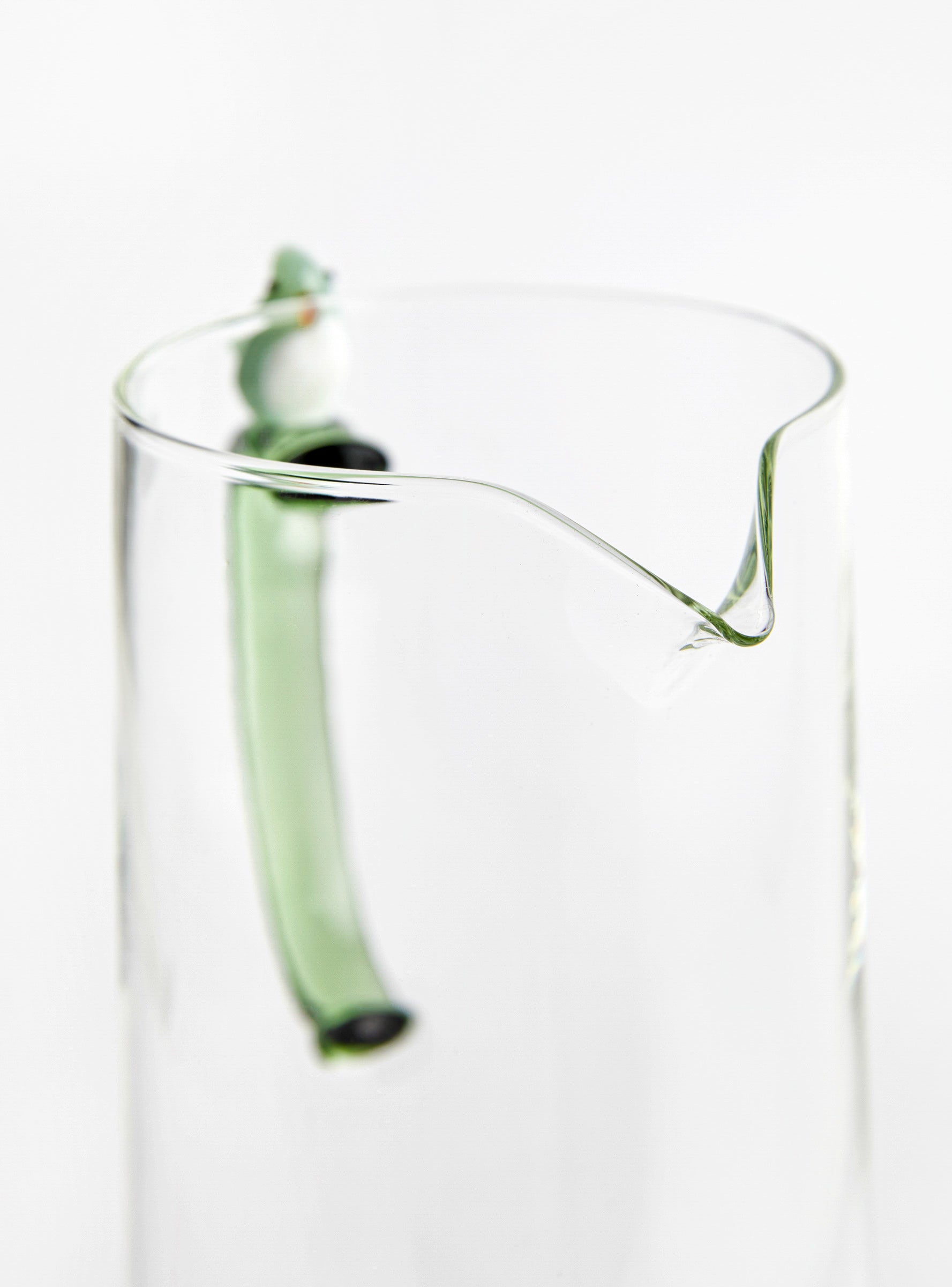 The Bird Jug was designed as part of the 'Bird Collection' for Ichendorf Milano by Japanese designer Tomoko Mizu. It is handmade from borosilicate glass and features a delicate green bird perched on the handle.