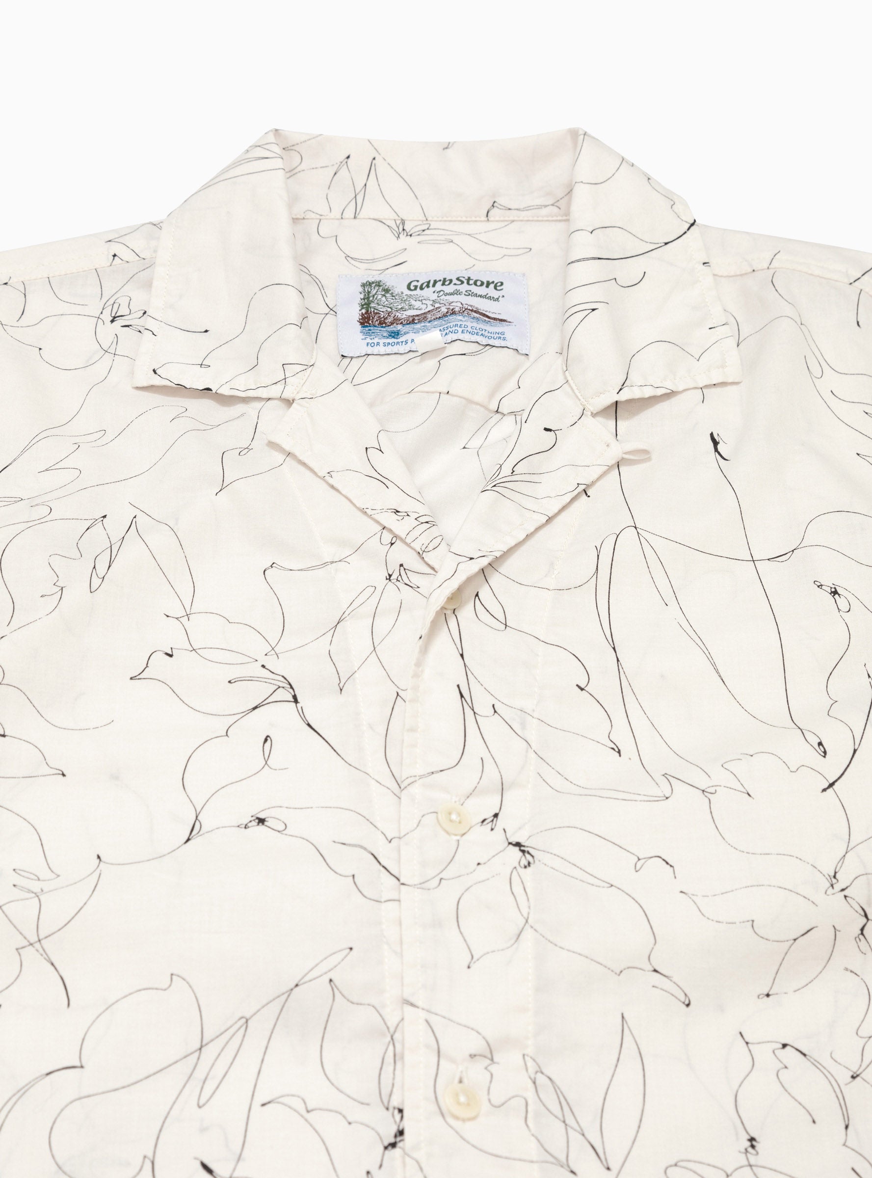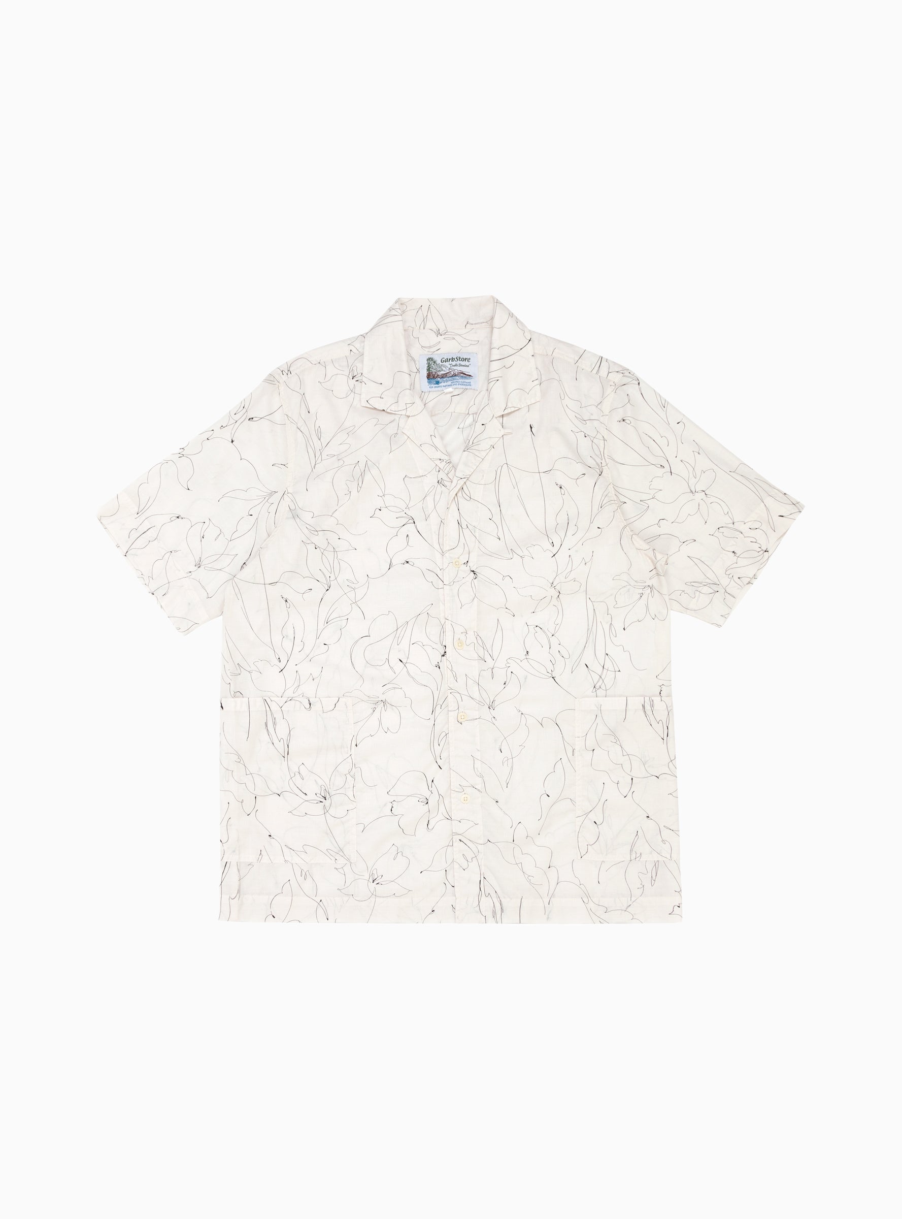 Made from Japanese cotton, this white floral Kabana shirt from Garbstore’s SS23 collection is cut to a relaxed silhouette with a two-way spread collar and features a patch pocket at the chest. Corozo nut buttons fasten the front.