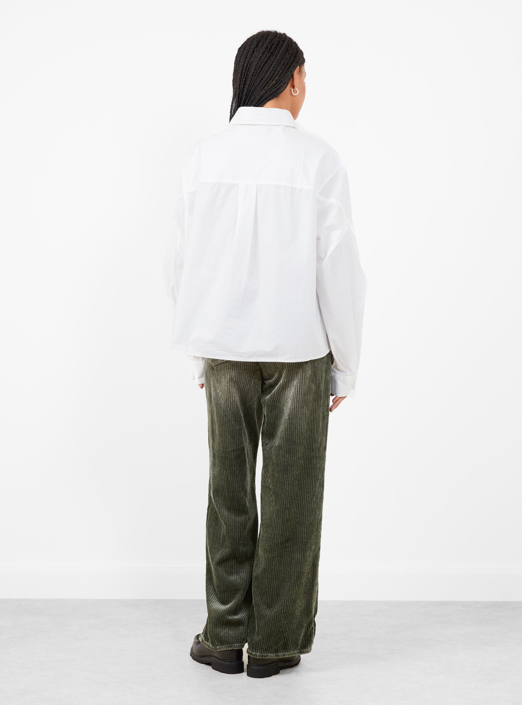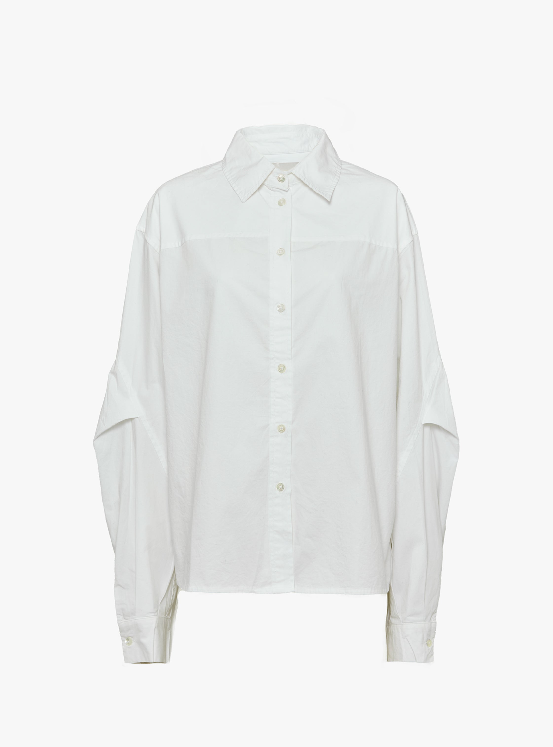 The Kenza Shirt in White from Bellerose is a relaxed cotton poplin button-up. This shirt features a pointed collar, long sleeves with subtle pleated detailing, and a clean, minimal finish with mother-of-pearl buttons.