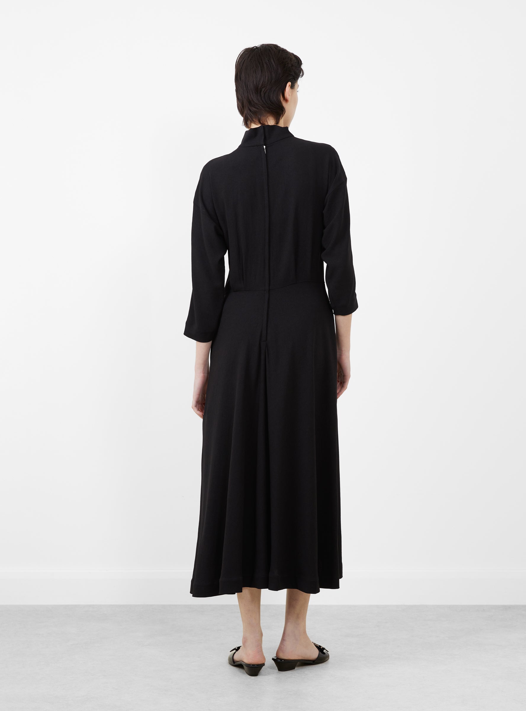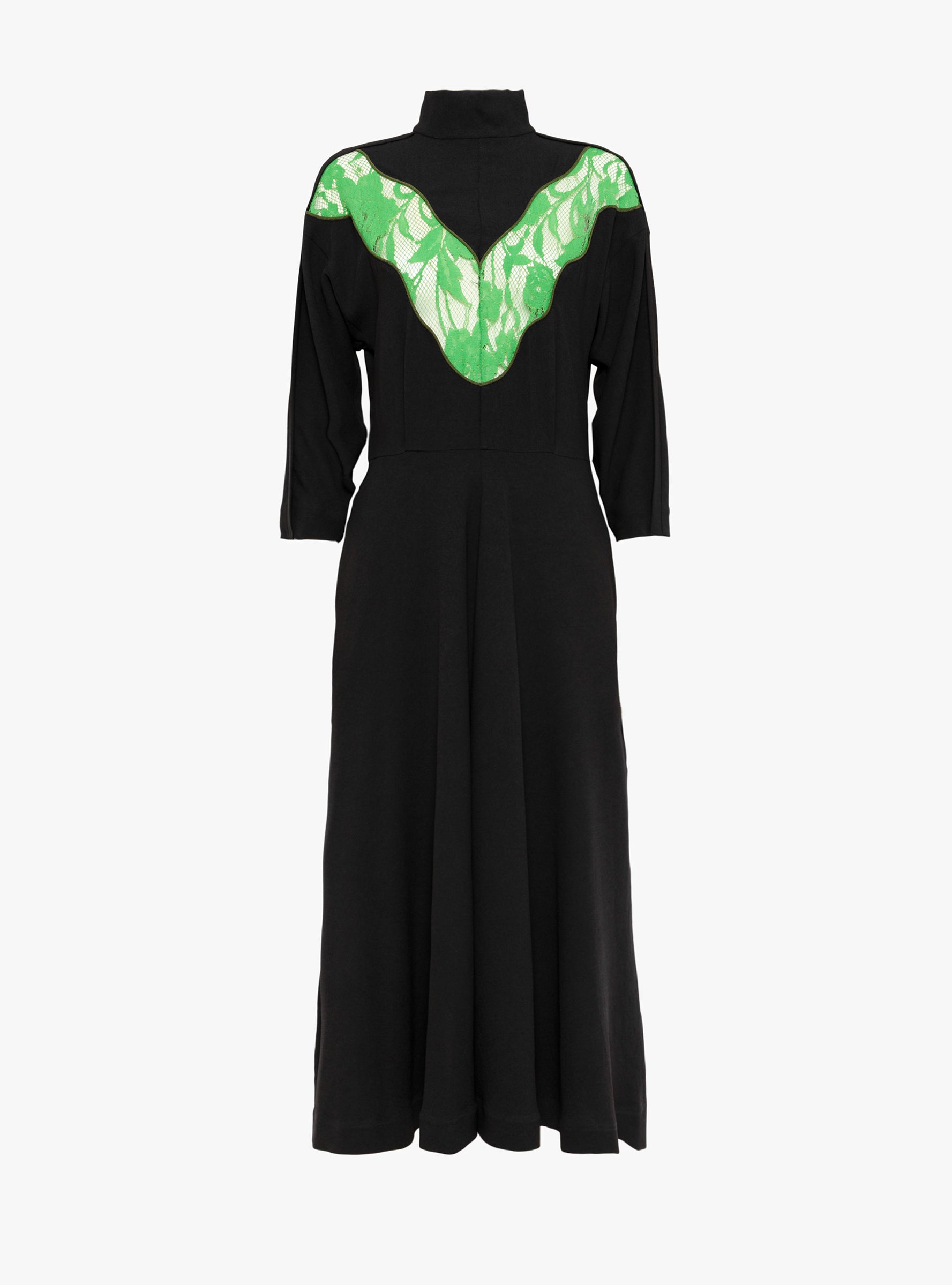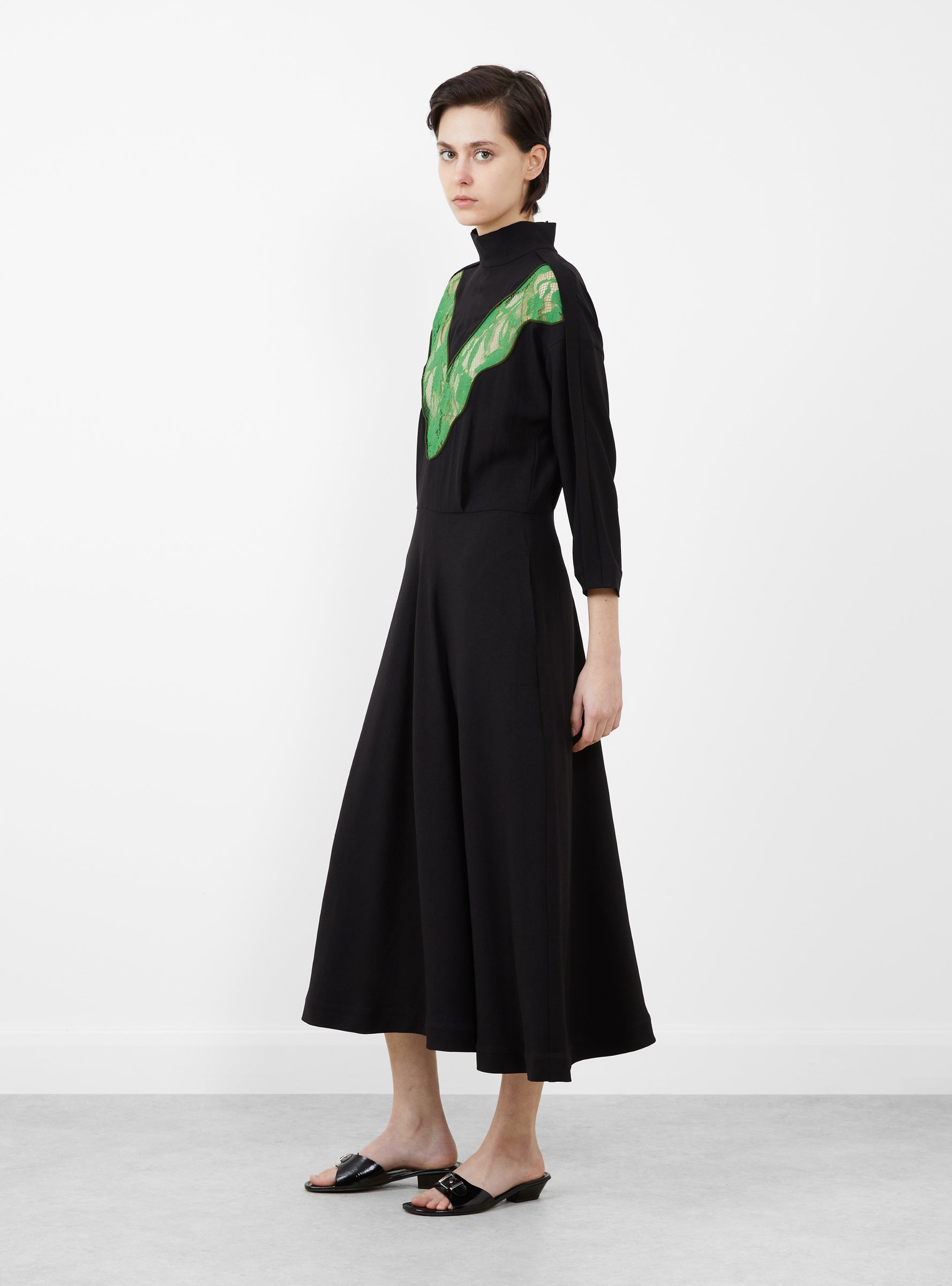 The Lace Dress from TOGA PULLA comes in Black. Made in Japan from an acetate and polyester blend, the full-length dress has a high neckline and cropped sleeves. Green lace paneling runs through the front, while the silhouette falls into an A-line skirt for a clean, elongated shape.