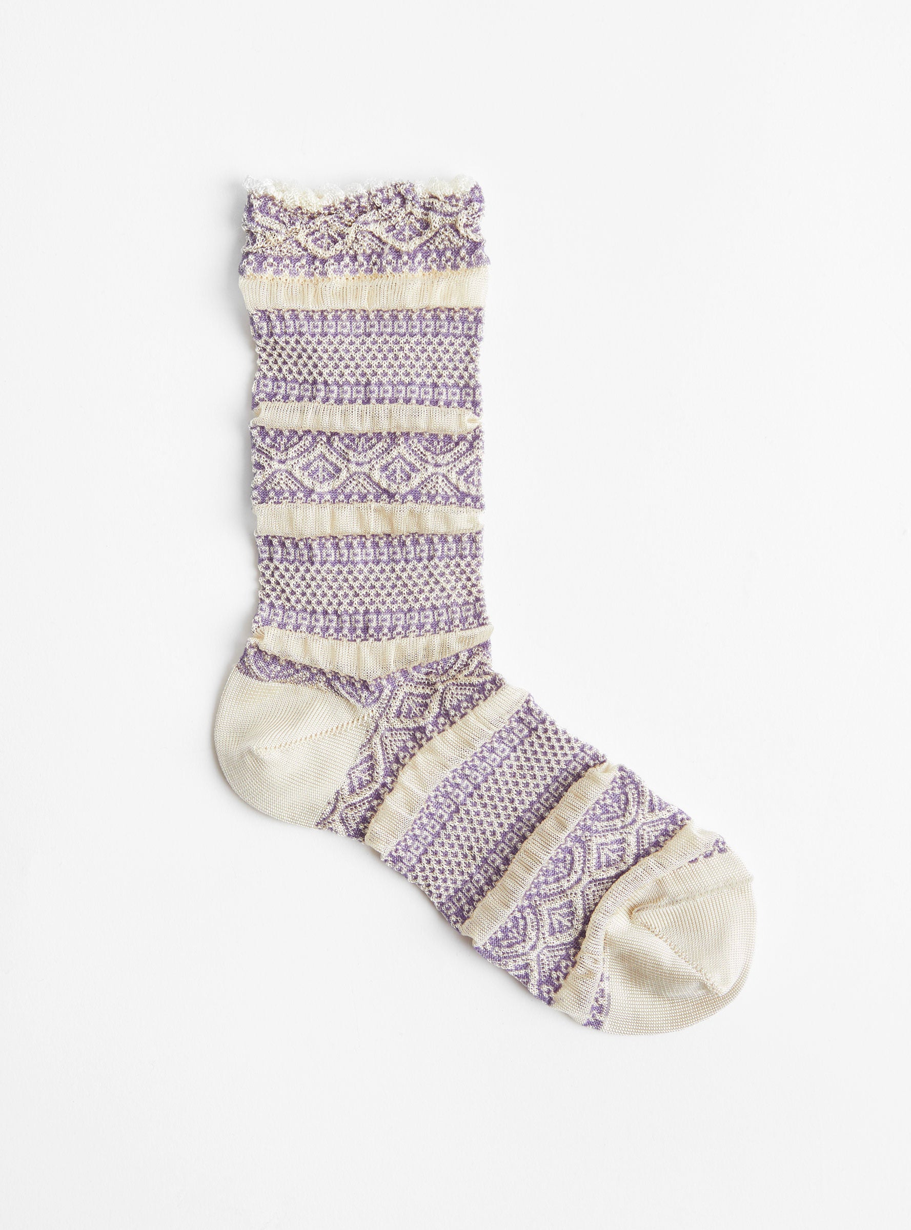 The Lacy Socks from Maria La Rosa come in Lilac and are made from a soft viscose blend. These patterned socks feature a delicate design, offering a lightweight and comfortable fit.