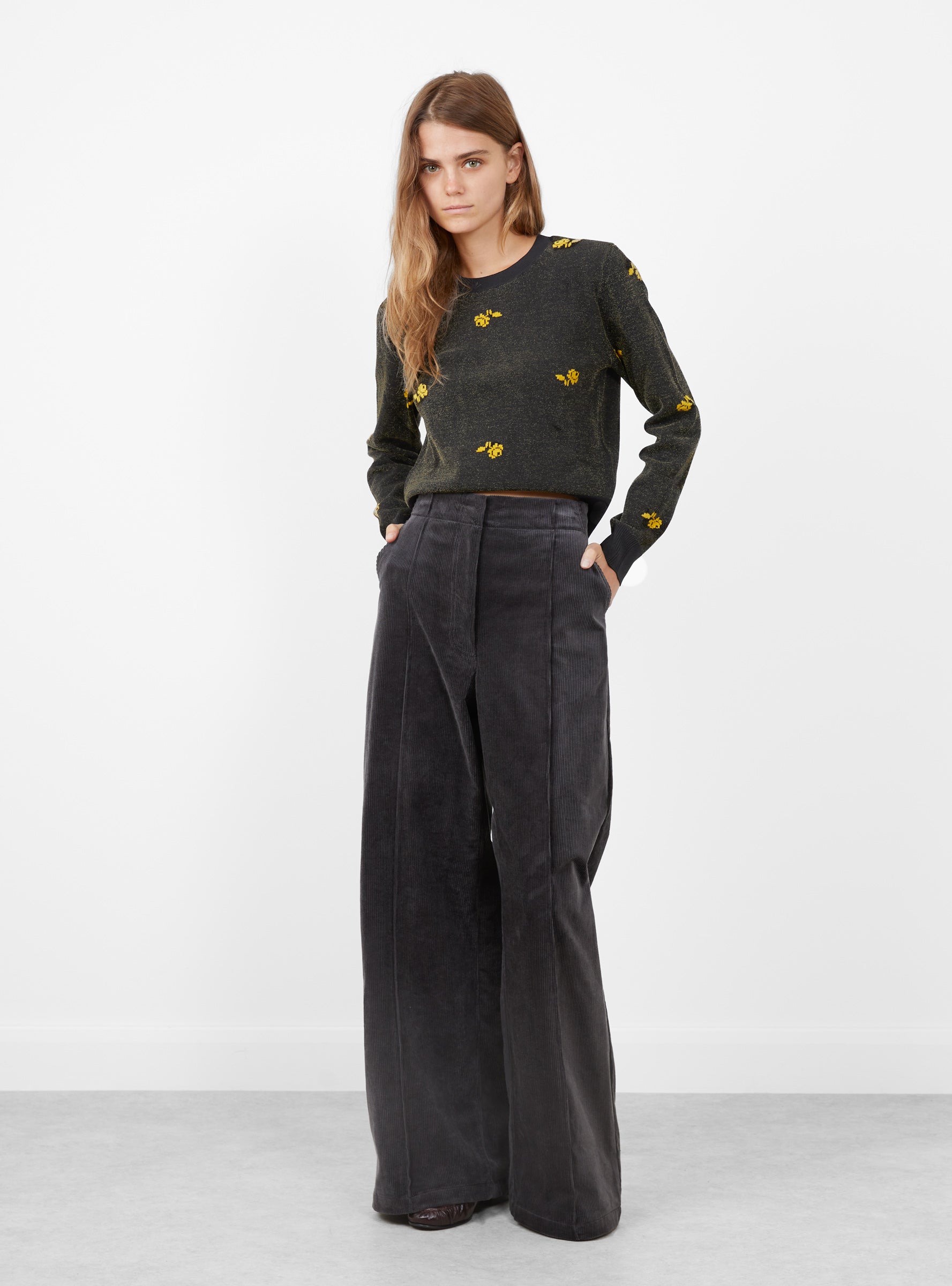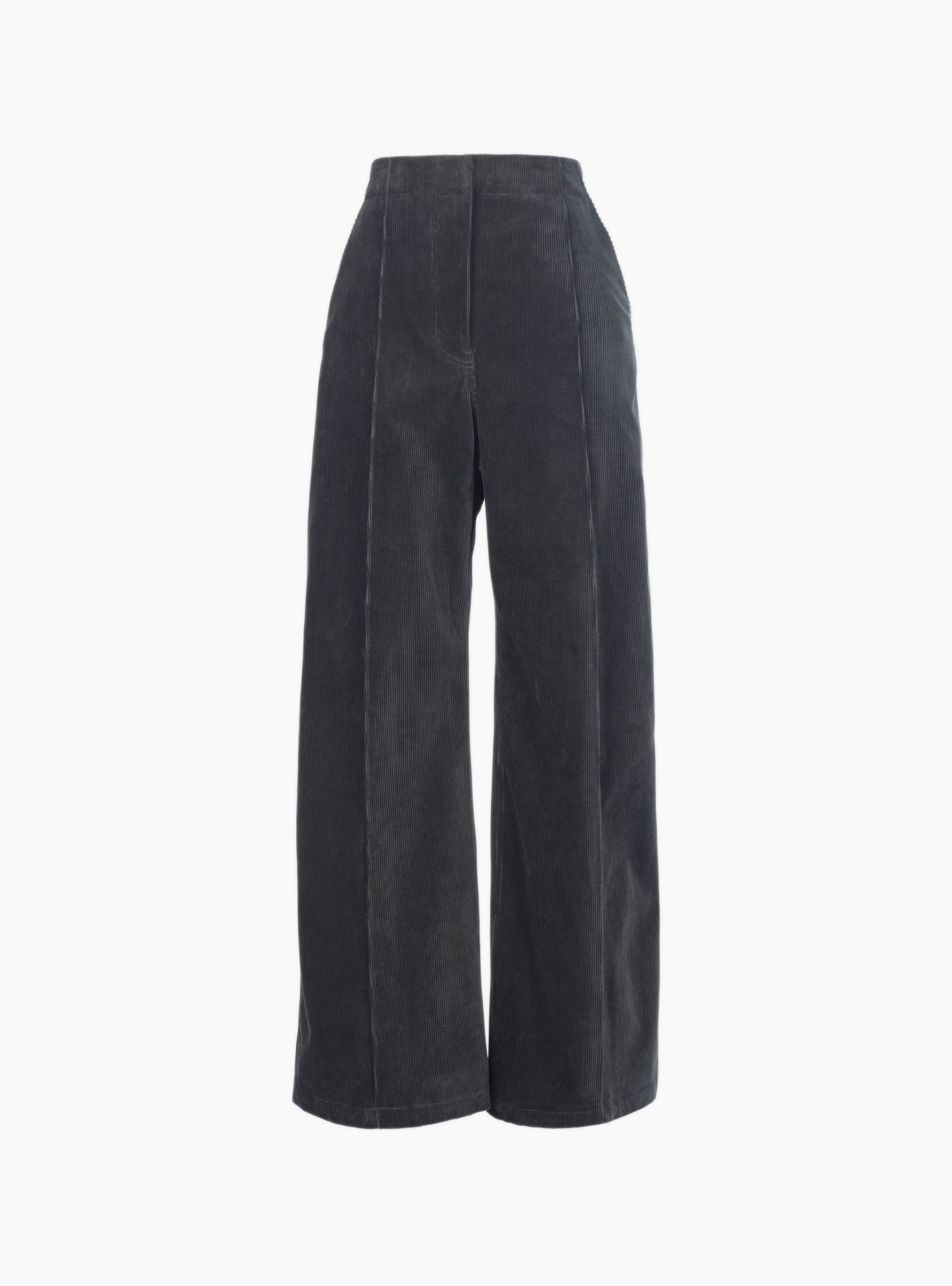 The Lanett Corduroy Pant in Carbon from Rachel Comey is cut in washed black corduroy with a high-waisted wide-leg silhouette. Vertical seam detailing runs along the leg to create an elongated line, with side pockets completing the style.