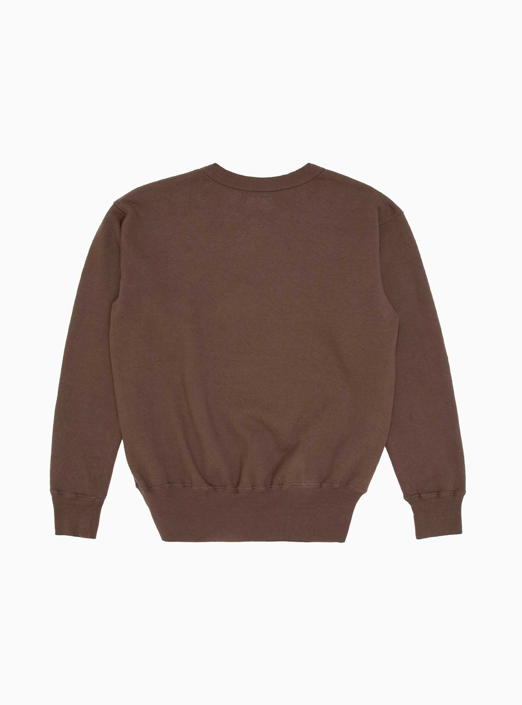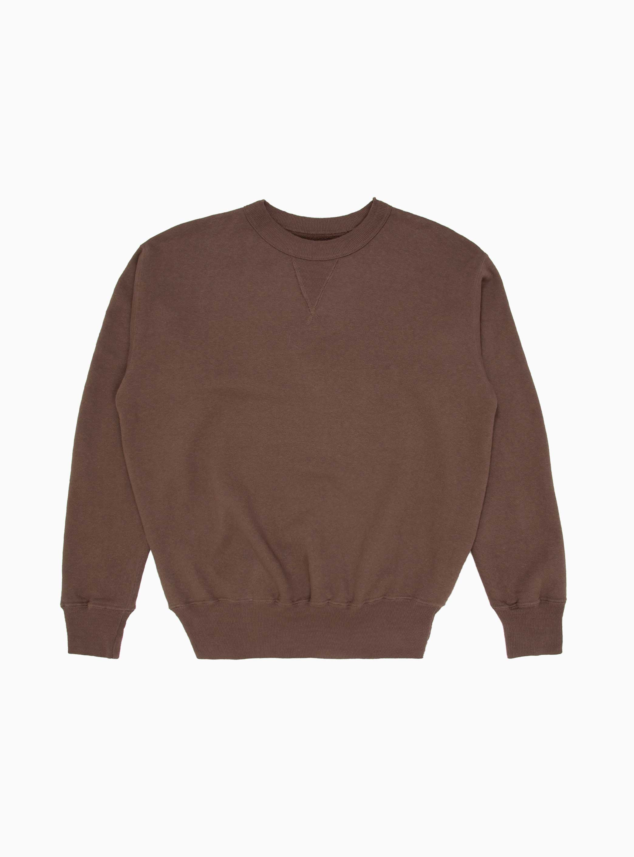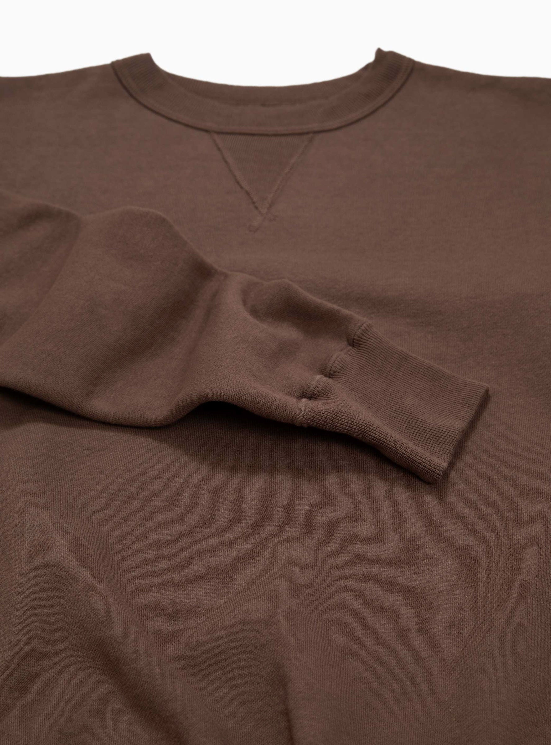 Made in Japan using one of the last two antique loopwheel knitting machines, which avoids the need for side seams and creates less tension on the fabric, this seal-brown Laniakea sweatshirt from Sunray Sportwear is cut to a classic, yet slightly boxy, silhouette with a crewneck and ribbed edges.