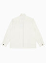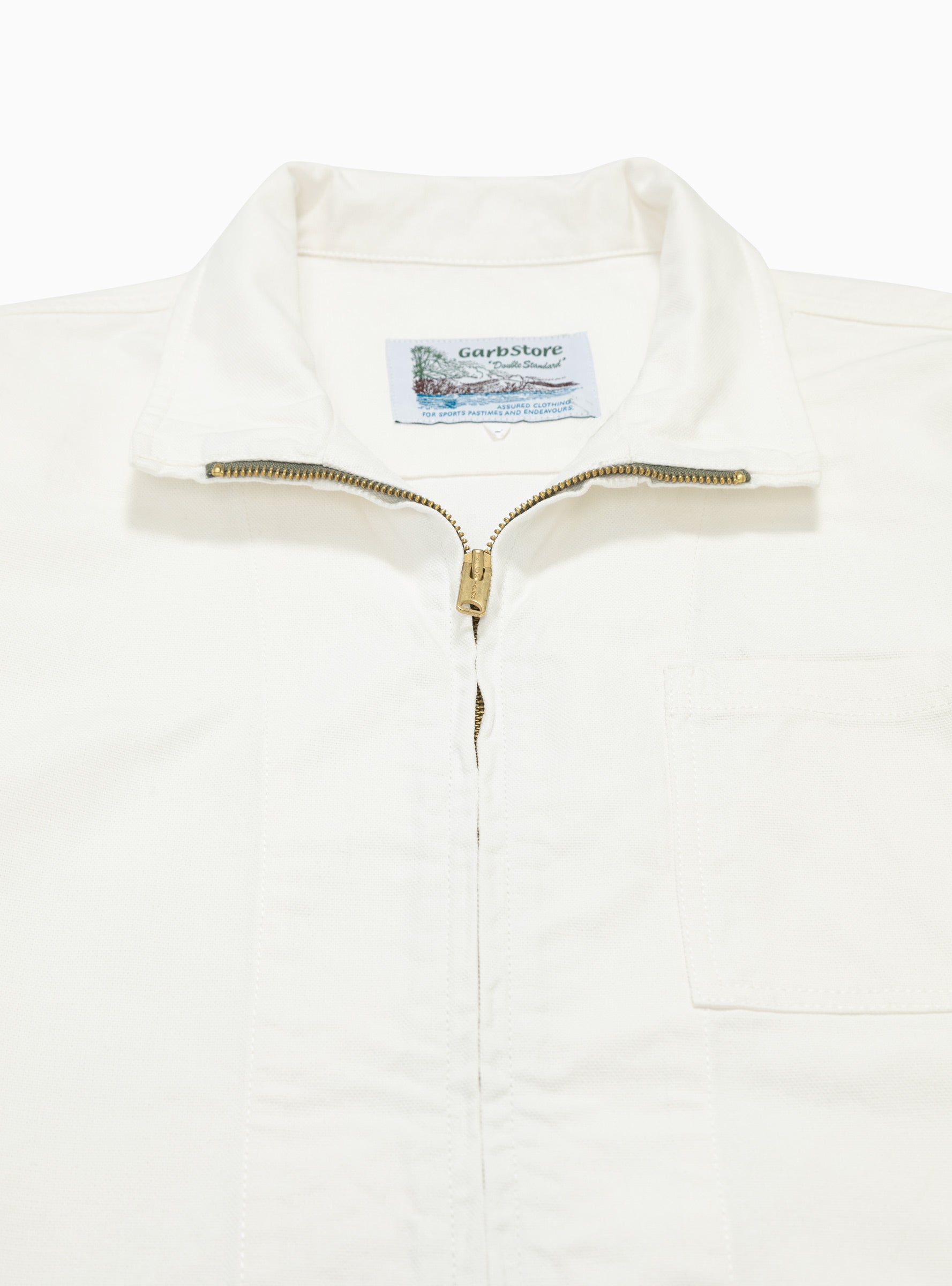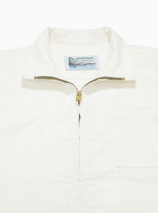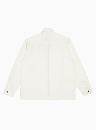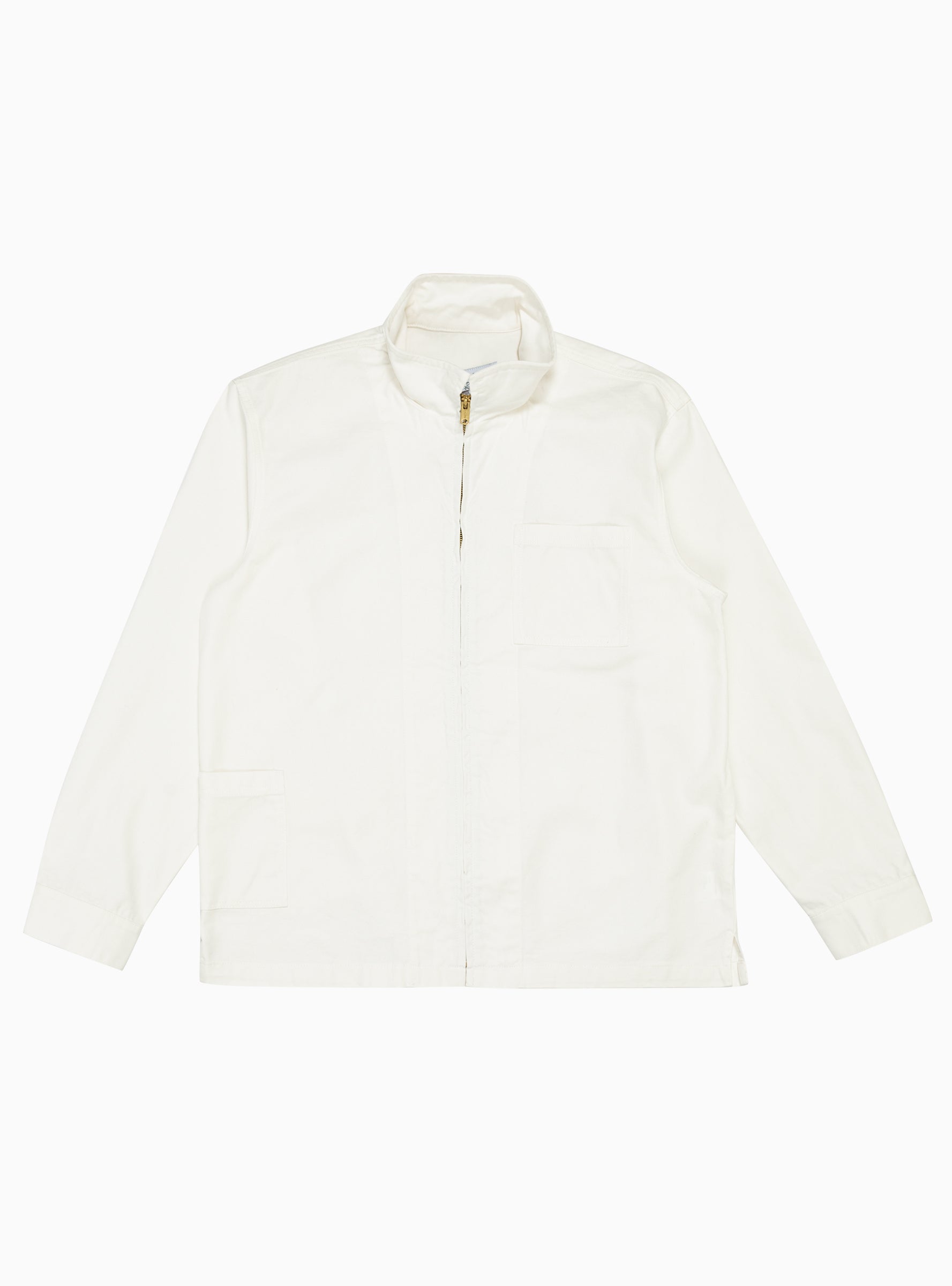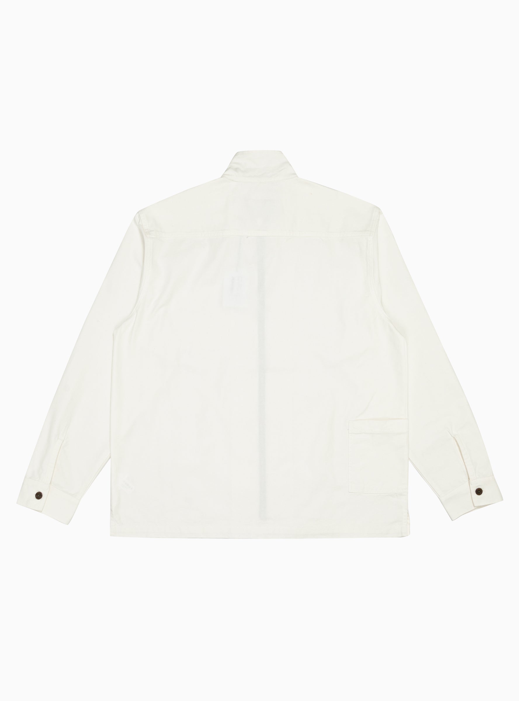 Made from structural cotton canvas, this white Lazy shirt from Garbstore’s SS23 collection is cut to a relaxed silhouette with large patch pockets, corozo nut button cuffs and a quarter-zip fastening.