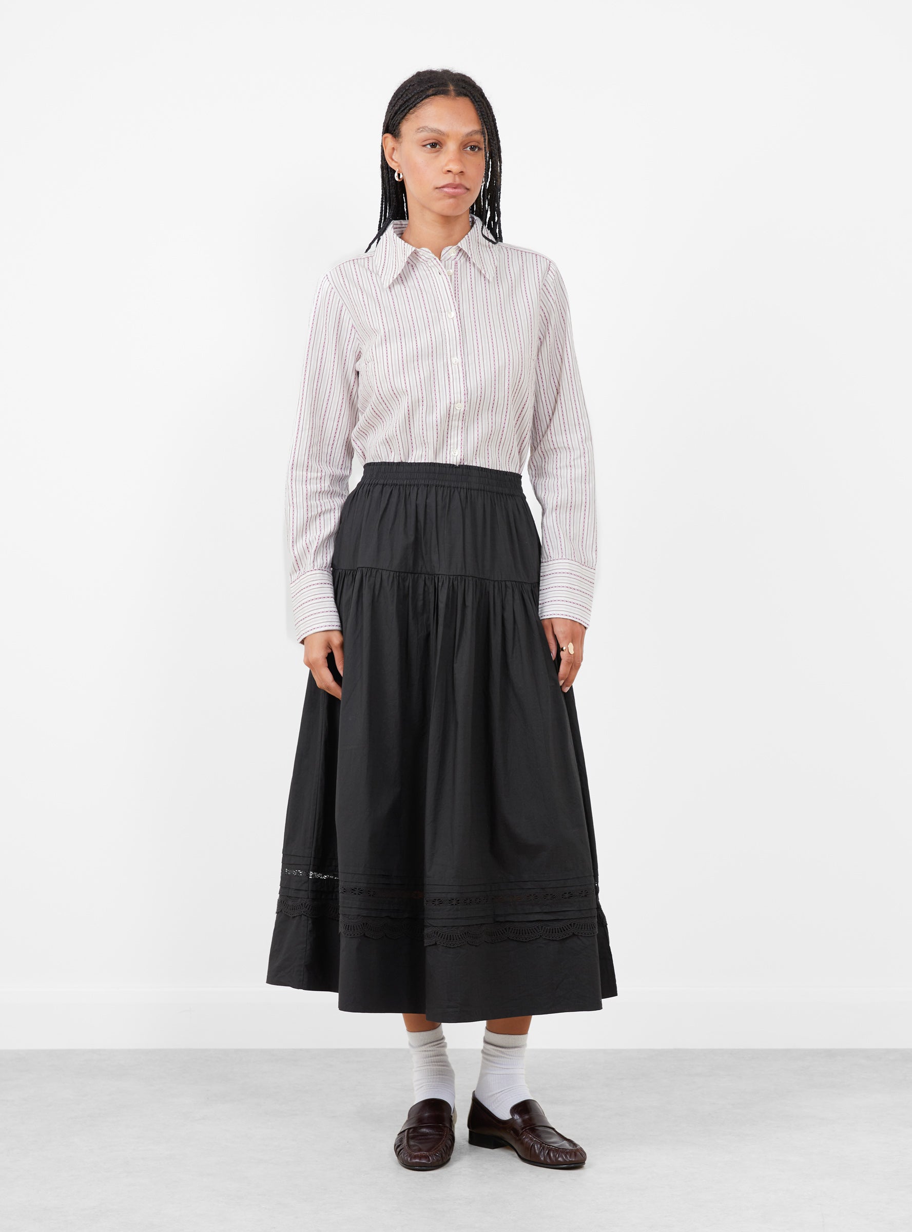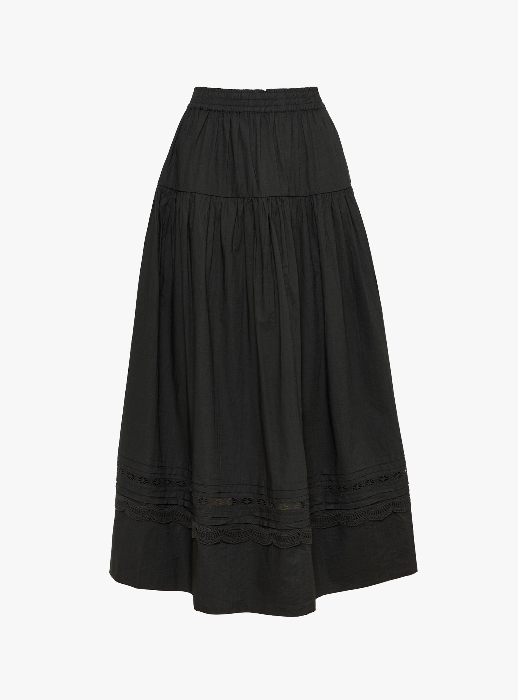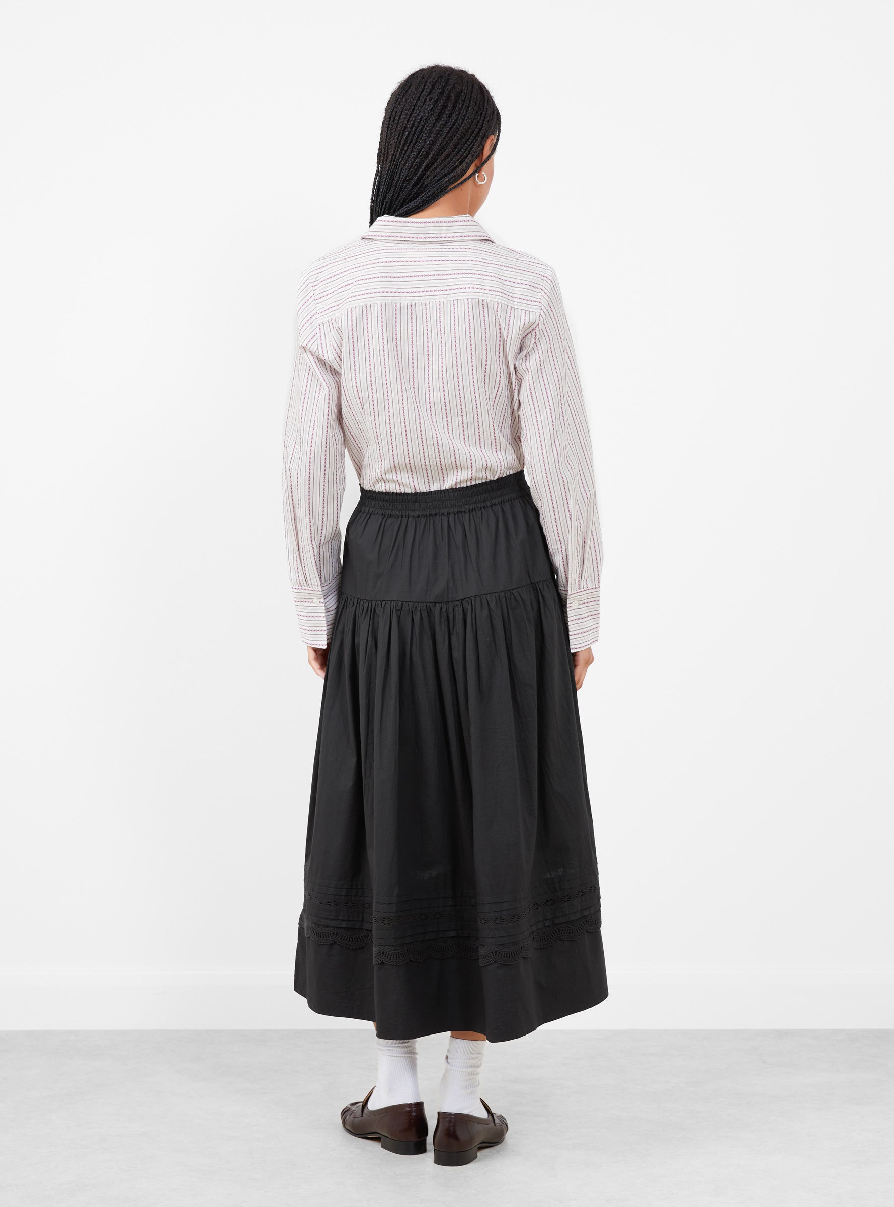 Made from organic cotton, this mid-calf skirt from Skall Studio flares gently from an elasticated waistband. Tiny pleats gathered into a hip-level seam add volume, while lace trim inserts above the hem provide subtle detailing.