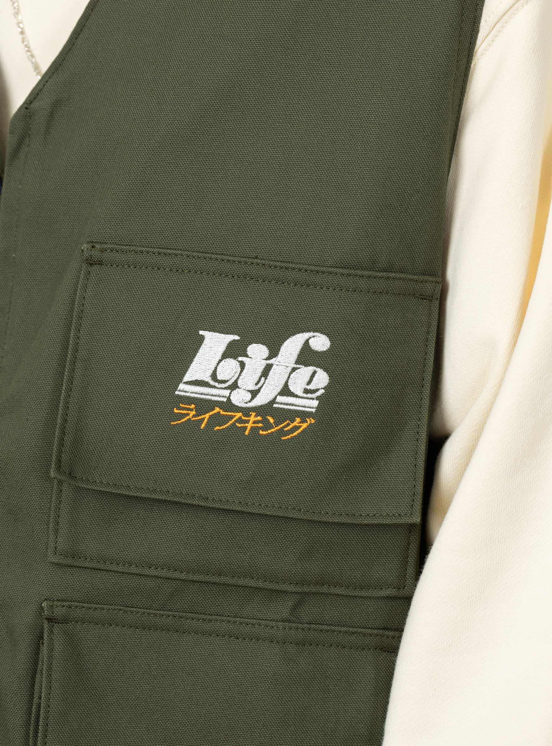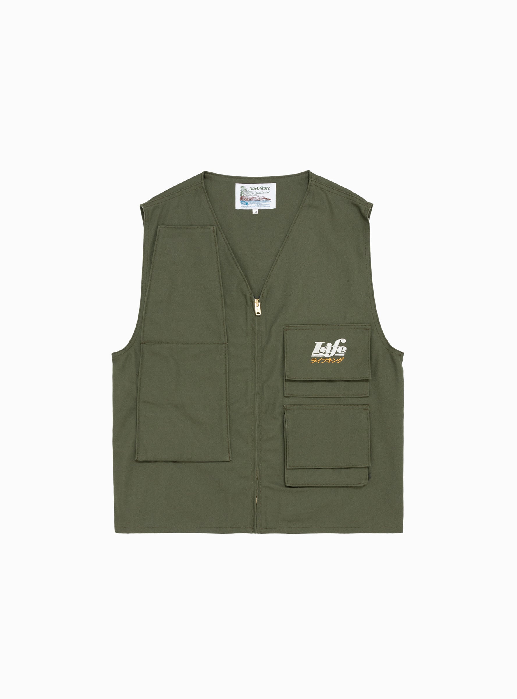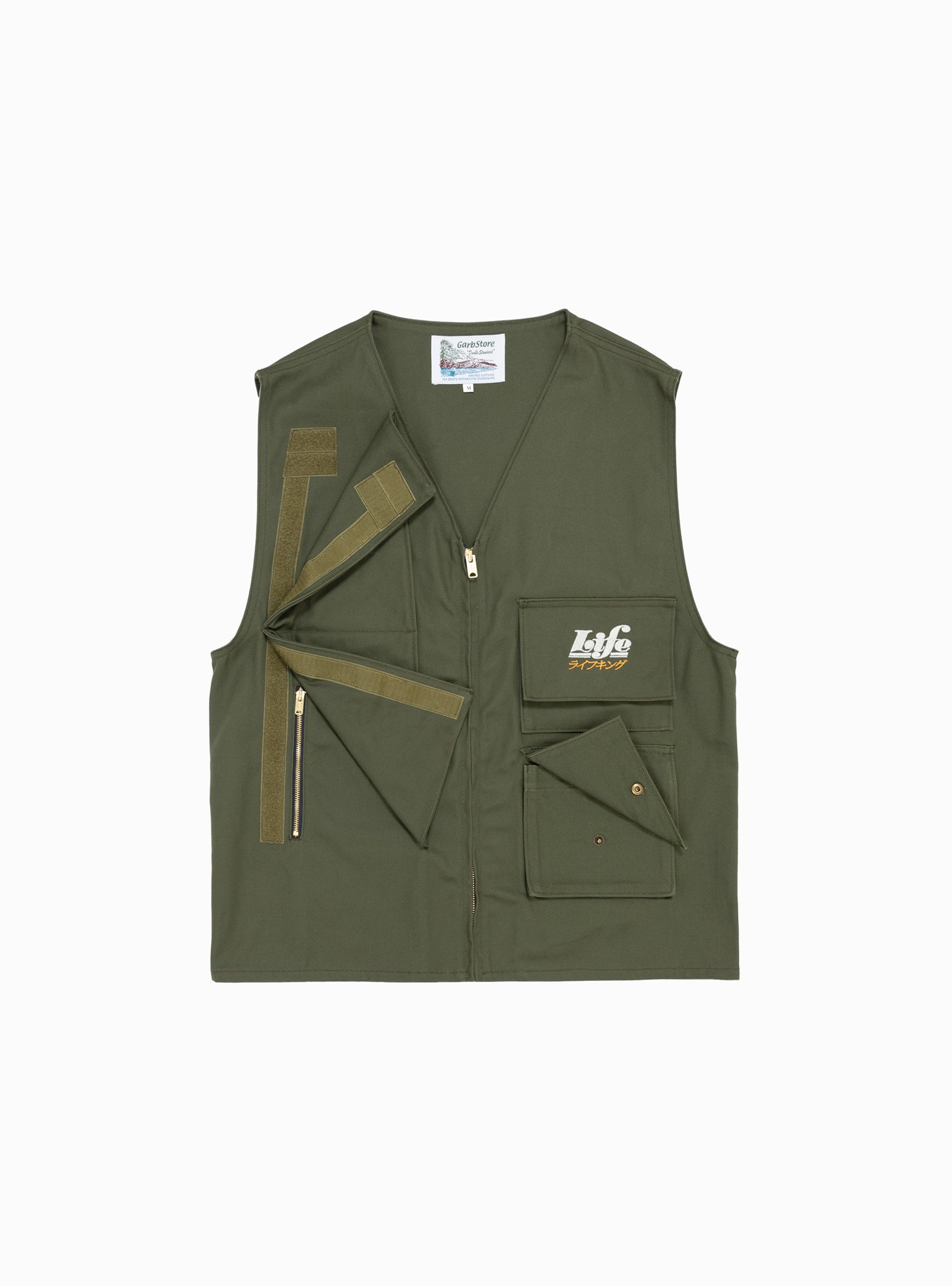 This olive Life vest from Garbstore's SS24 collection is made from sturdy cotton canvas sourced from Osaka, Japan. Cut to a relaxed, boxy silhouette, it features an assortment of zip and press-stud pockets, some of which are concealed behind Velcro panels. The season's motif is embroidered at the chest.