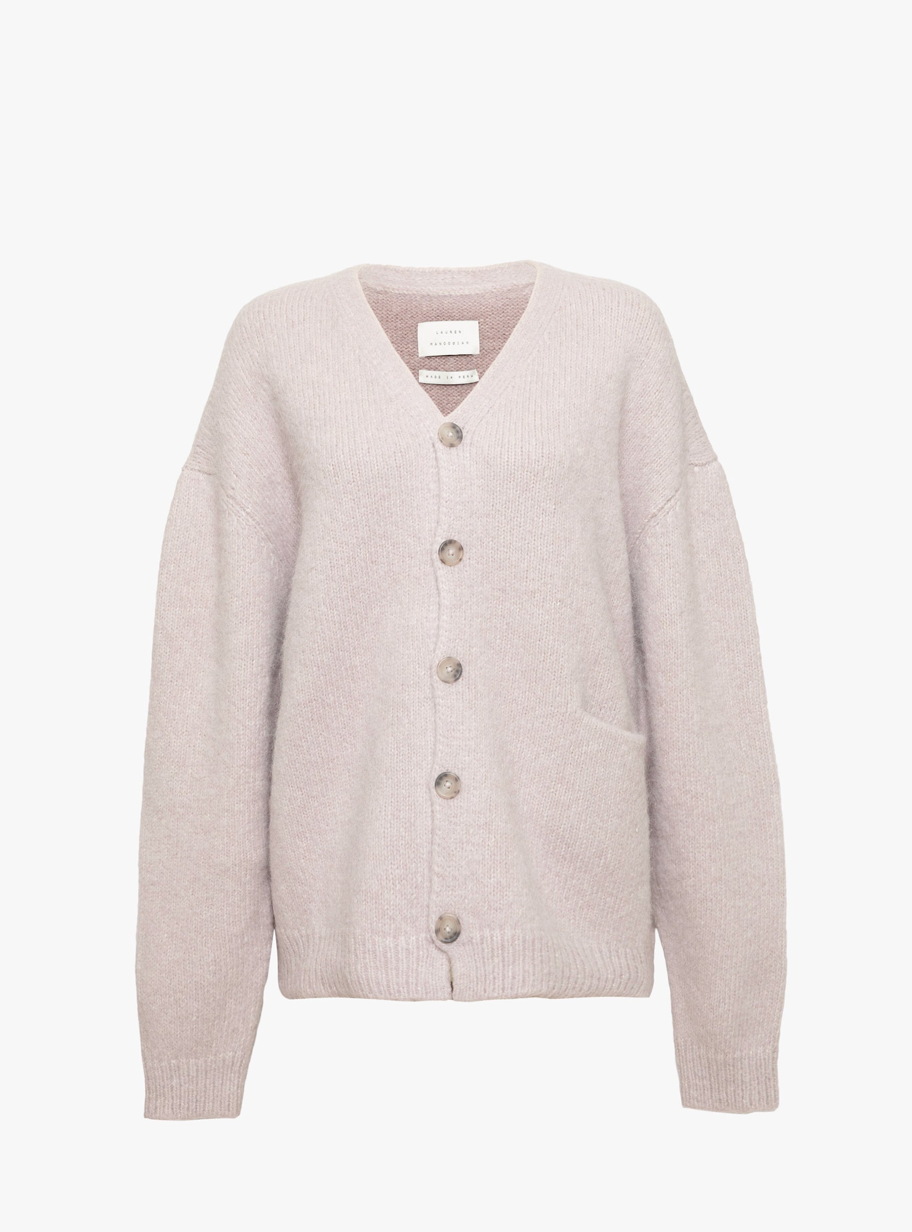 The Loft Cardigan Lavender from Lauren Manoogian is handloomed in Peru from a soft blend of alpaca, cotton, and wool. Designed with a plush, fuzzy hand feel, it features a ribbed neck and cuffs, integral front pockets, and a simple button closure for easy layering.