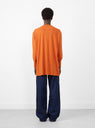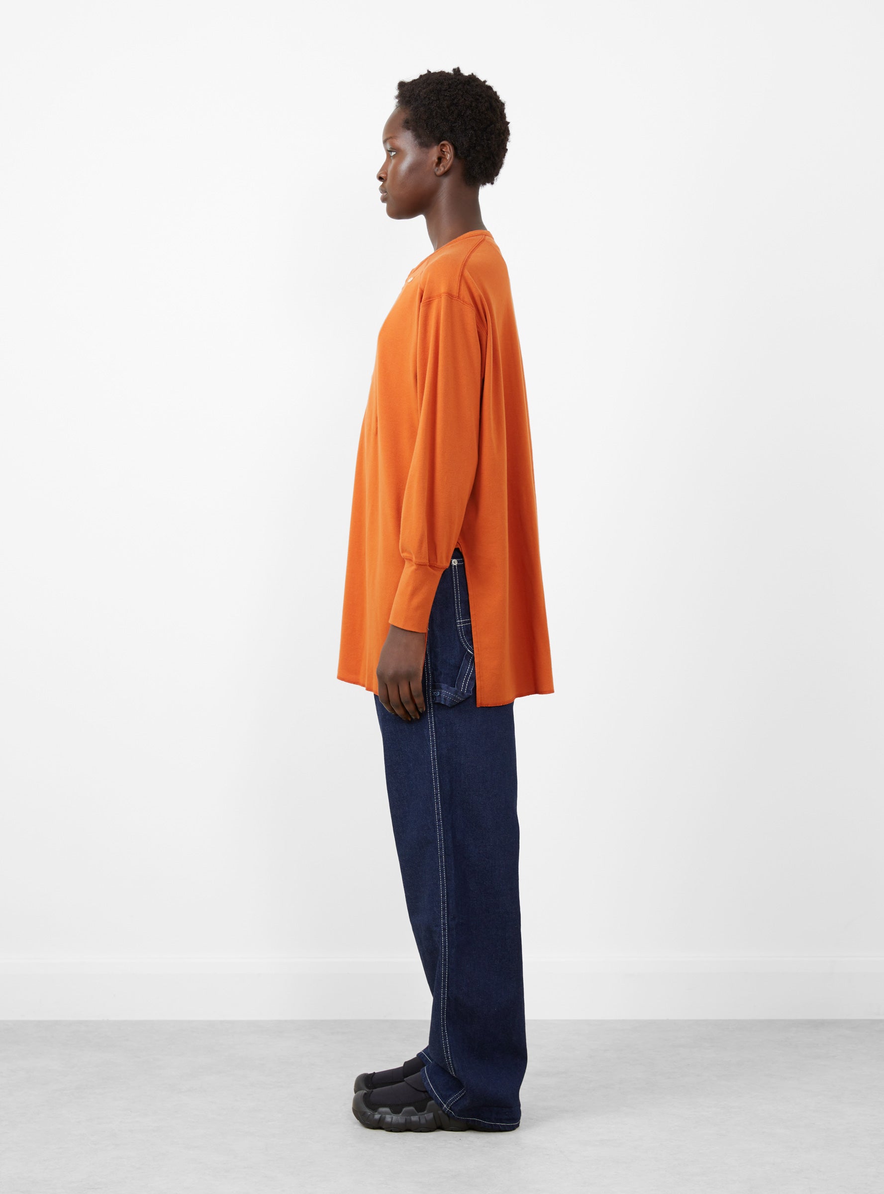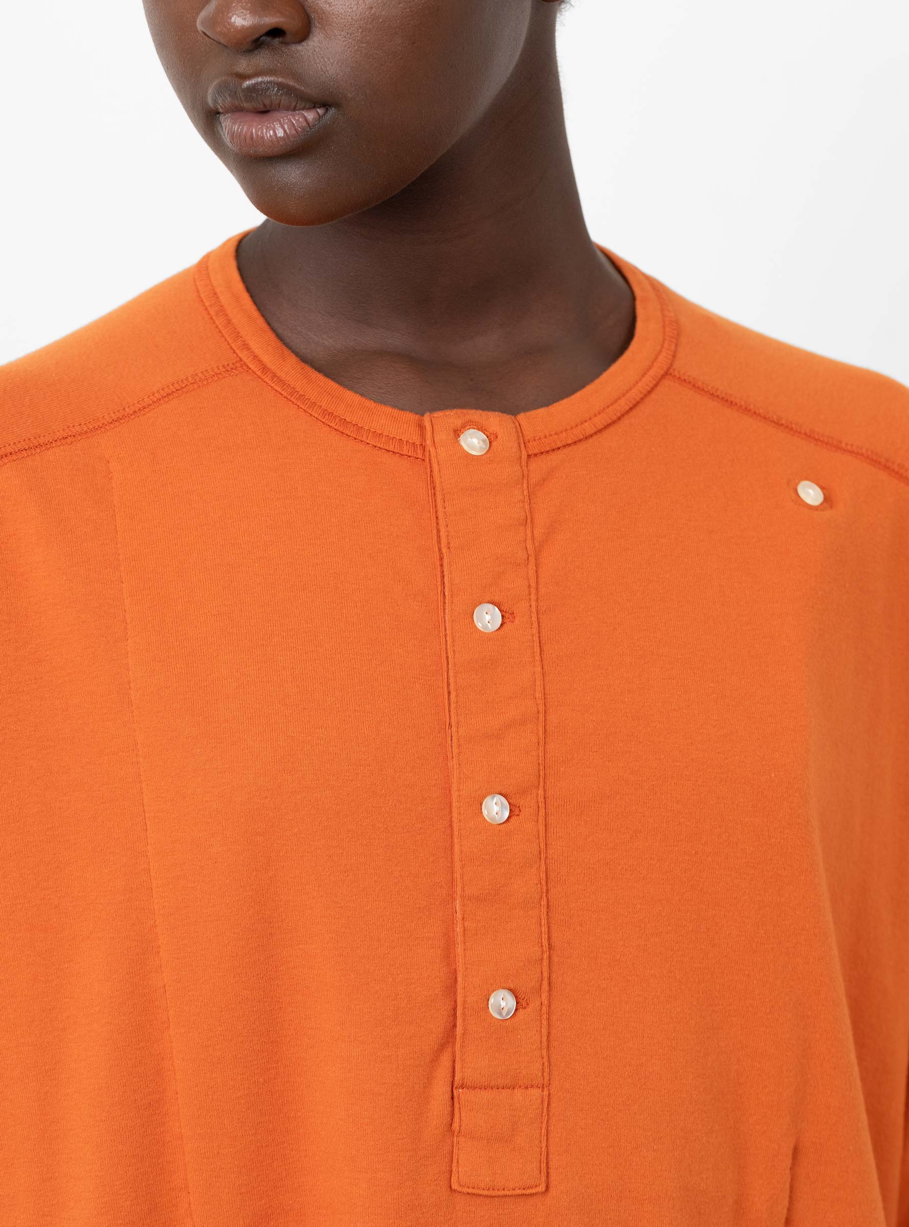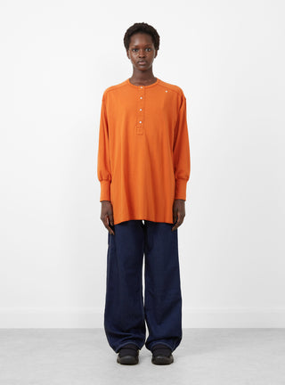 The Long Sleeve Ribbed Top from BEAMS BOY comes in a vibrant orange. Made in Japan, the top falls to an oversized fit with a long scoop hem. The henley-style top features a button placket as well as an extra button at the shoulder. Visible stitch seams and oversized cuffs finish the top and add texture.