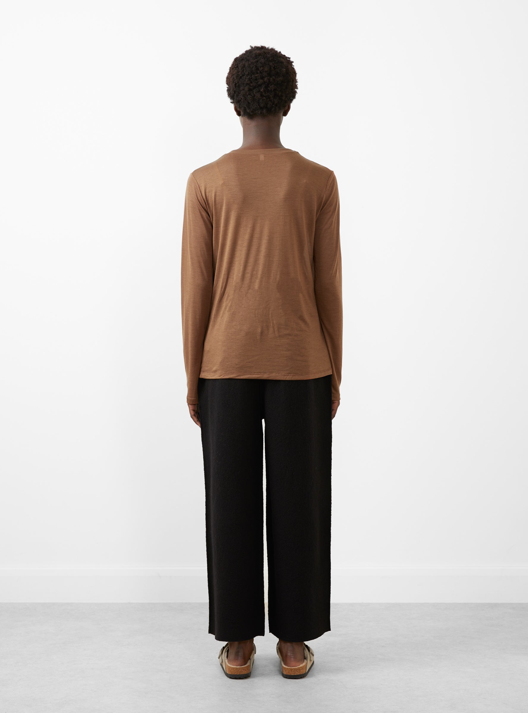 The Long Sleeve Tee from Baserange arrives in an ocular brown. Made in Portugal from an ultra-soft Bamboo Lyocell, the sheer fabric tee falls to a regular fit.
