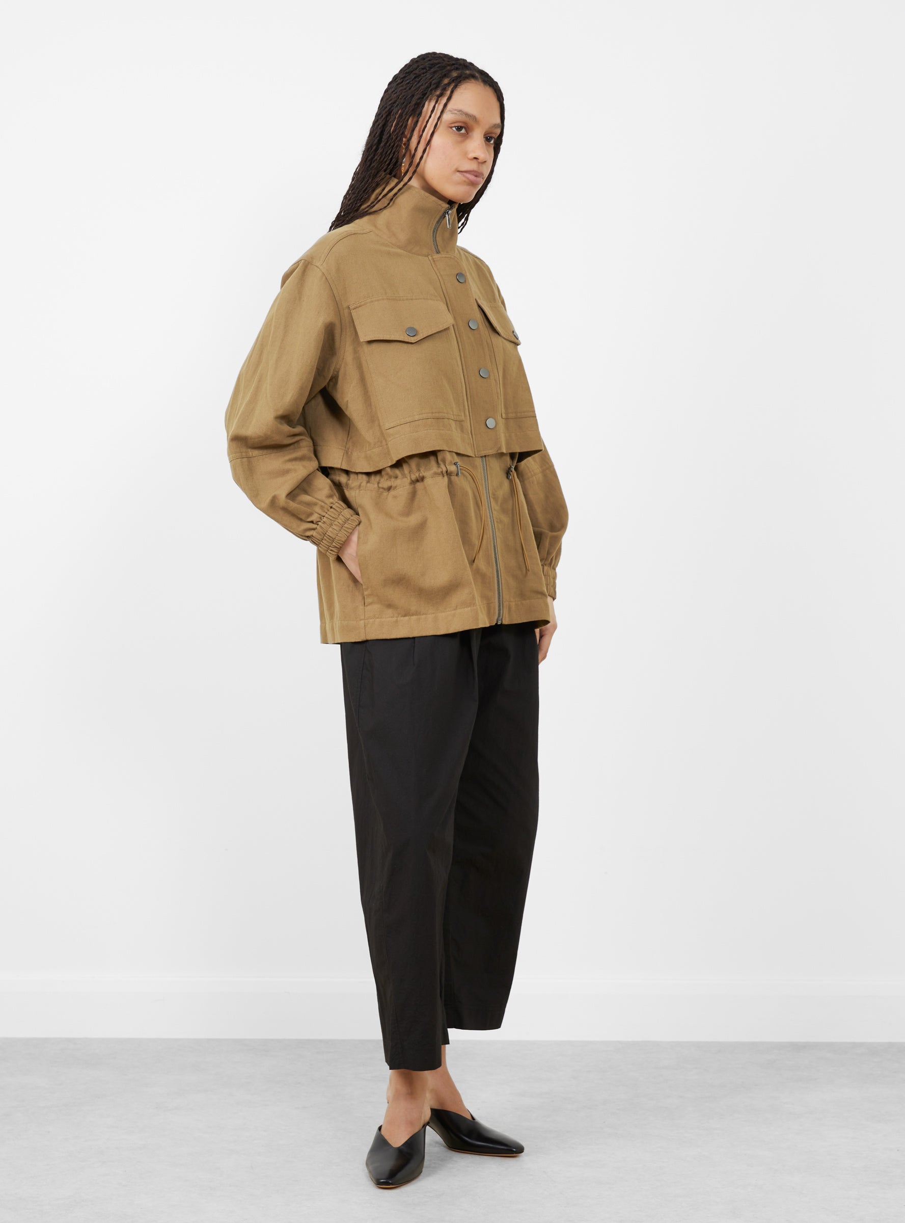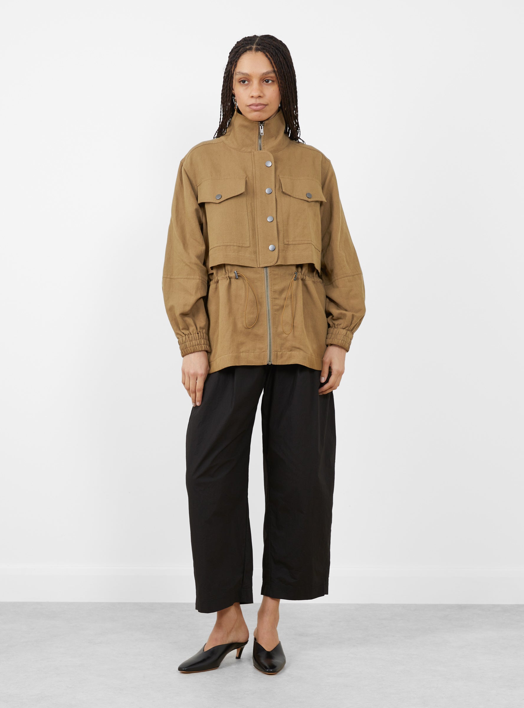 The Long Sleva Jacket comes in Tobacco from Apiece Apart and is cut from an organic cotton and linen blend. Designed with a true-to-size fit, it features a funnel neck, zip and snap front closure, and large chest patch pockets with flap snaps. Elasticated cuffs and adjustable drawstrings at the waist and hem allow for a customizable silhouette.