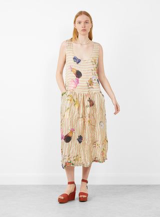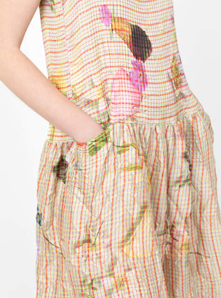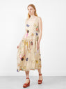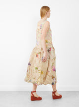 The Luna Pleated Dress by Julia Heuer is a relaxed-fit, drop-waist sleeveless design featuring a flounced skirt and hidden pockets. This design combines two-step pleating and a crushing technique, offering a special texture on the floral-patterned satin.