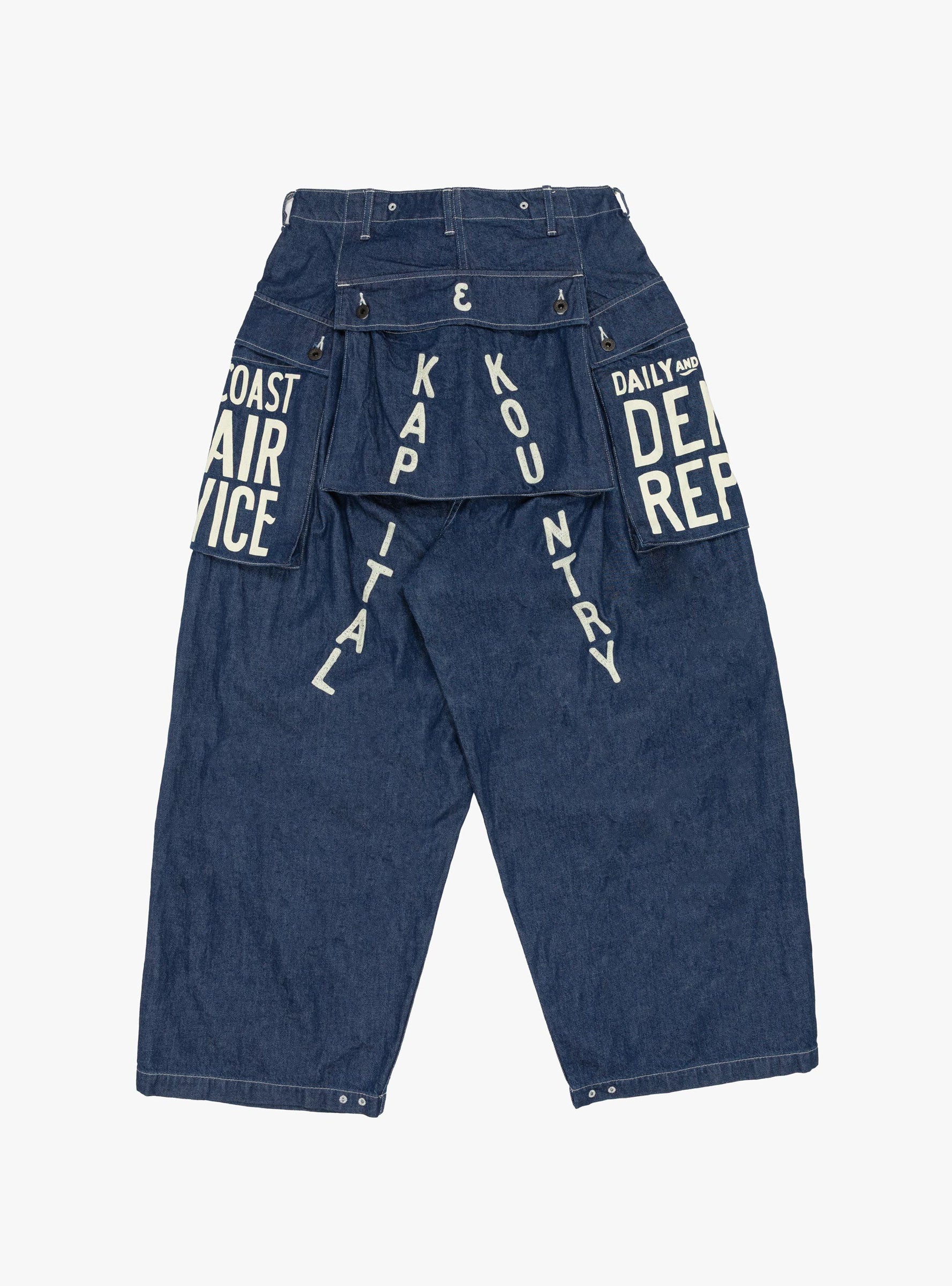 The 11.5oz Denim Jumbo Monkey Pants from Kapital come in indigo and are made from Japanese cotton denim. Designed with an oversized fit, they feature cargo pockets at the hips and sides, suspender holes at the front and back, and a button fly. The pants are accented with prints on both sides and embroidery at the hips for subtle detailing.