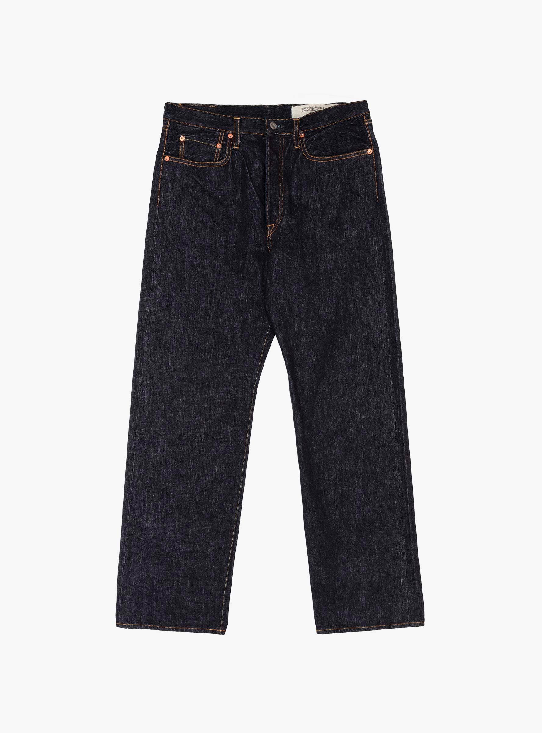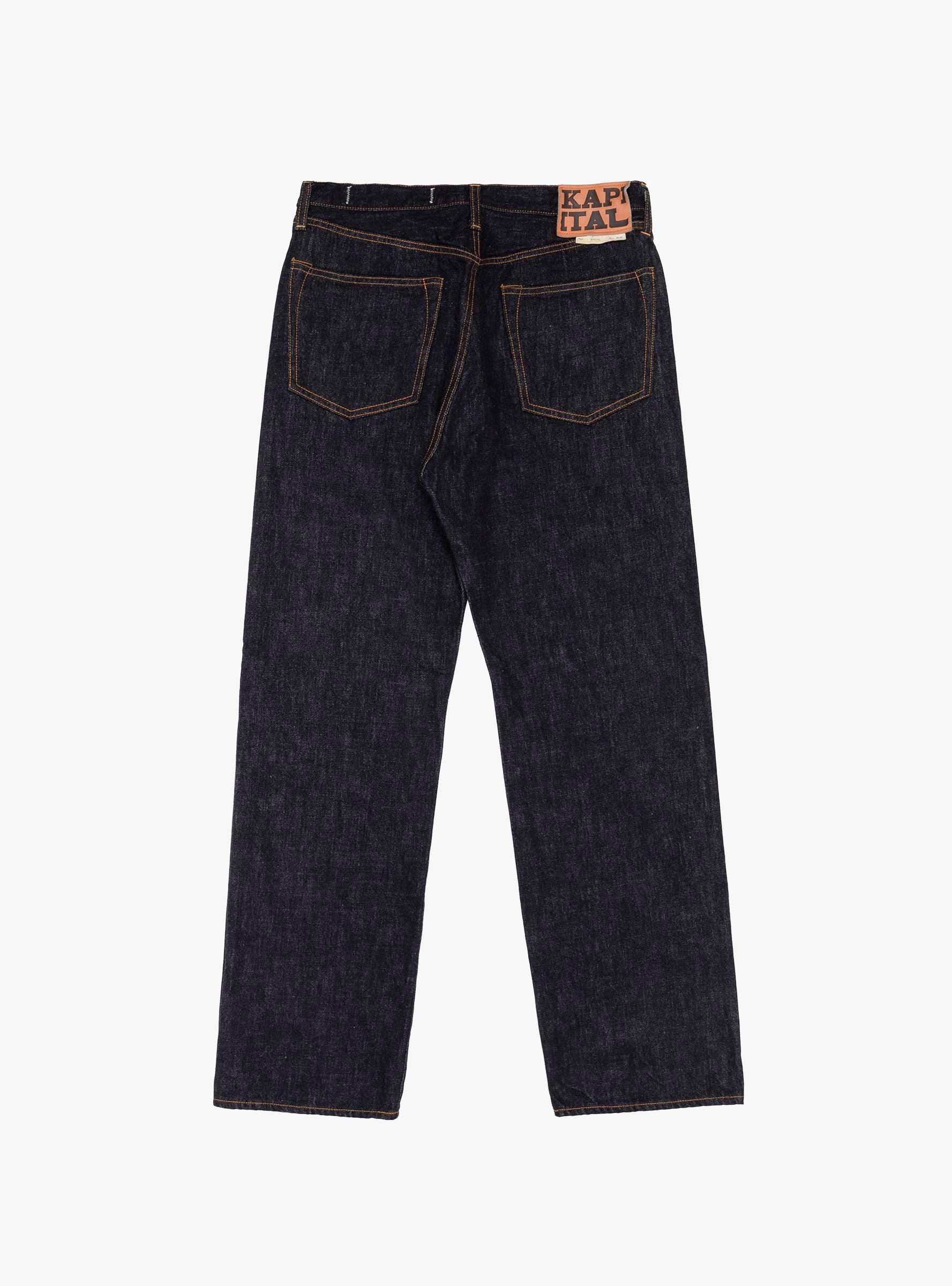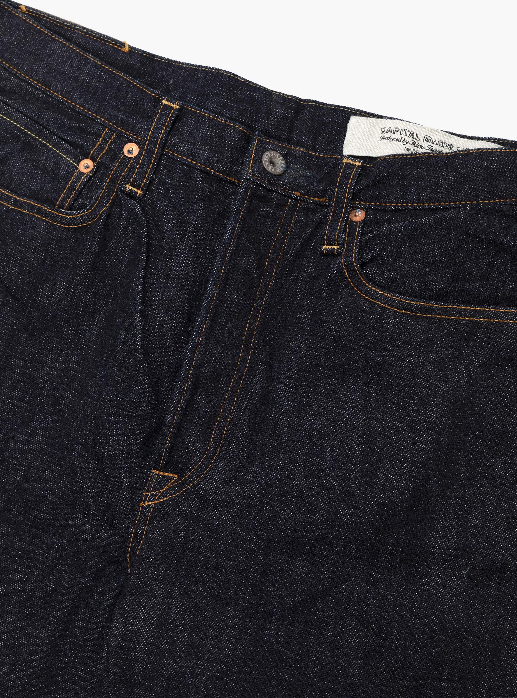 Kapital's 14oz Denim 5P Monkey Cisco jeans feature a One Wash treatment, a zip-and-button closure, a 5-pocket design, and minimal branding.
