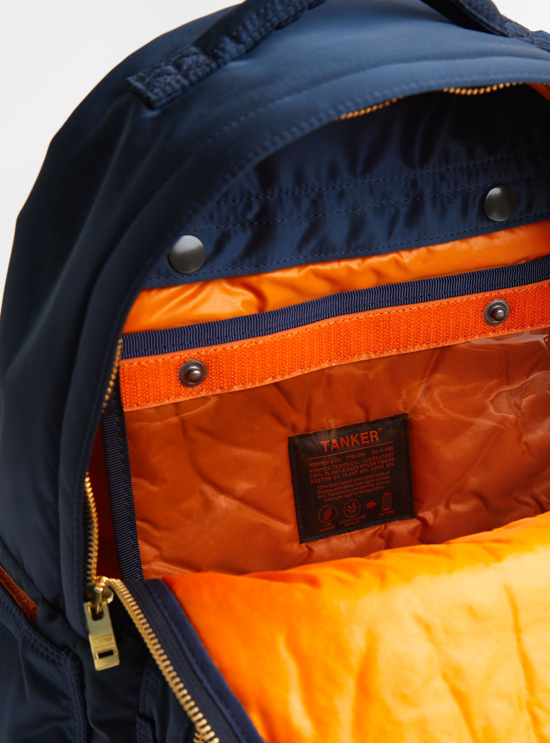 The Bio-Nylon TANKER Daypack from Porter Yoshida & Co. arrives in Navy. Made in Japan from a revolutionary plant-based nylon derived from corn and castor oil, it features two zip compartments at the front, additional side pockets for smaller items, and adjustable shoulder straps.