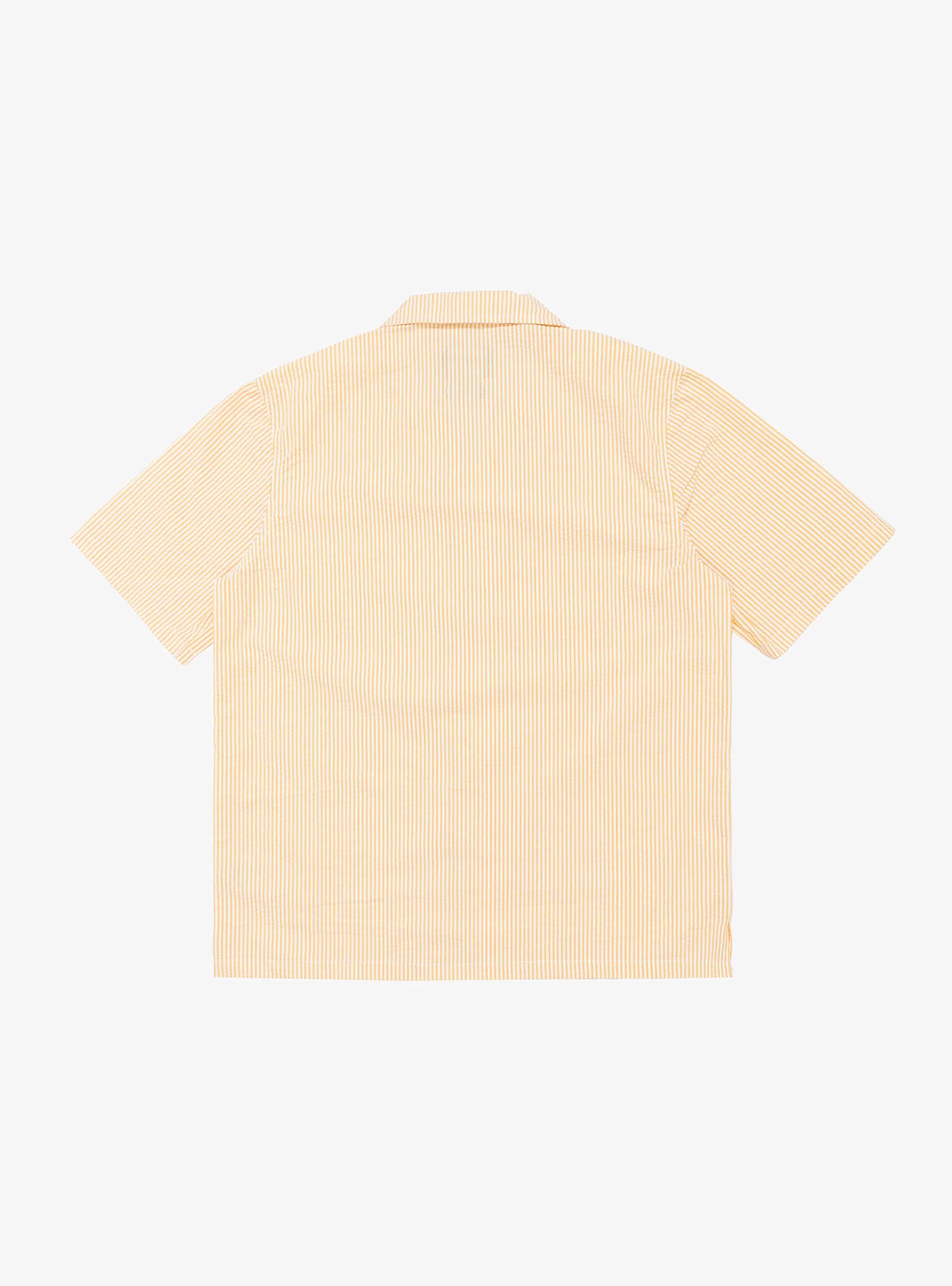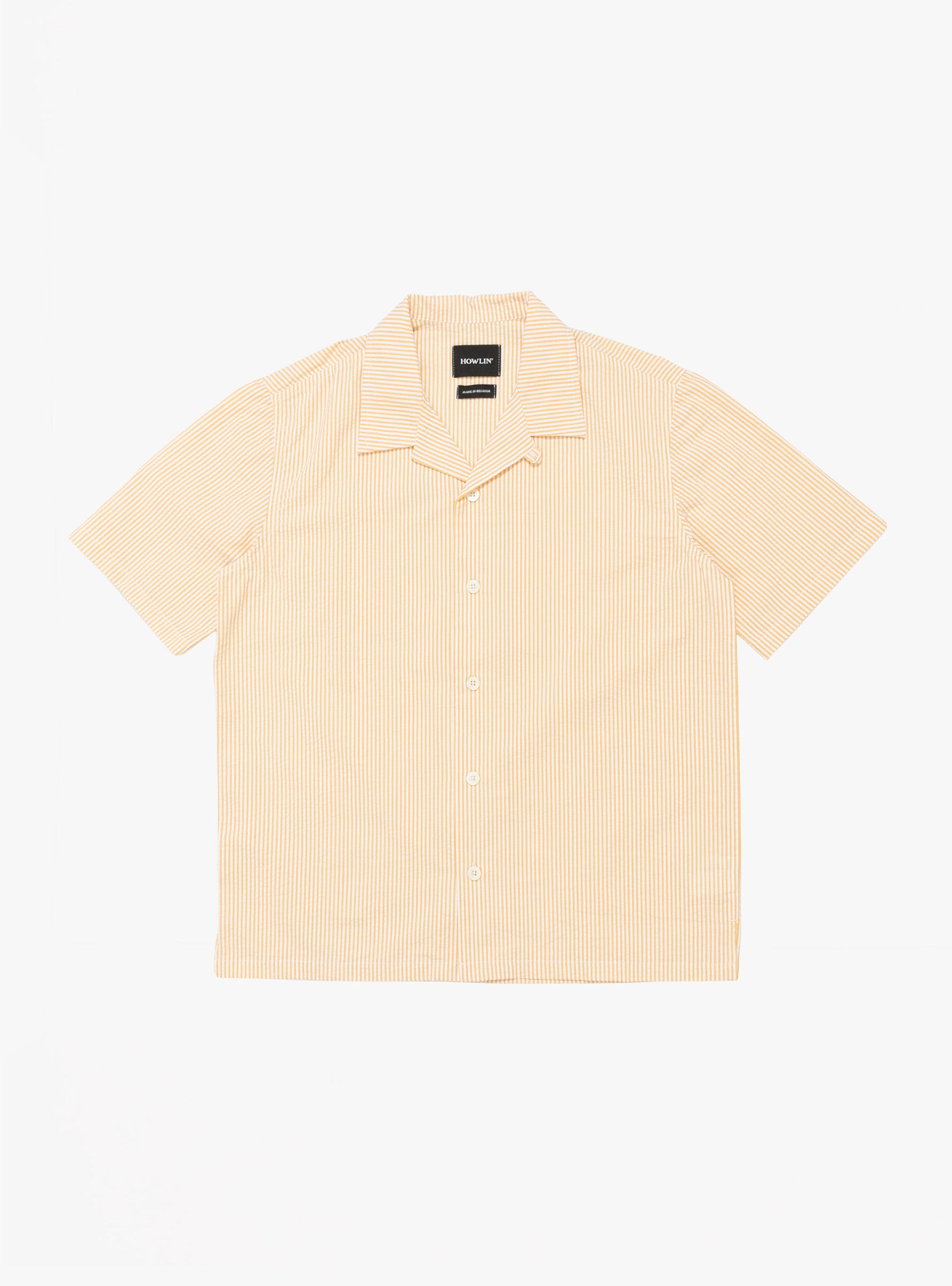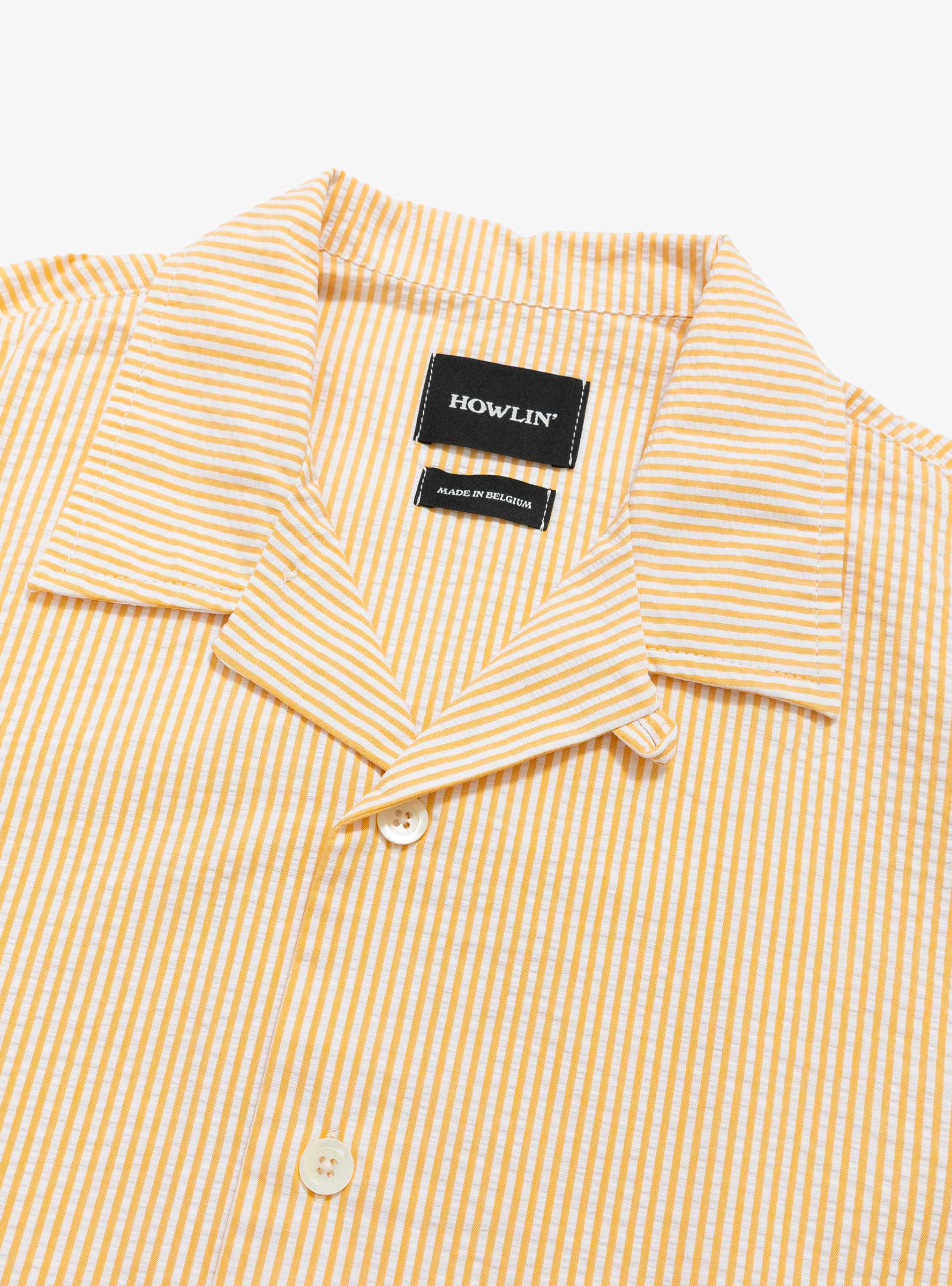 The Cocktail D'Amore Shirt from Howlin' comes in Butter In The Sun and is made in Belgium from cotton seersucker. Cut to a relaxed fit with wider sleeves, it features a lightweight feel with mid-weight structure and a breathable puckered texture suited to warm weather. Custom natural mother-of-pearl buttons run down the front, completing the design.